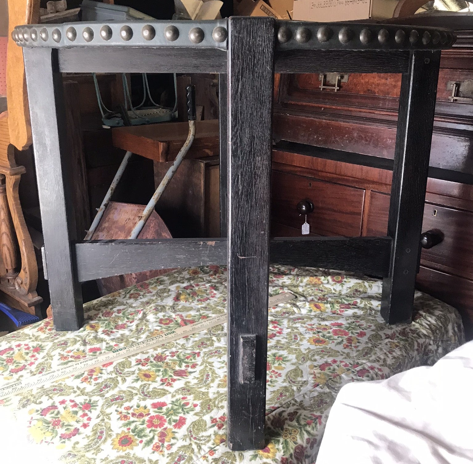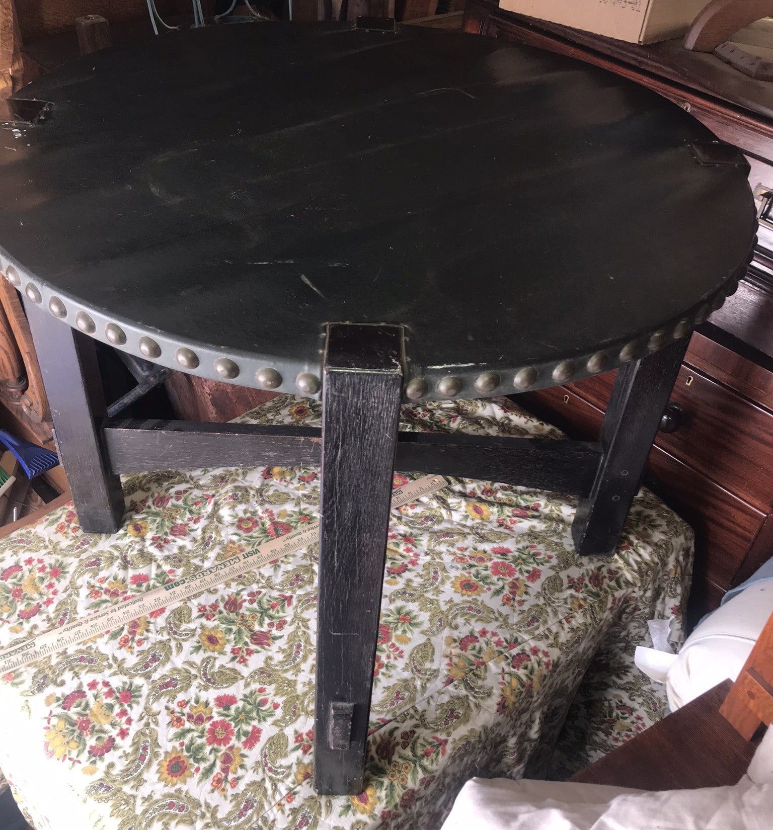 EARLY 1900's ARTS AND CRAFTS DARK FUMED OAK ROUND TABLE WITH LEATHER TOP. CALL, TEXT, OR E-MAIL FOR MORE INFORMATION