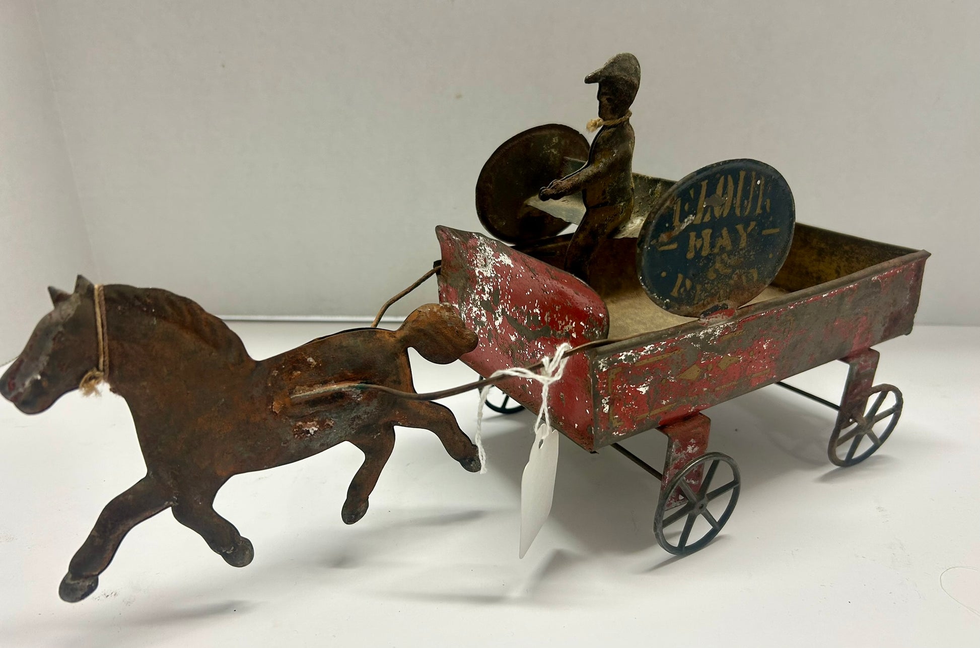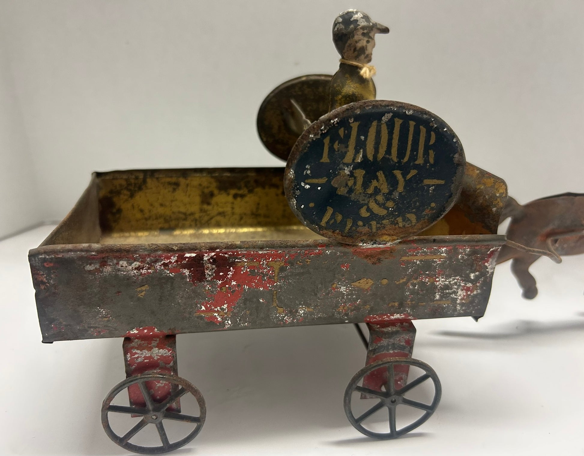 EARLY AMERICAN TIN TOY FLOUR, HAY, & FEED, HORSE DRAWN DELIVERY WAGON