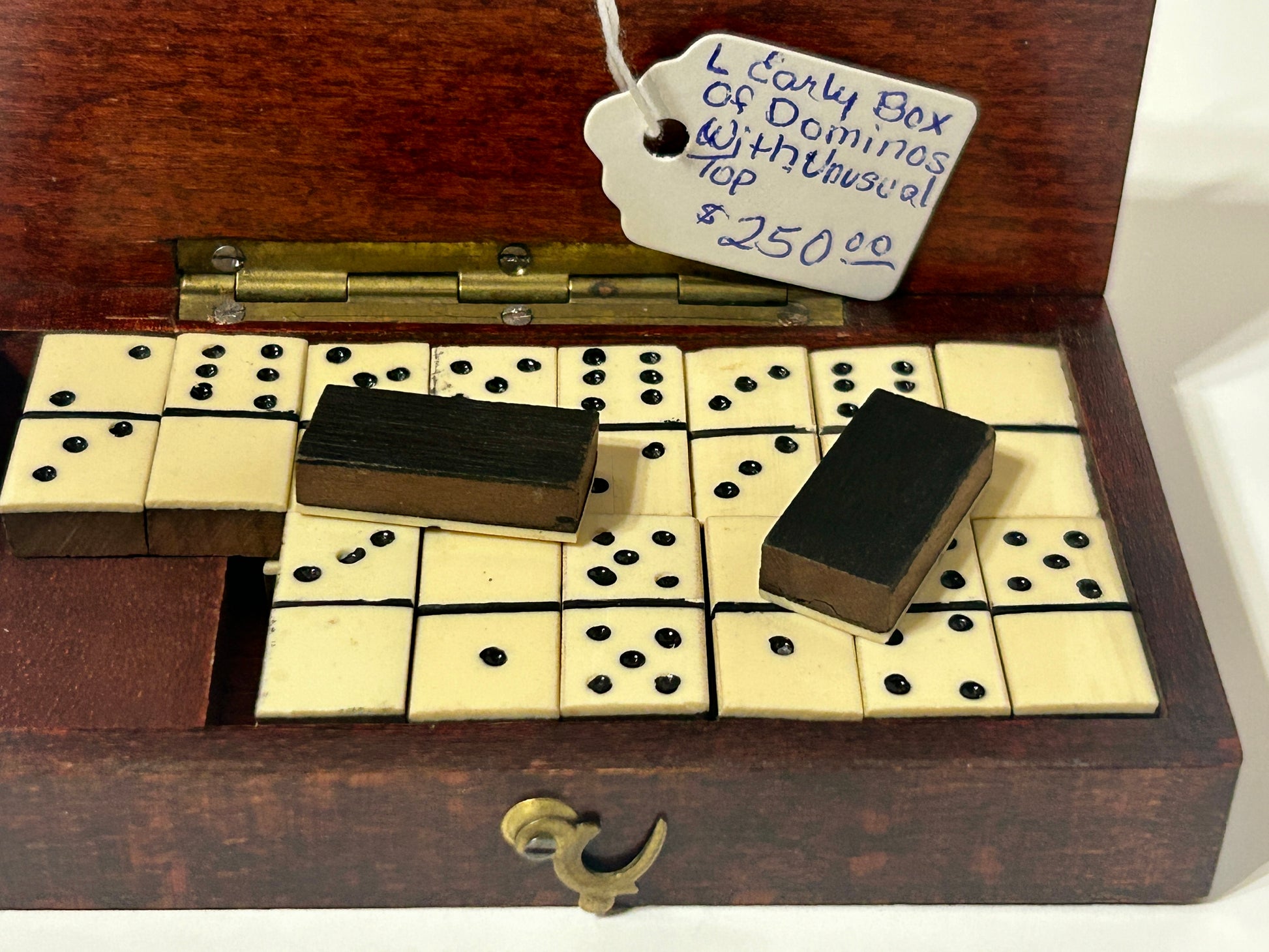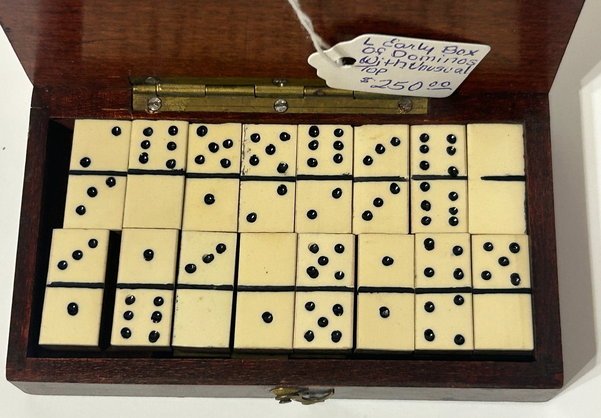 EARLY BOX OF DOMINOS WITH DOMINO DESIGN LID BOX