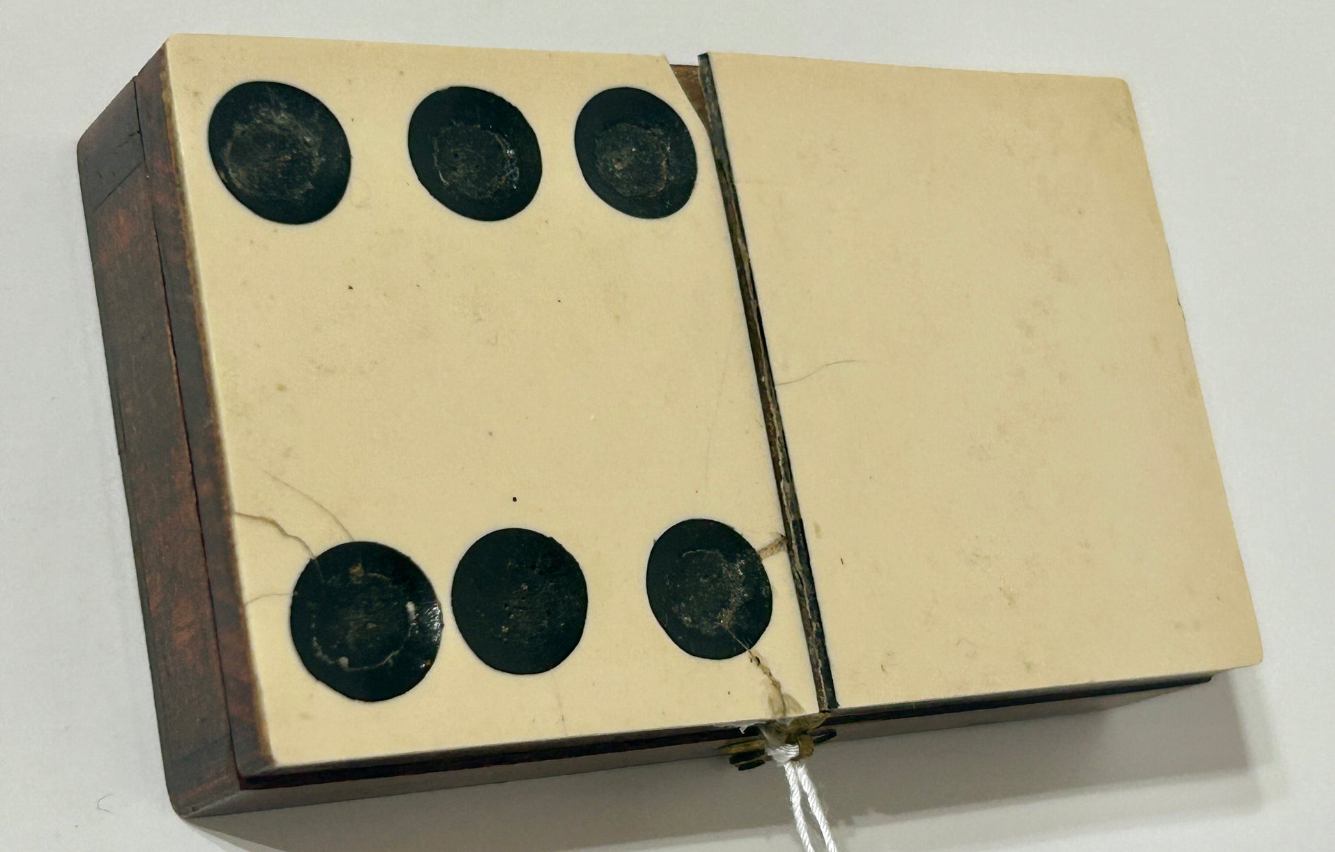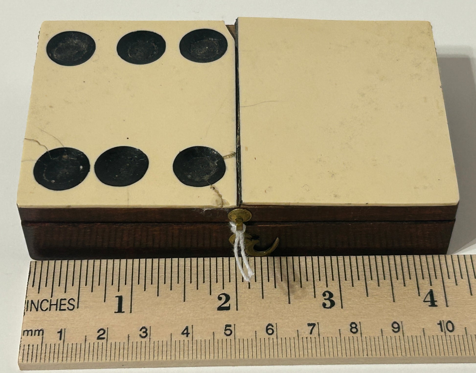 EARLY BOX OF DOMINOS WITH UNUSUAL DOMINO SHAPE BOX WITH SOME DAMAGE 4 1/4" LONG X 2 1/2" WIDE. CALL OR TEXT FOR MORE INFORMATION