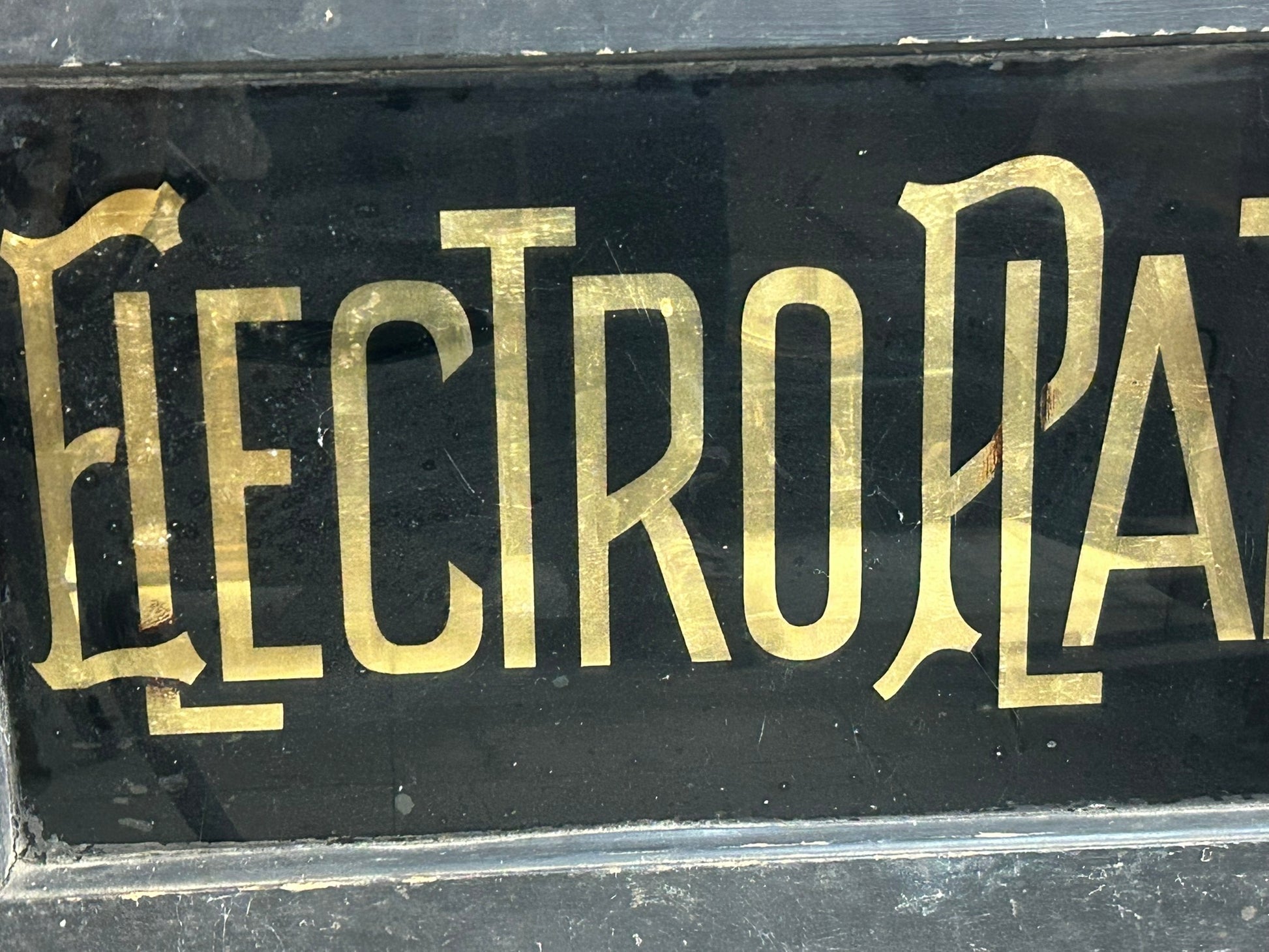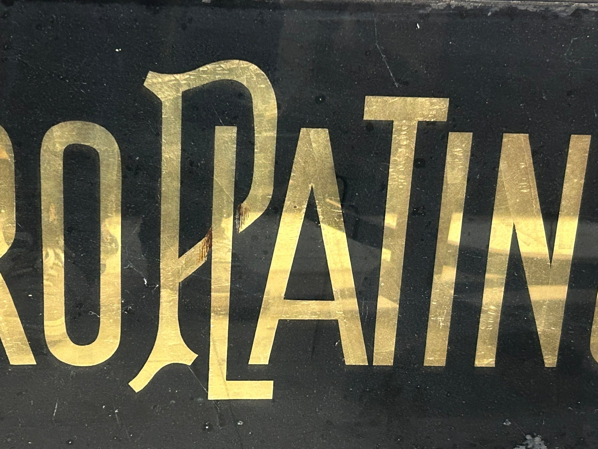 ELECTRO PLATING GILT REVERSE ON GLASS ANTIQUE SIGN 18" X 31". CALL OR TEXT FOR MOR INFORMATION