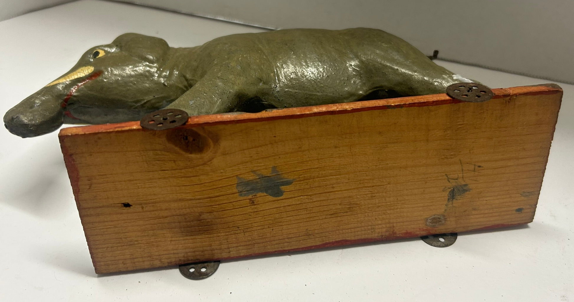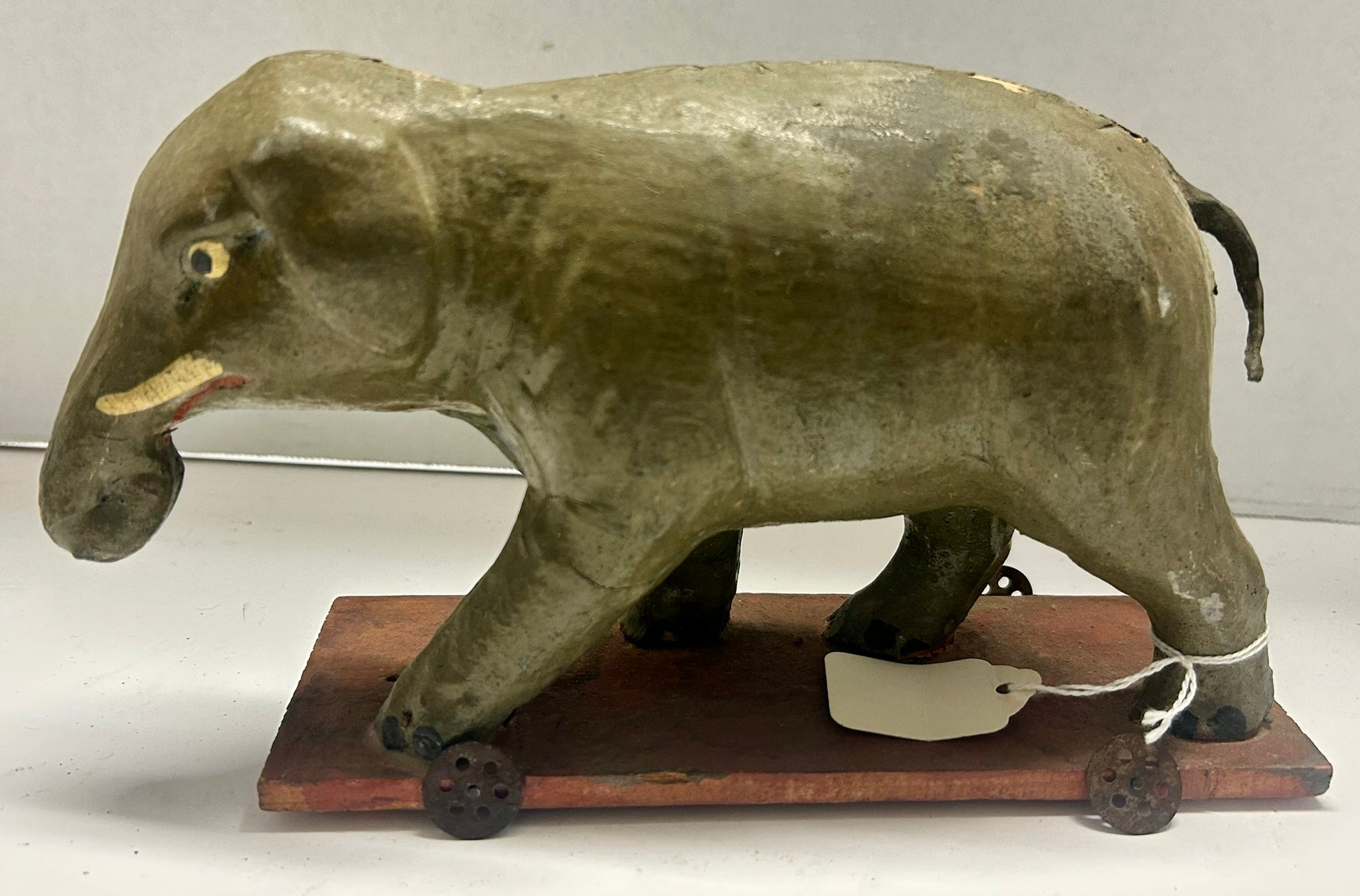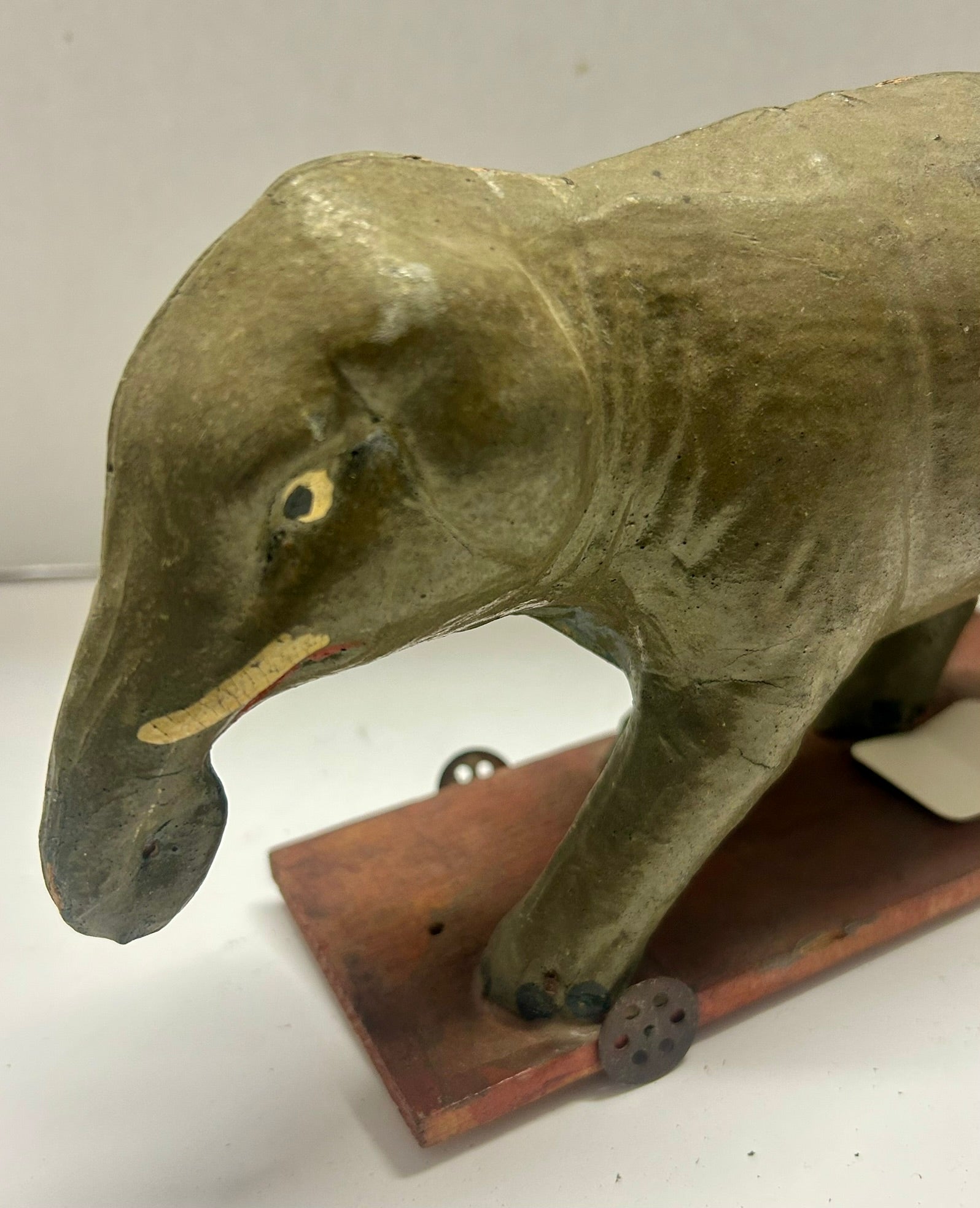 ELEPHANT ANTIQUE PULL TOY, PAPER MACHE AND WOOD 9 1/2" LONG. CALL OR TEXT FOR MORE INFORMATION