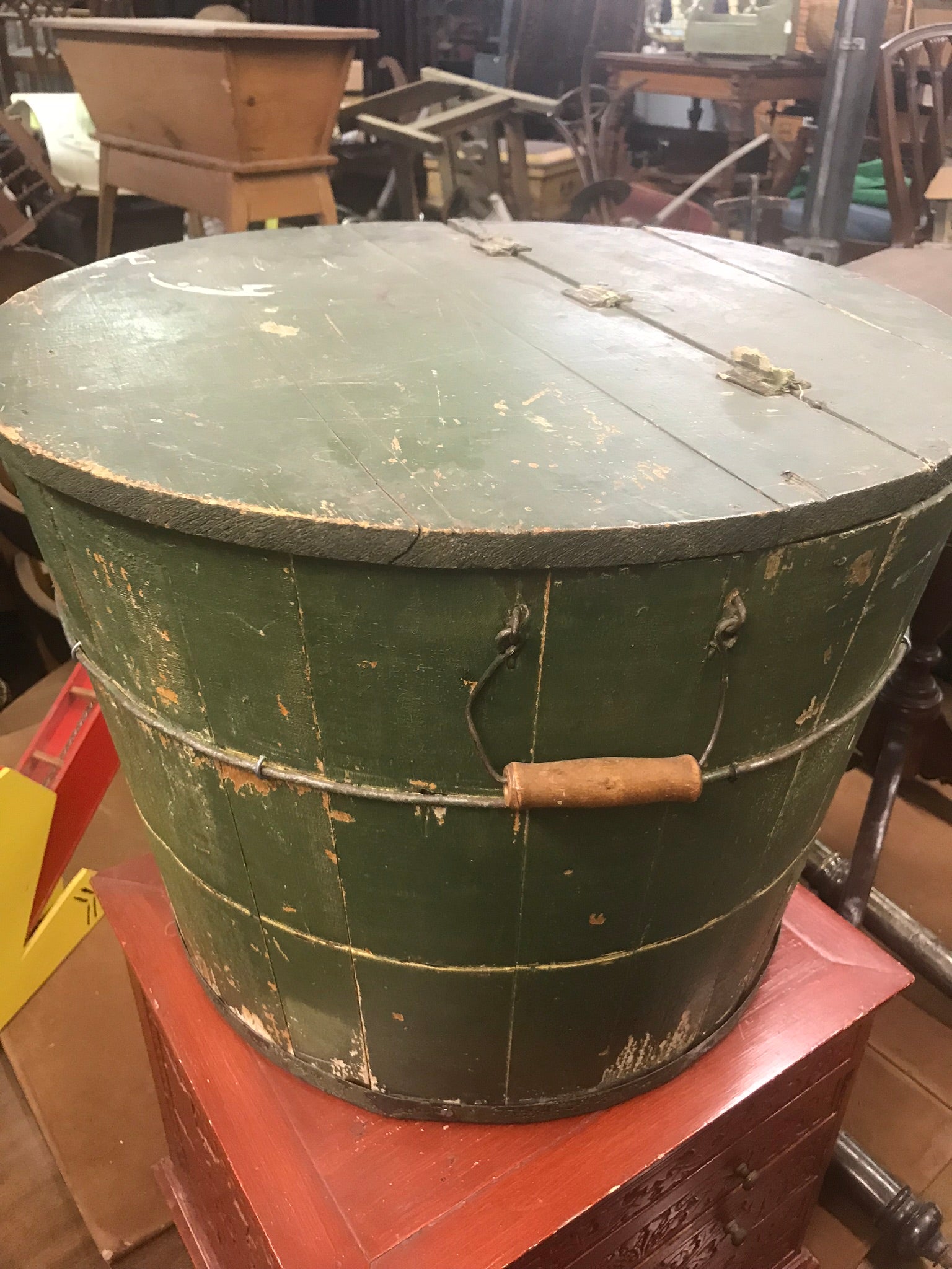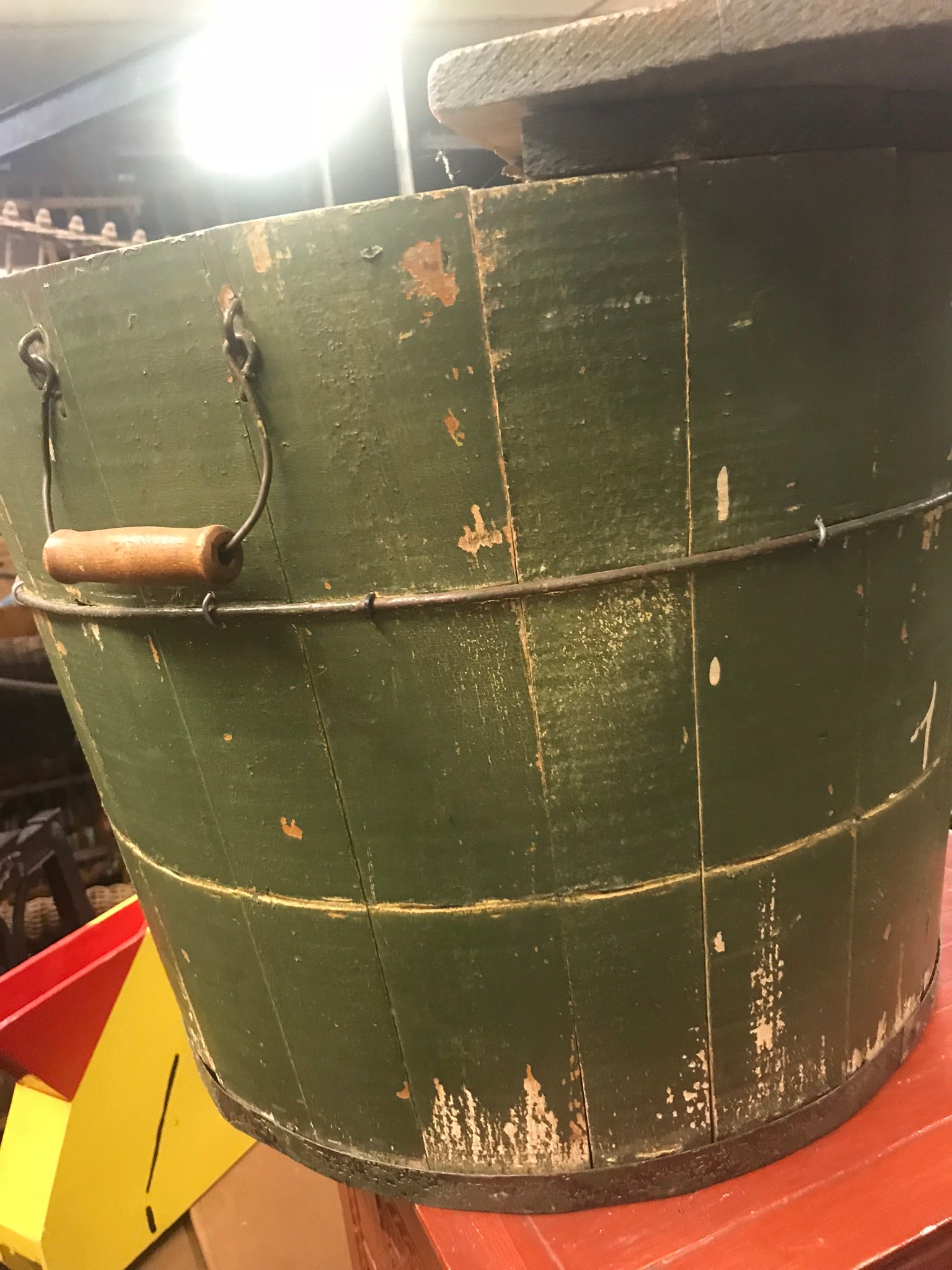 ELEPHANT BLEND COFFEE ANTIQUE GREEN PAINTED WOOD PAIL STORE DISPLAY