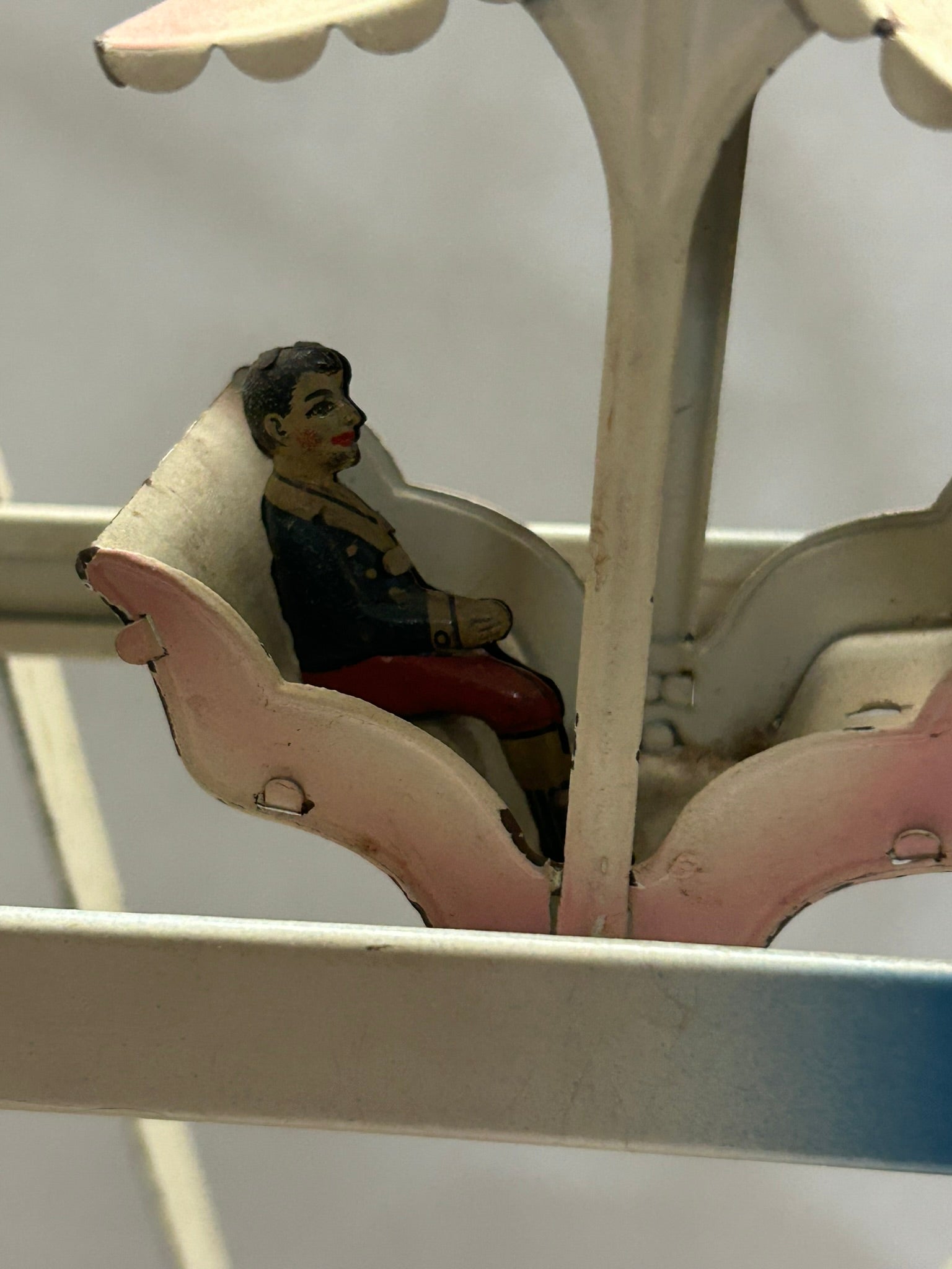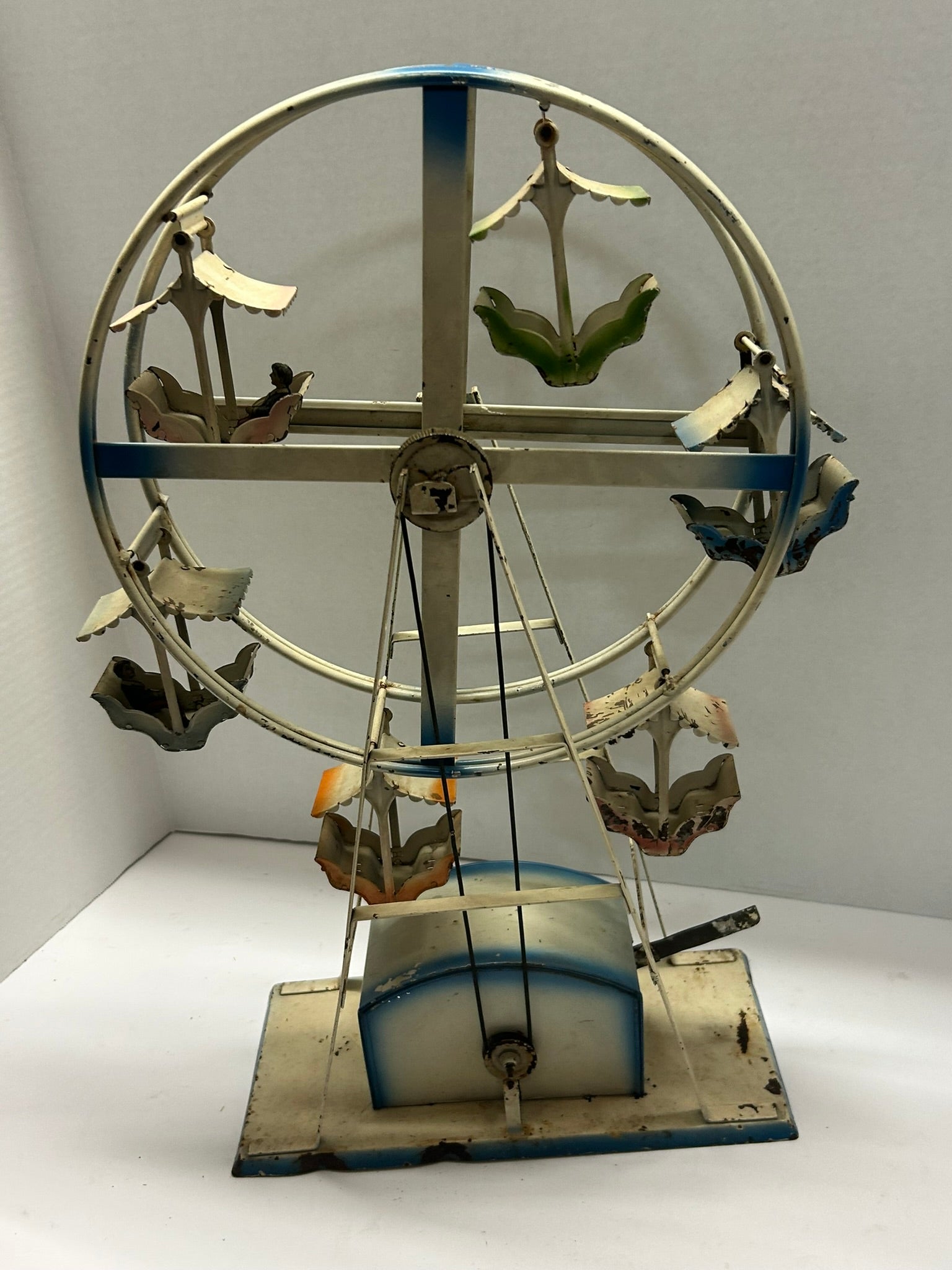 FERRIS WHEEL RACHET ANTIQUE TIN TOY WORKS BUT HAS NUMEROUS TIN PASSENGERS MISSING 20" TALL X 14' DIAMETER. CALL OR TEXT FOR MORE INFORMATION