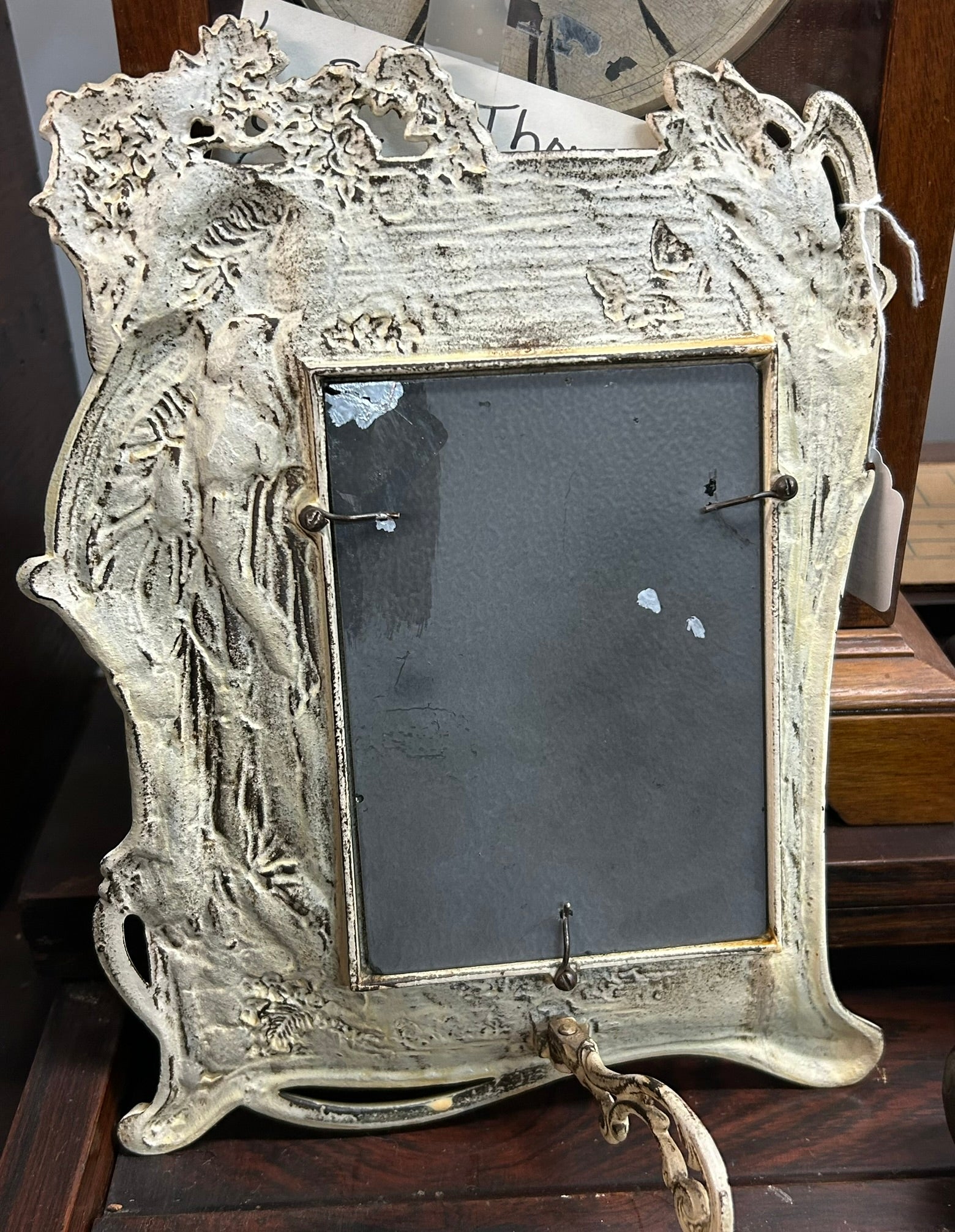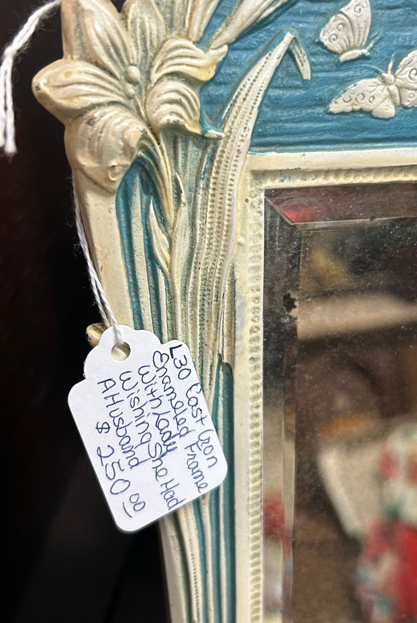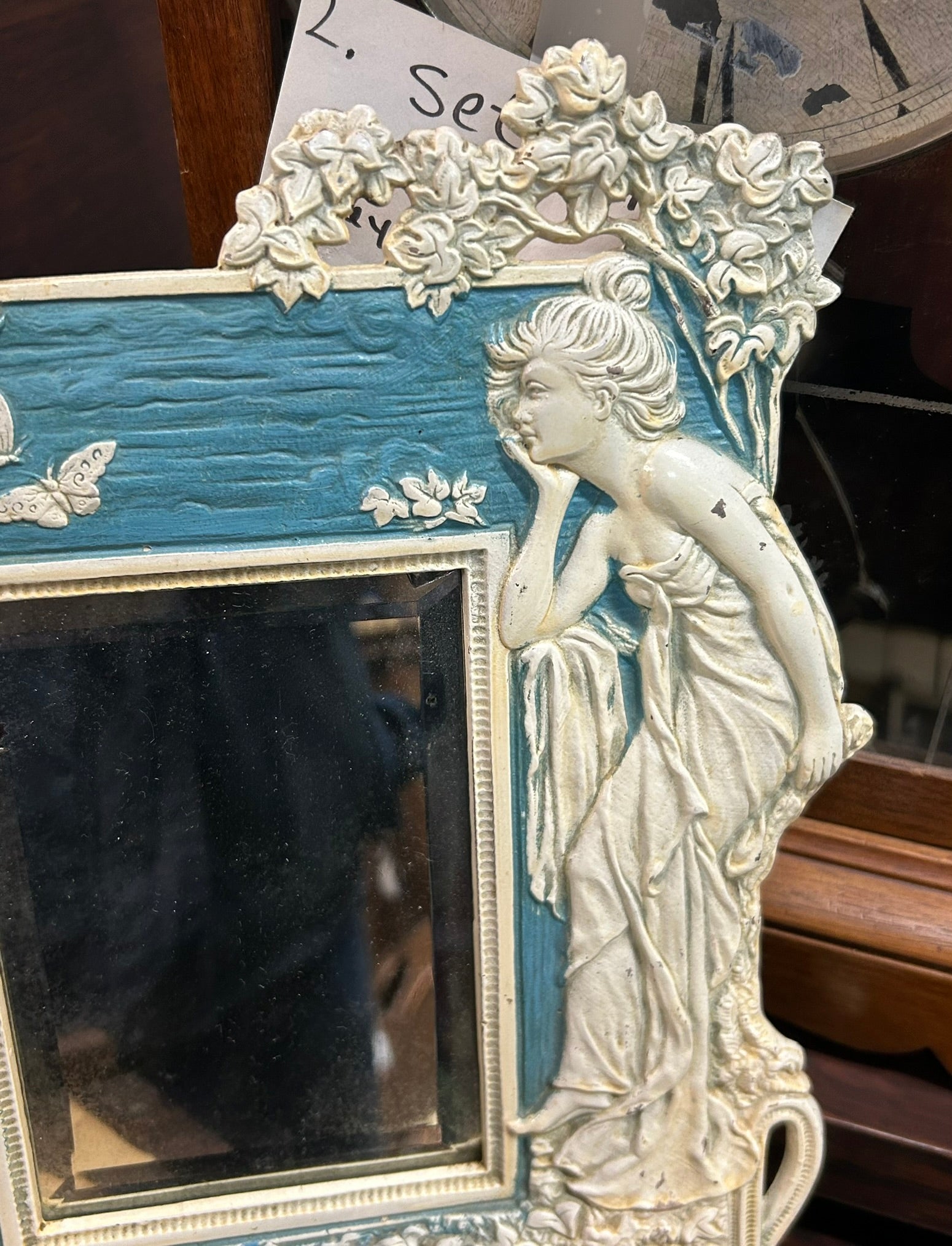 FIGURAL IRON FRAME BLUE AND WHITE ENAMEL EASEL BACK DRESSER MIRROR 11" X 9". CALL OR TEXT FOR MORE INFORMATION