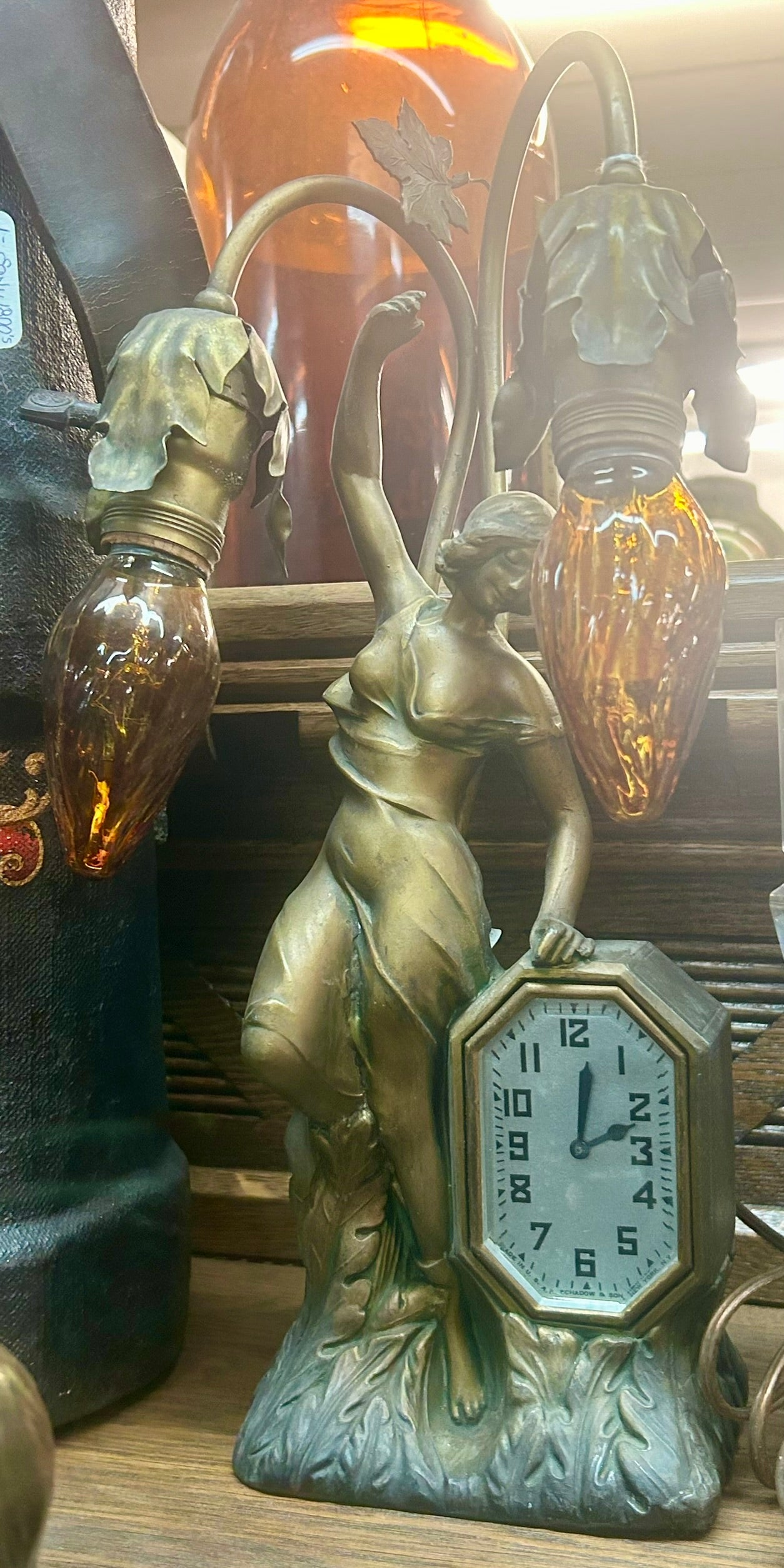 FIGURAL SPELTER METAL COMBINATION LAMP AND CLOCK WITH ART NOVEAU LADY 16" TALL. CALL OR TEXT FOR MORE INFORMATION
