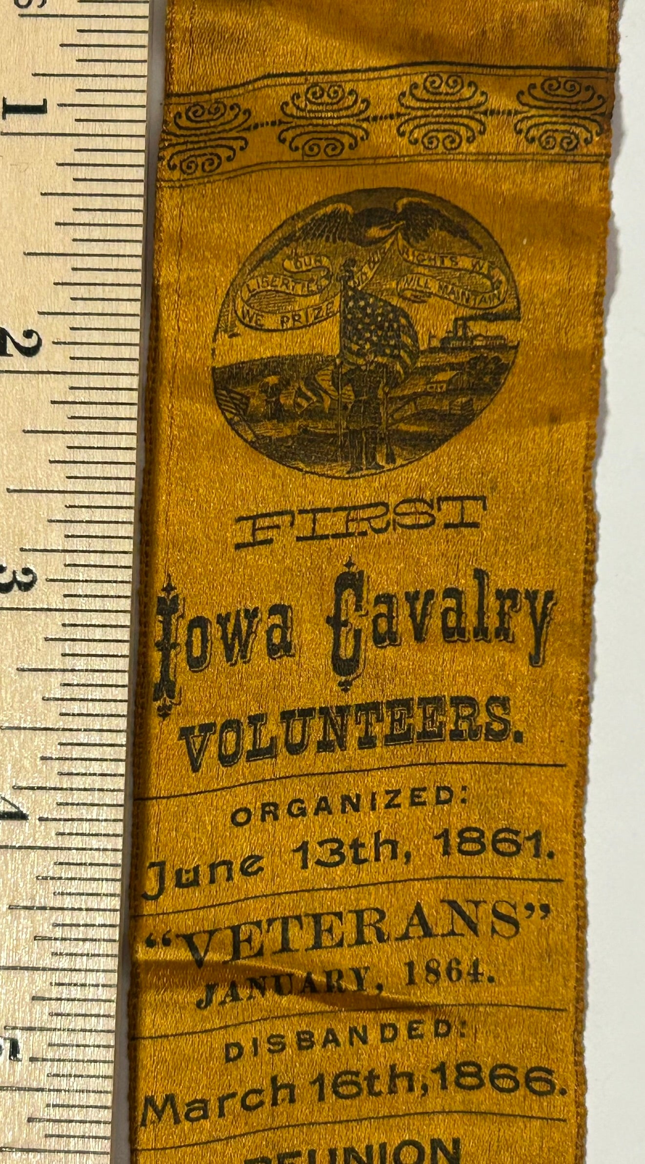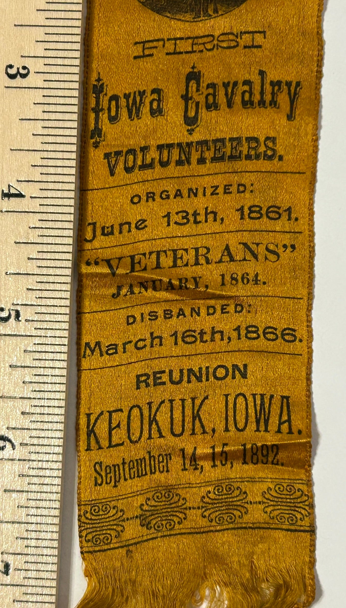 FIRST IOWA CAVALRY VOLUNTEERS 1892 REUNION RIBBON 7 1/2" LONG. CALL OR TEXT FOR MORE INFORMATION