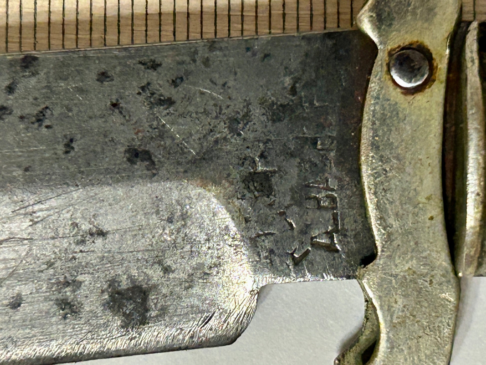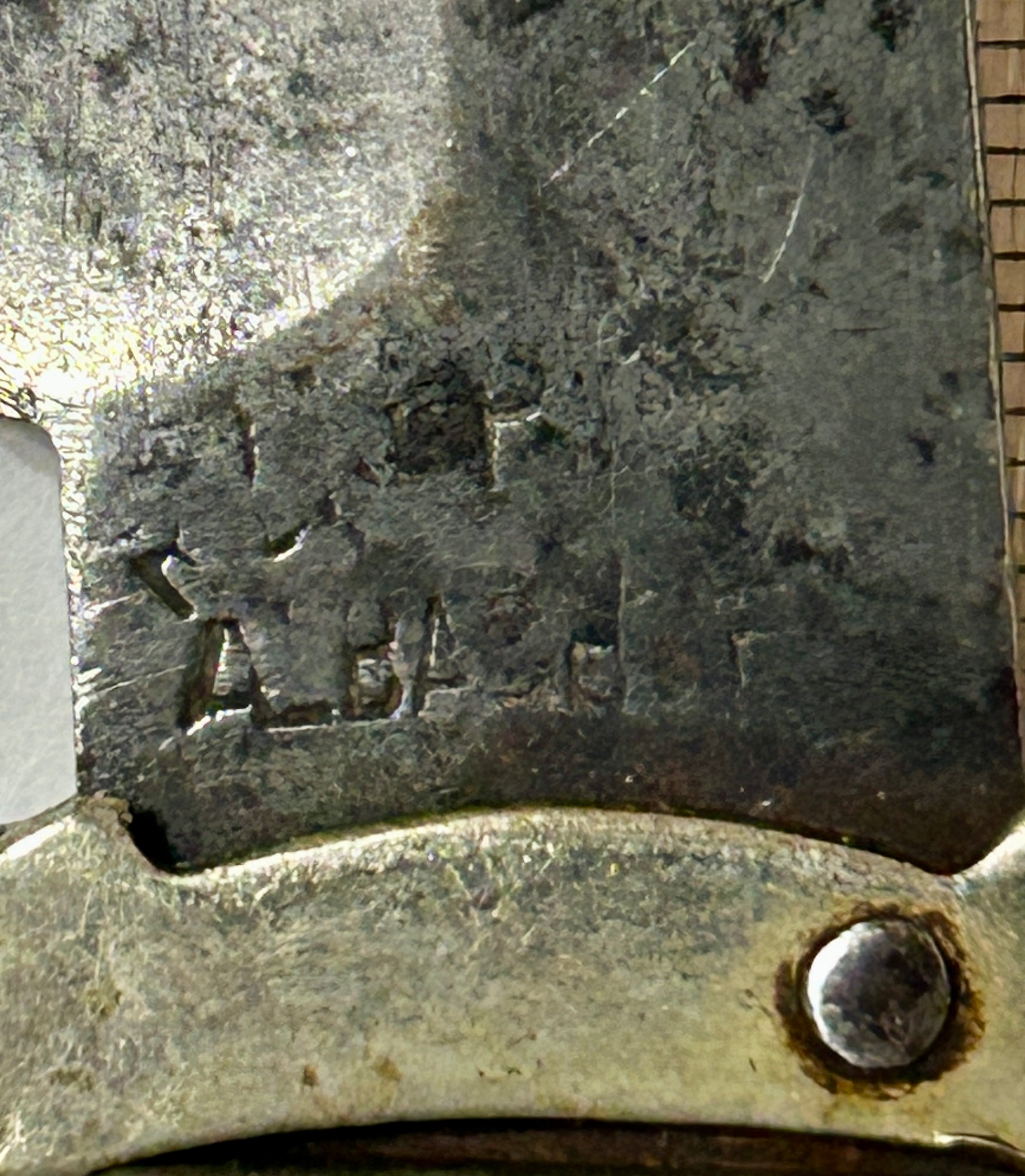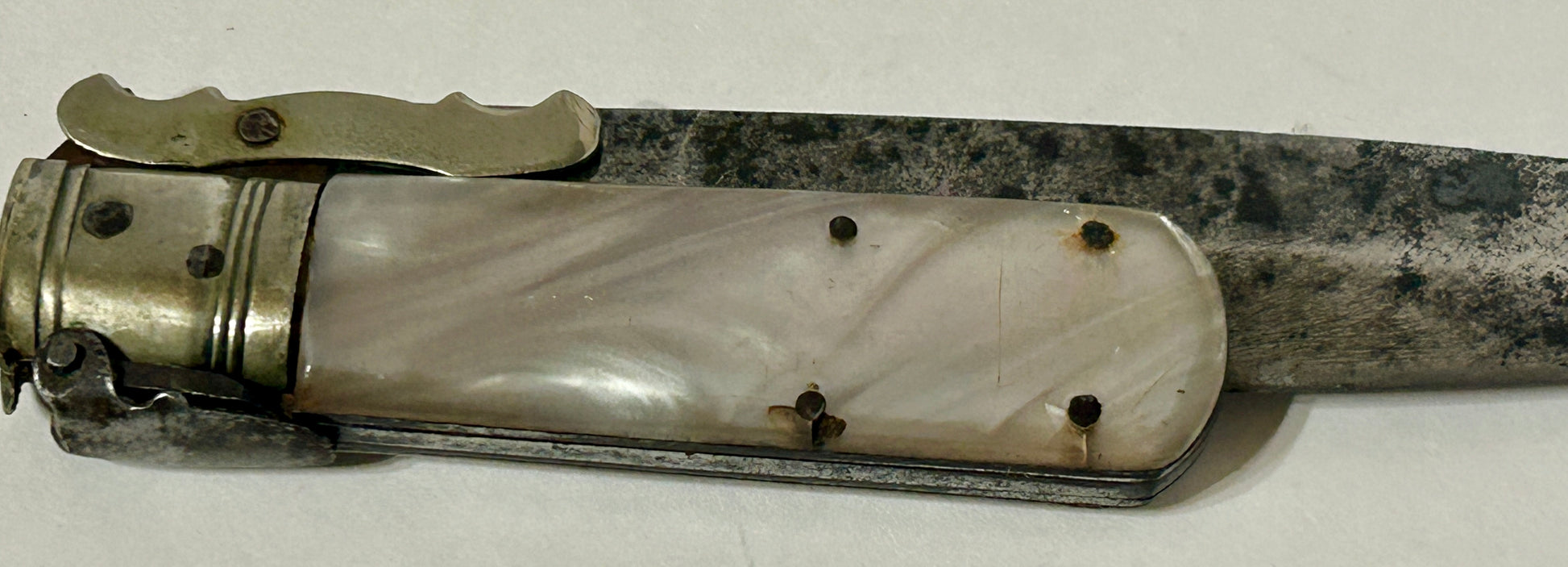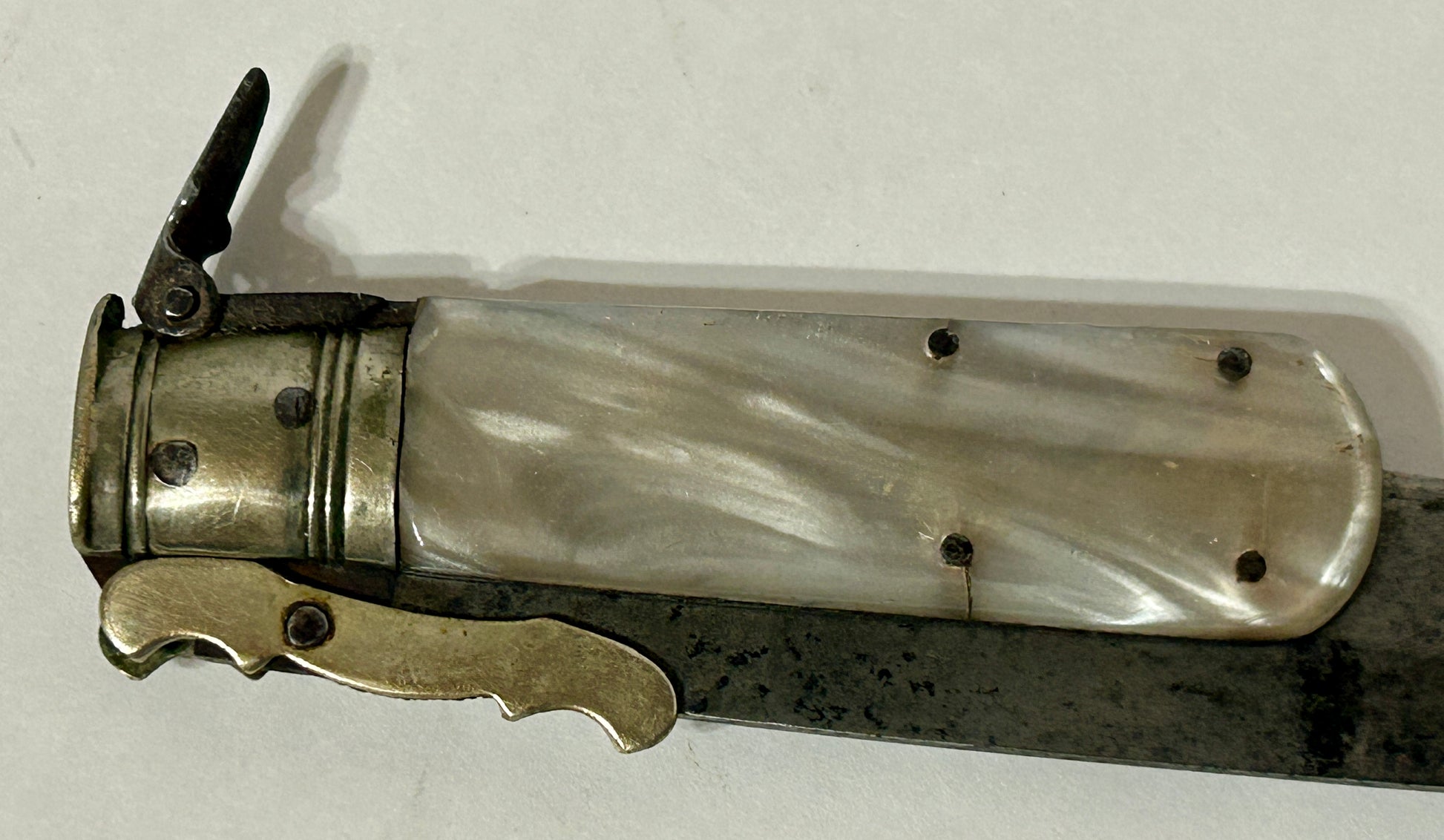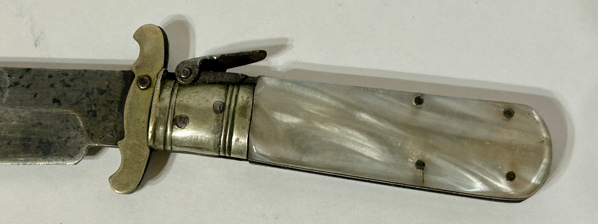 ANTIQUE EARLY FOLDING MARKED KNIFE WITH MOTHER OF PEARL HANDLE 9" OPEN. CALL OR TEXT FOR MORE INFORMATION