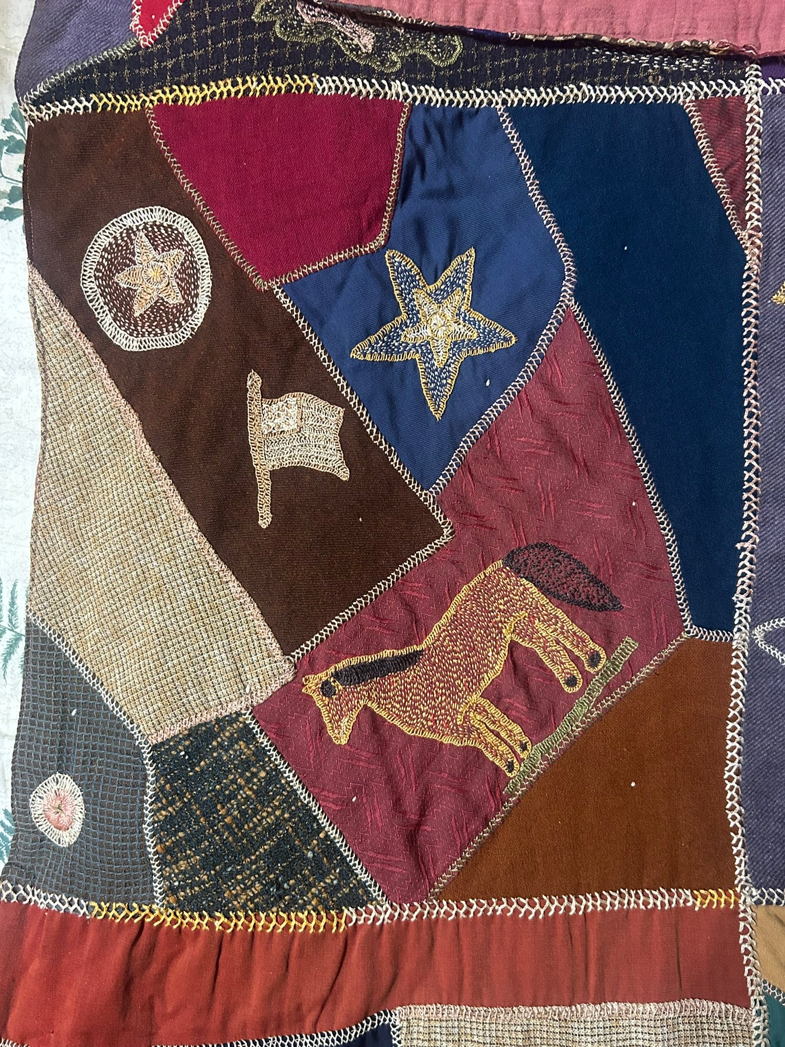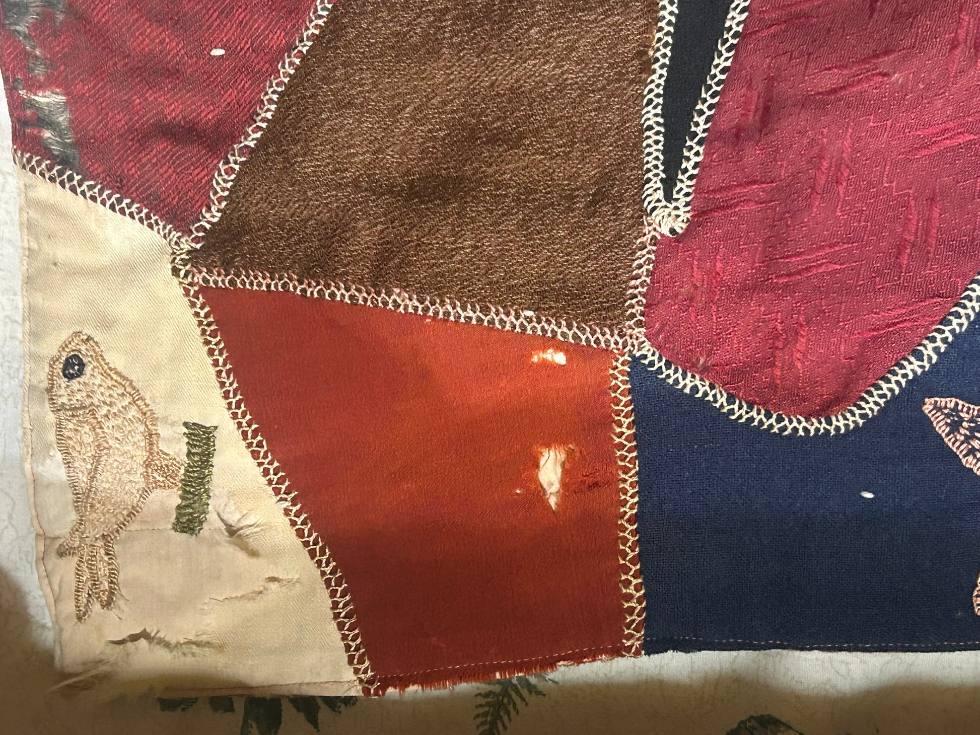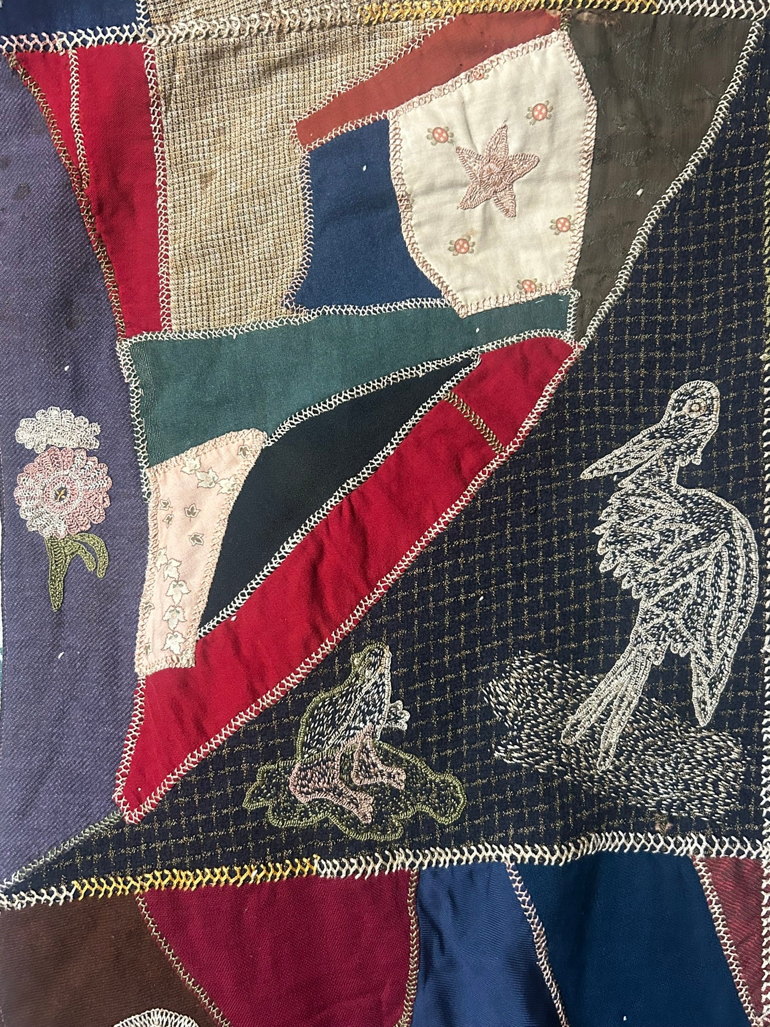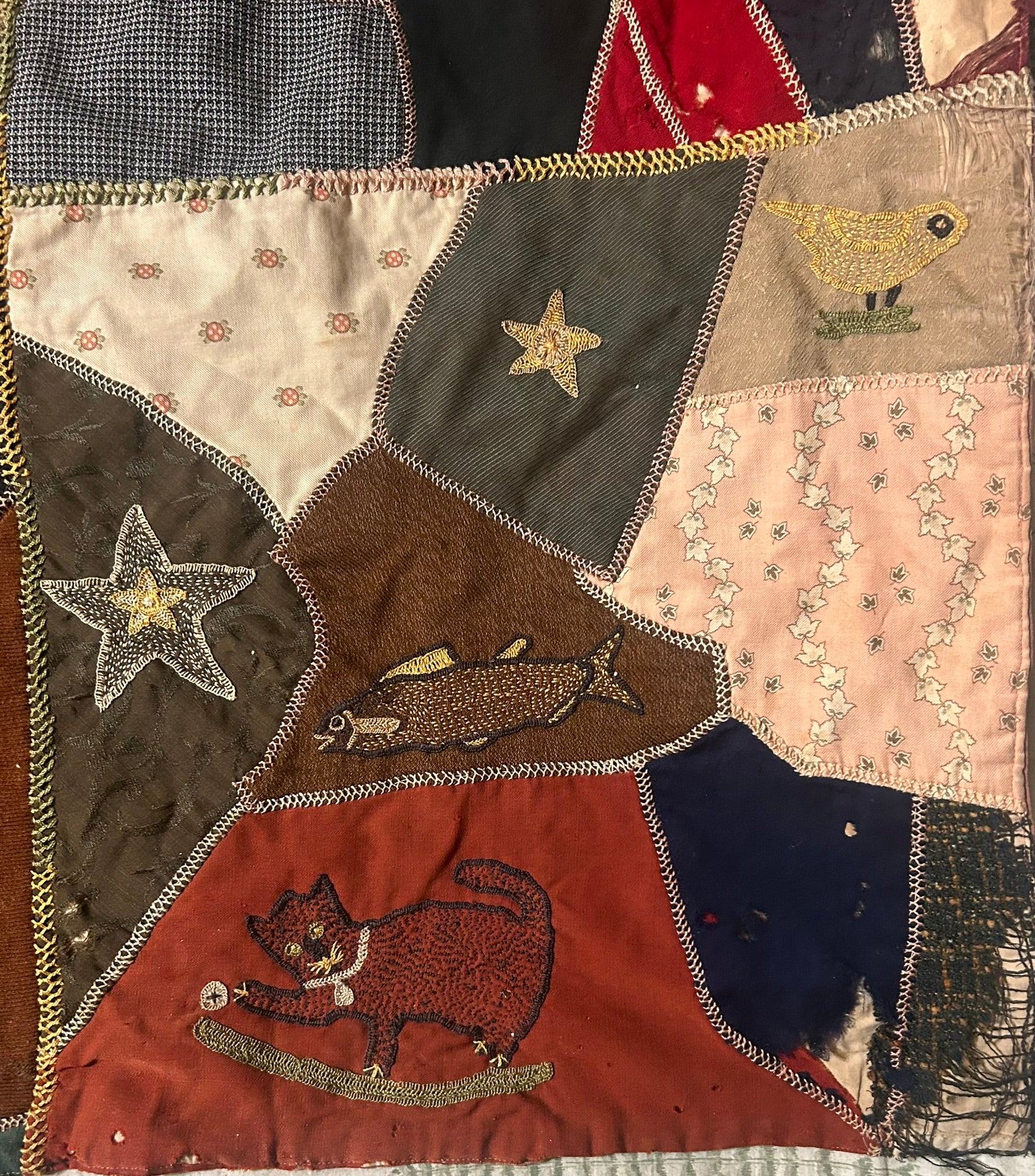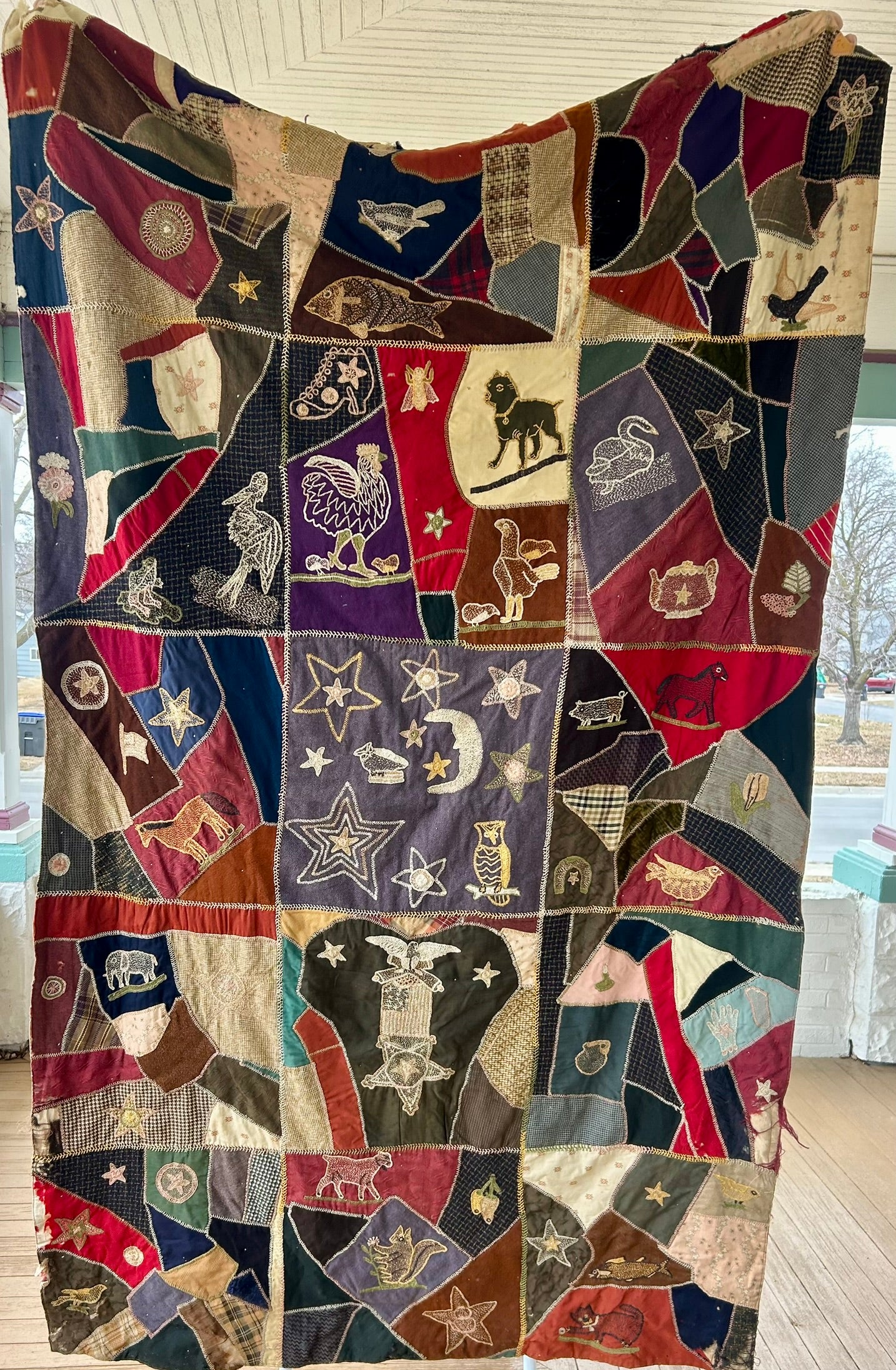 FOLK ART ANTIQUE CRAZY QUILT WITH FANTASTIC FIGURAL SQUARES