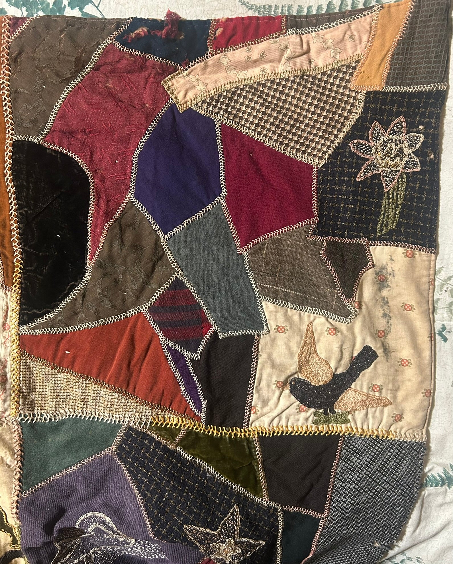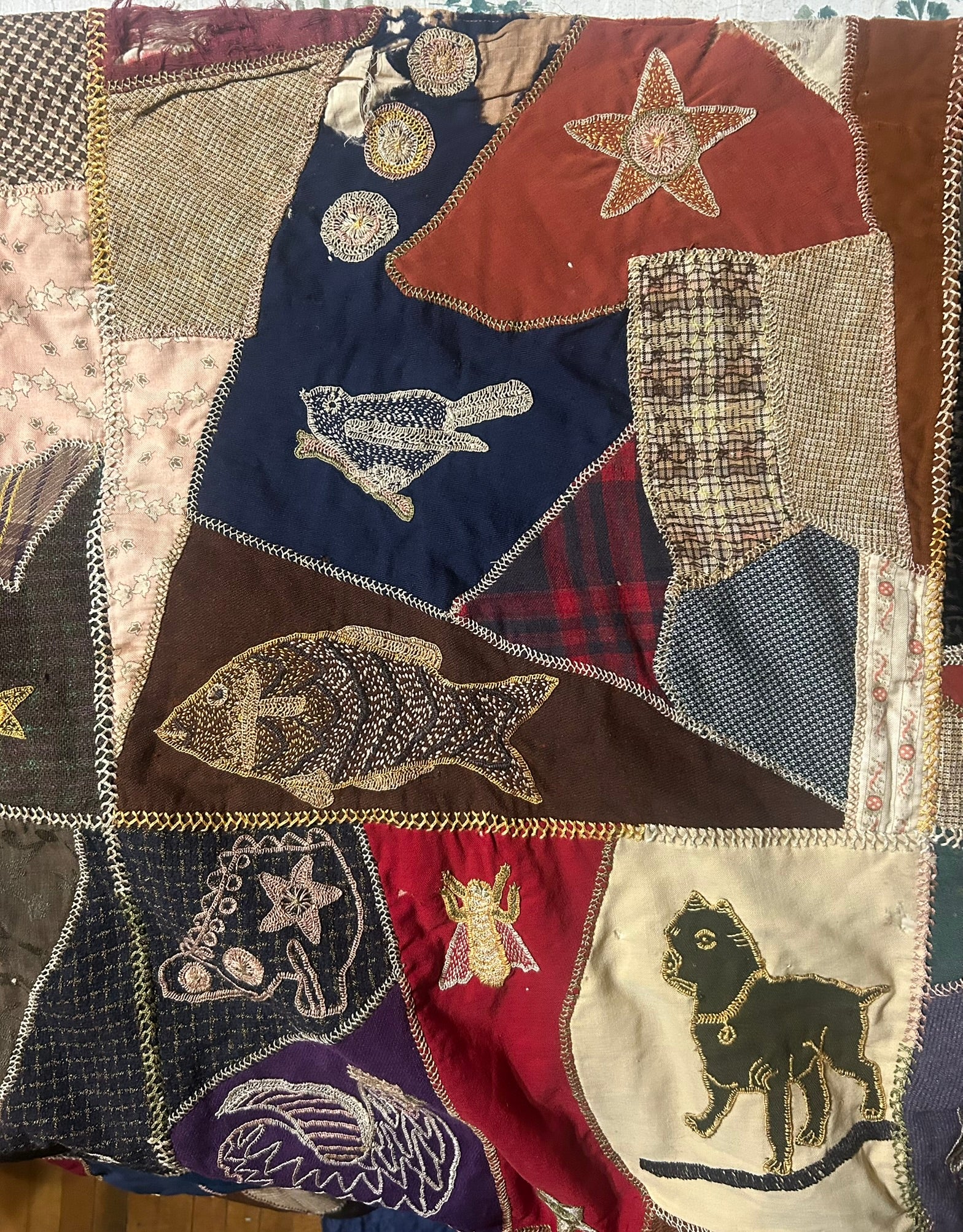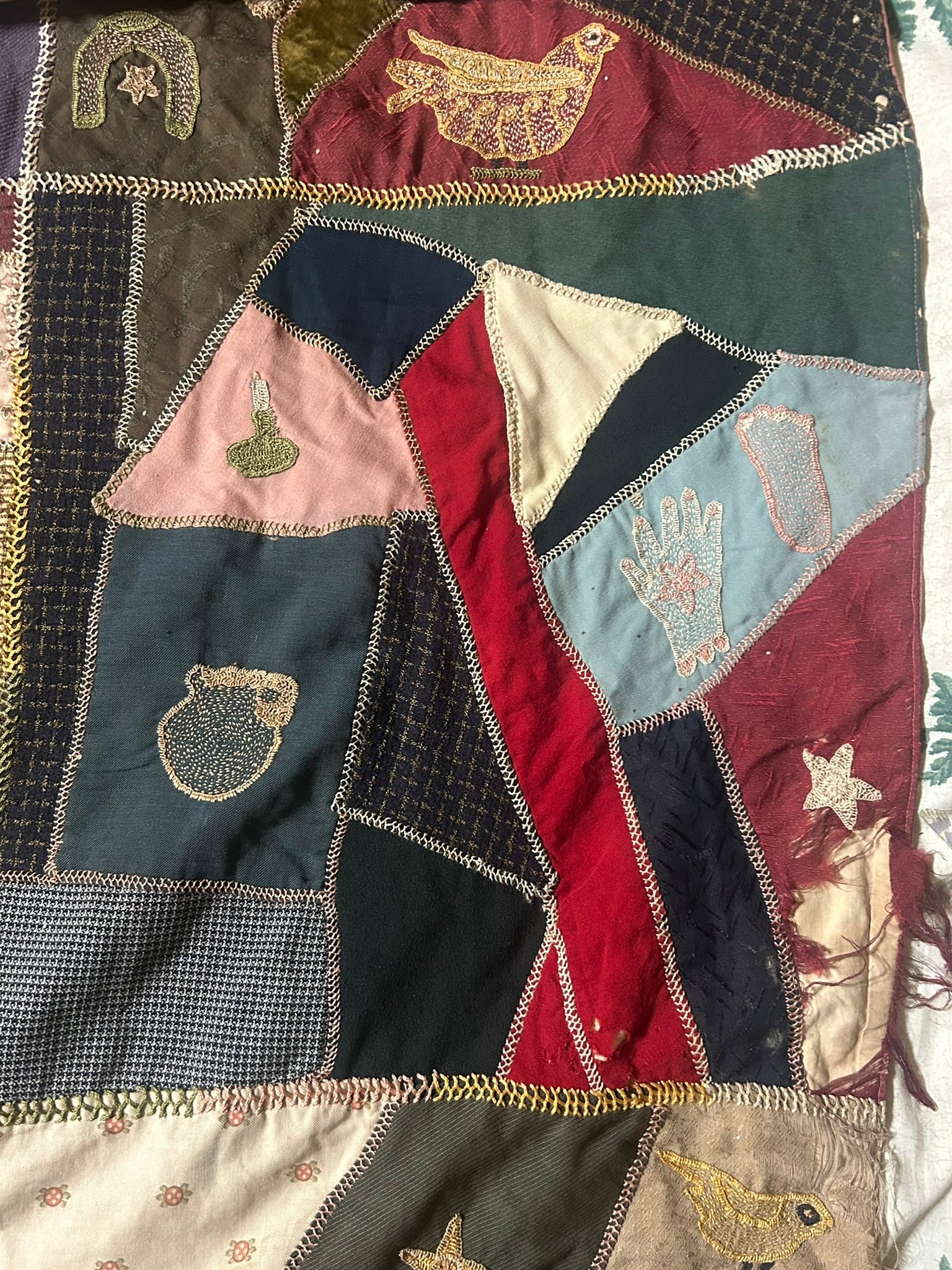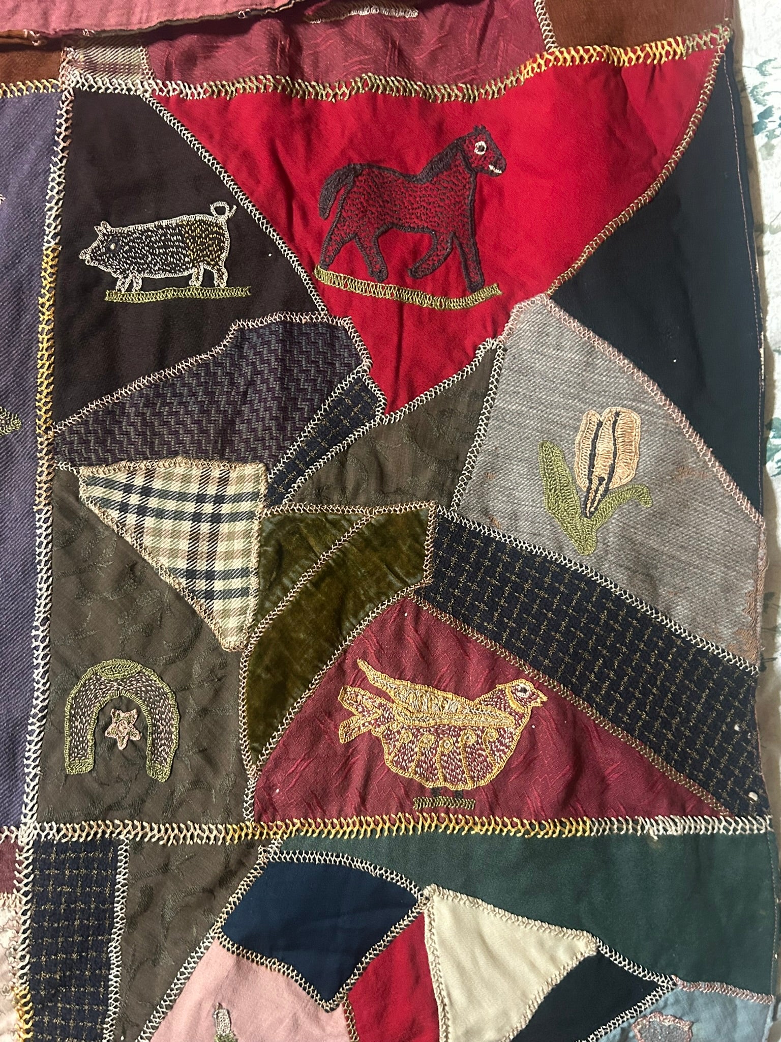 FOLK ART ANTIQUE CRAZY QUILT WITH FANTASTIC FIGURAL SQUARES