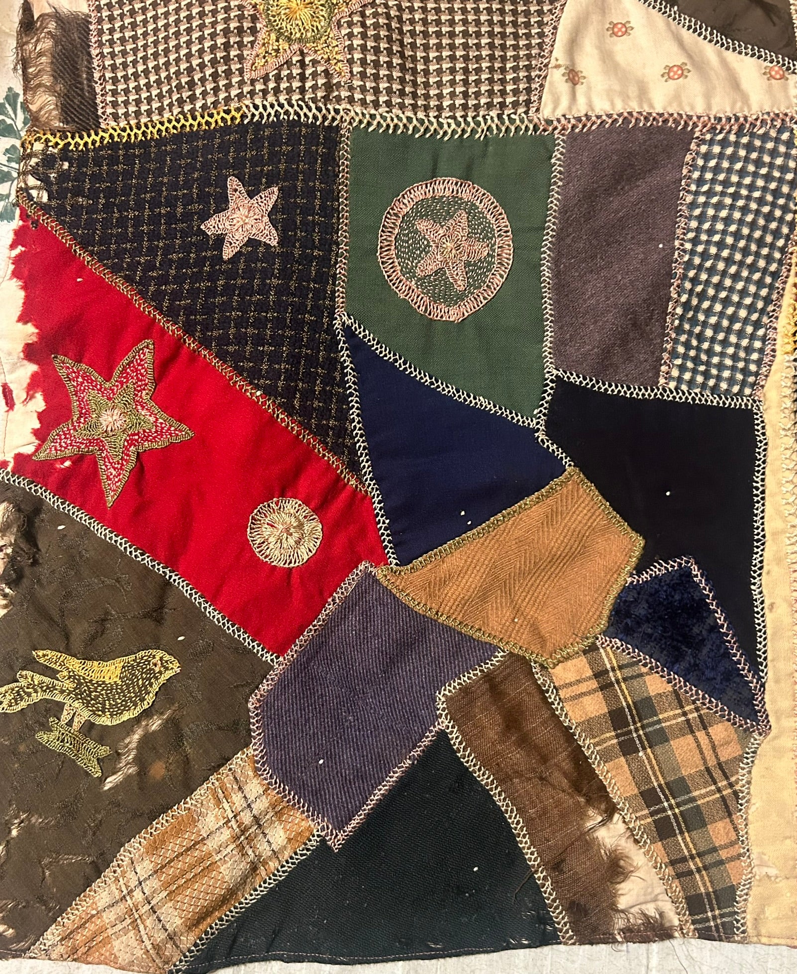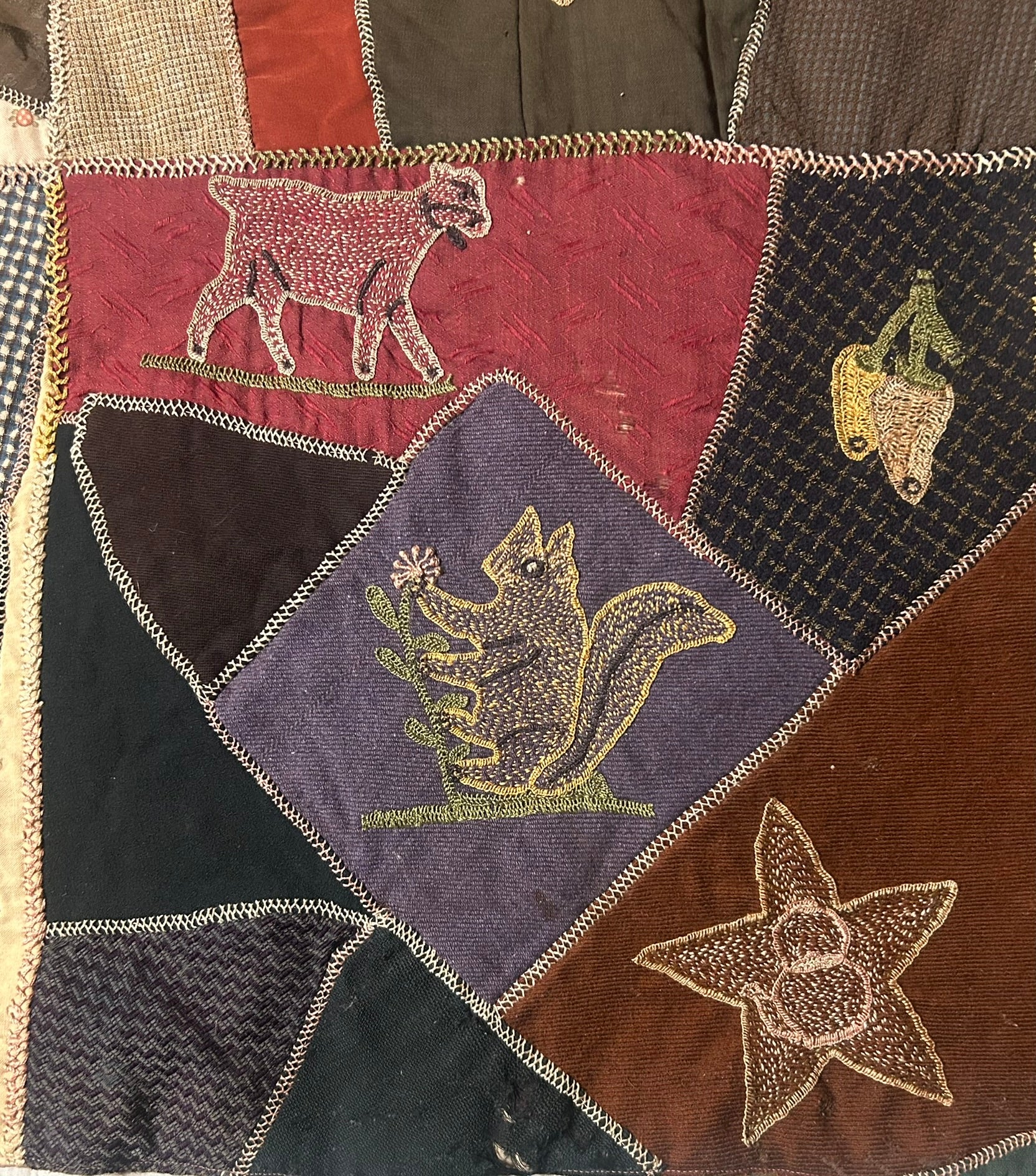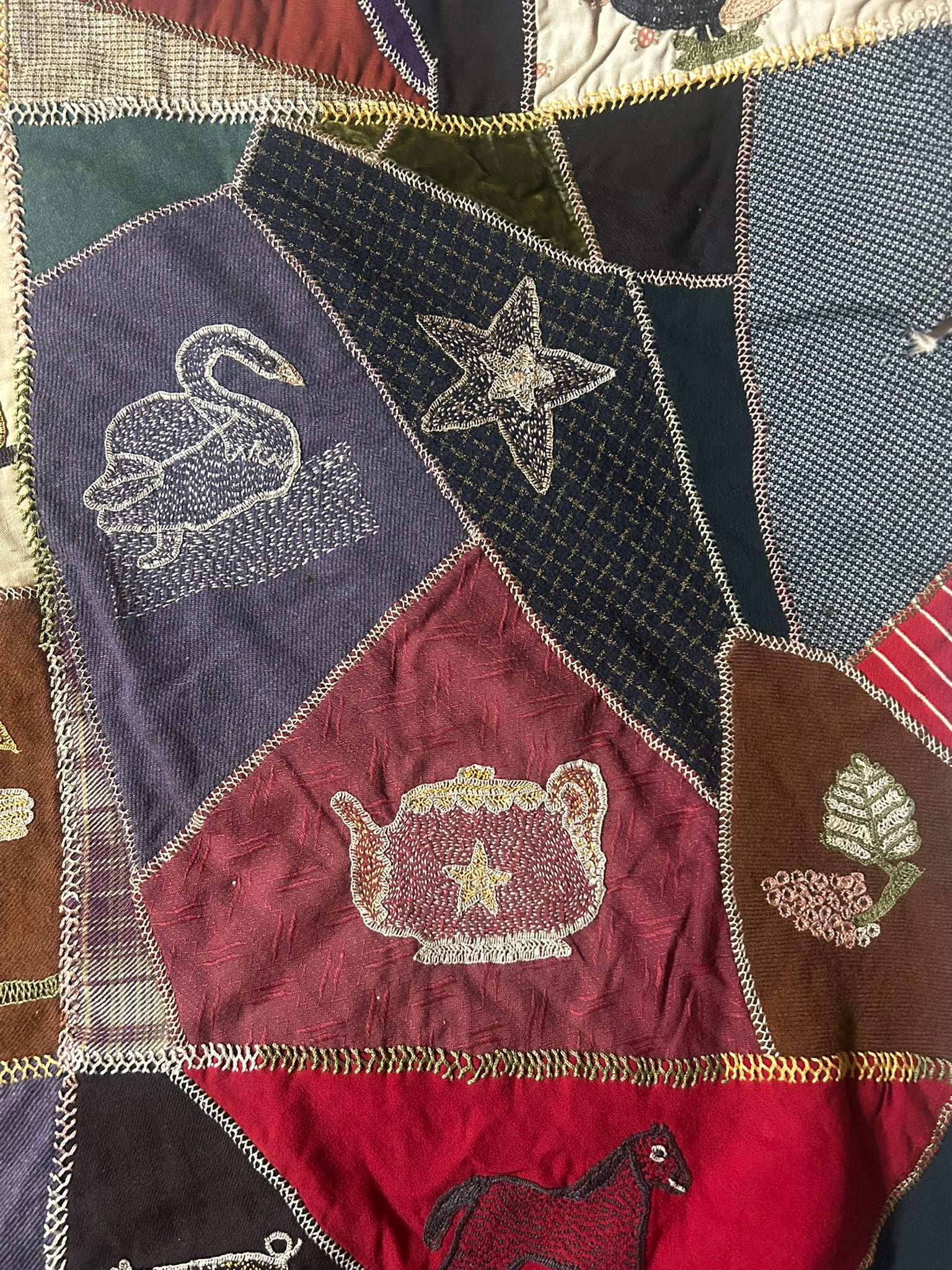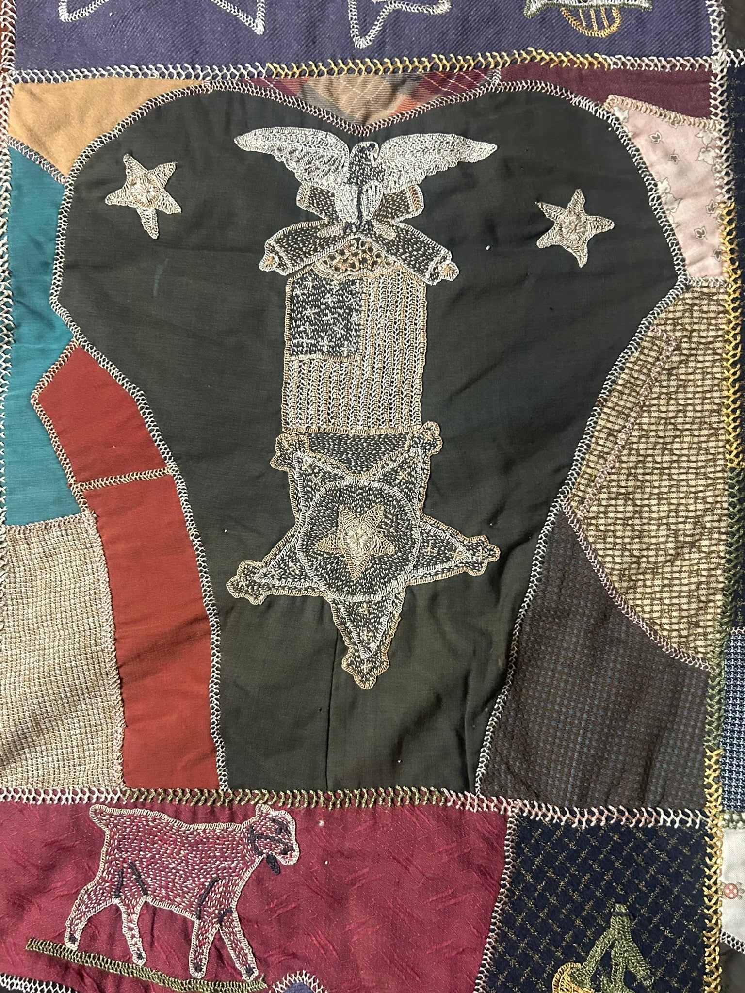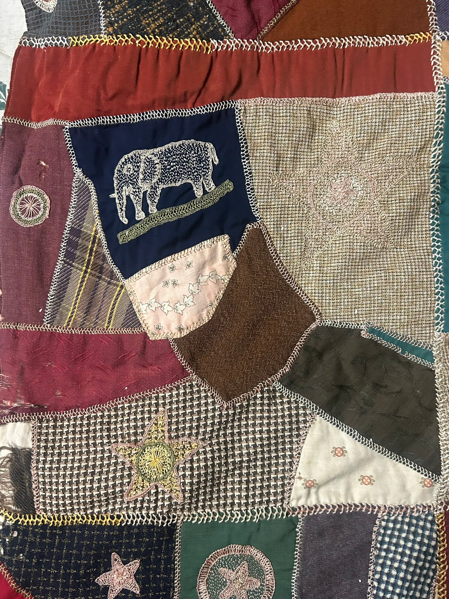 FOLK ART ANTIQUE CRAZY QUILT WITH FANTASTIC FIGURAL SQUARES