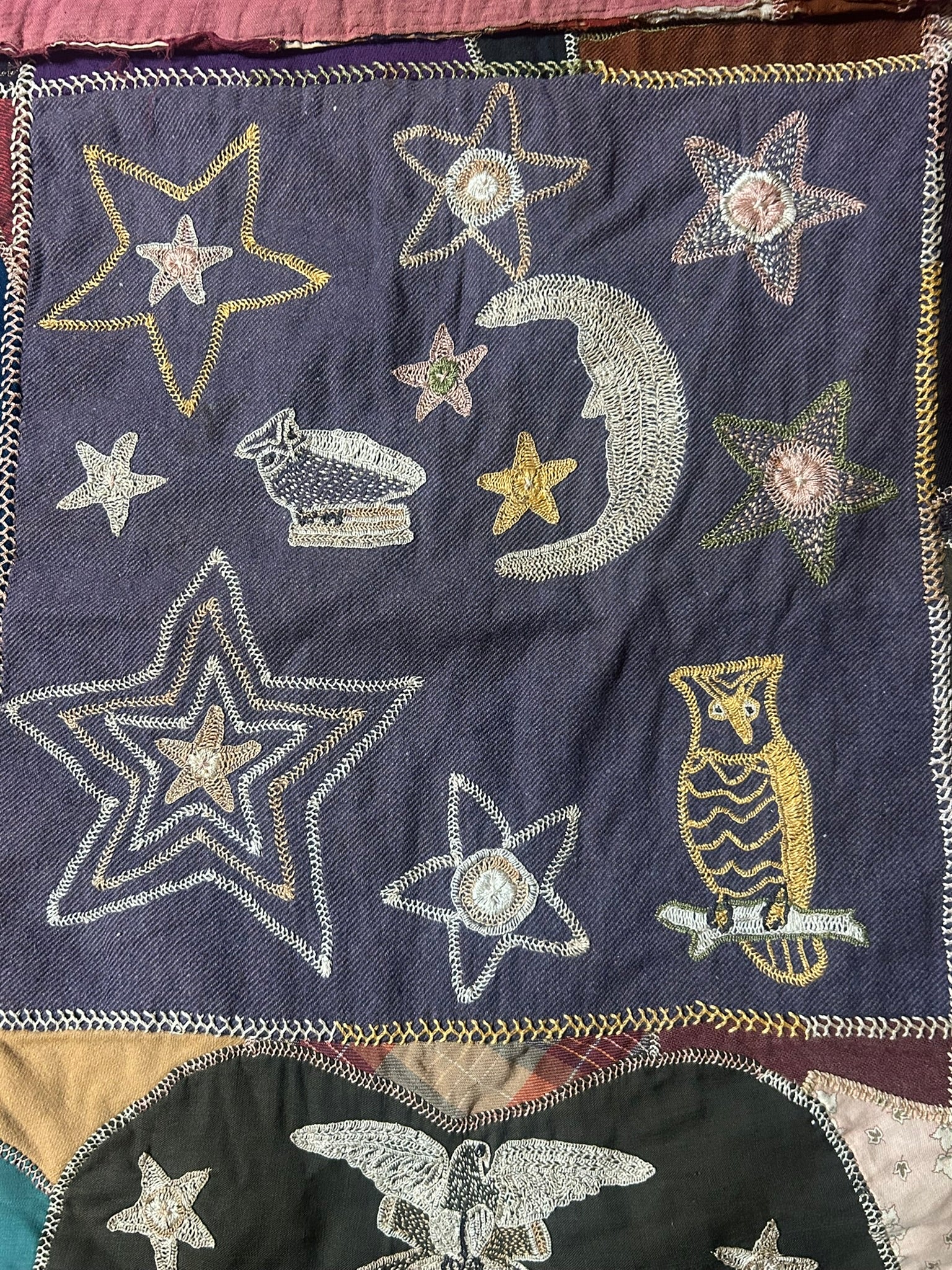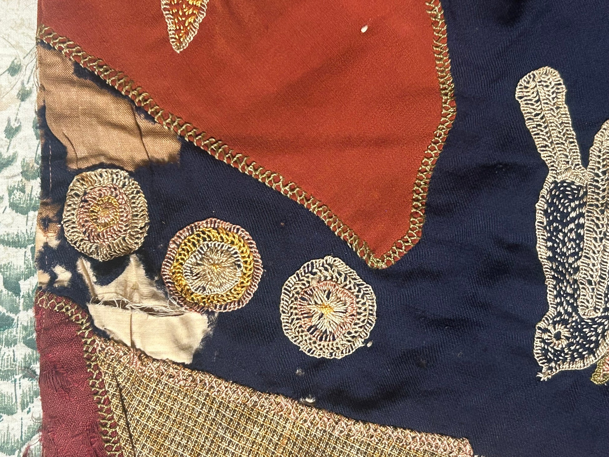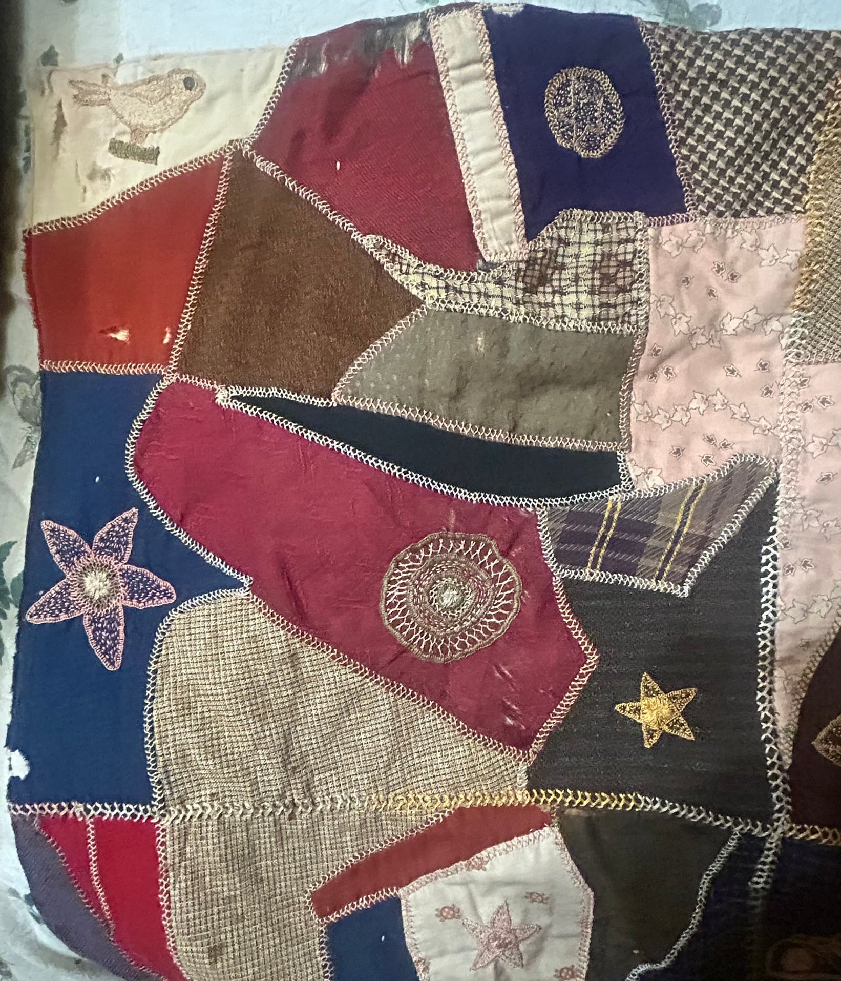ANTIQUE CRAZY QUILT WITH FANTASTIC FOLK ART FIGURES IN SQUARES, NOTE THERE ARE NUMEROUS AREAS OF WEAR BUT RESTORATION OF EDGES WOULD MAKE A GREAT WALL HANGING 80" LONG X 48" WIDE. CALL OR TEXT FOR MORE INFORMATION