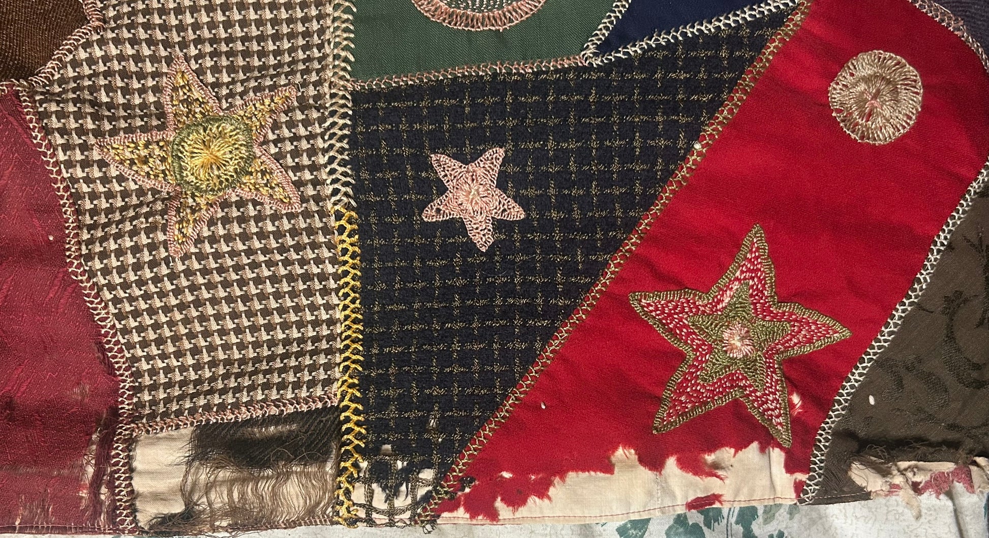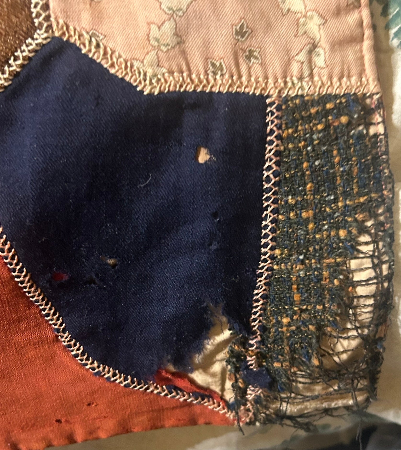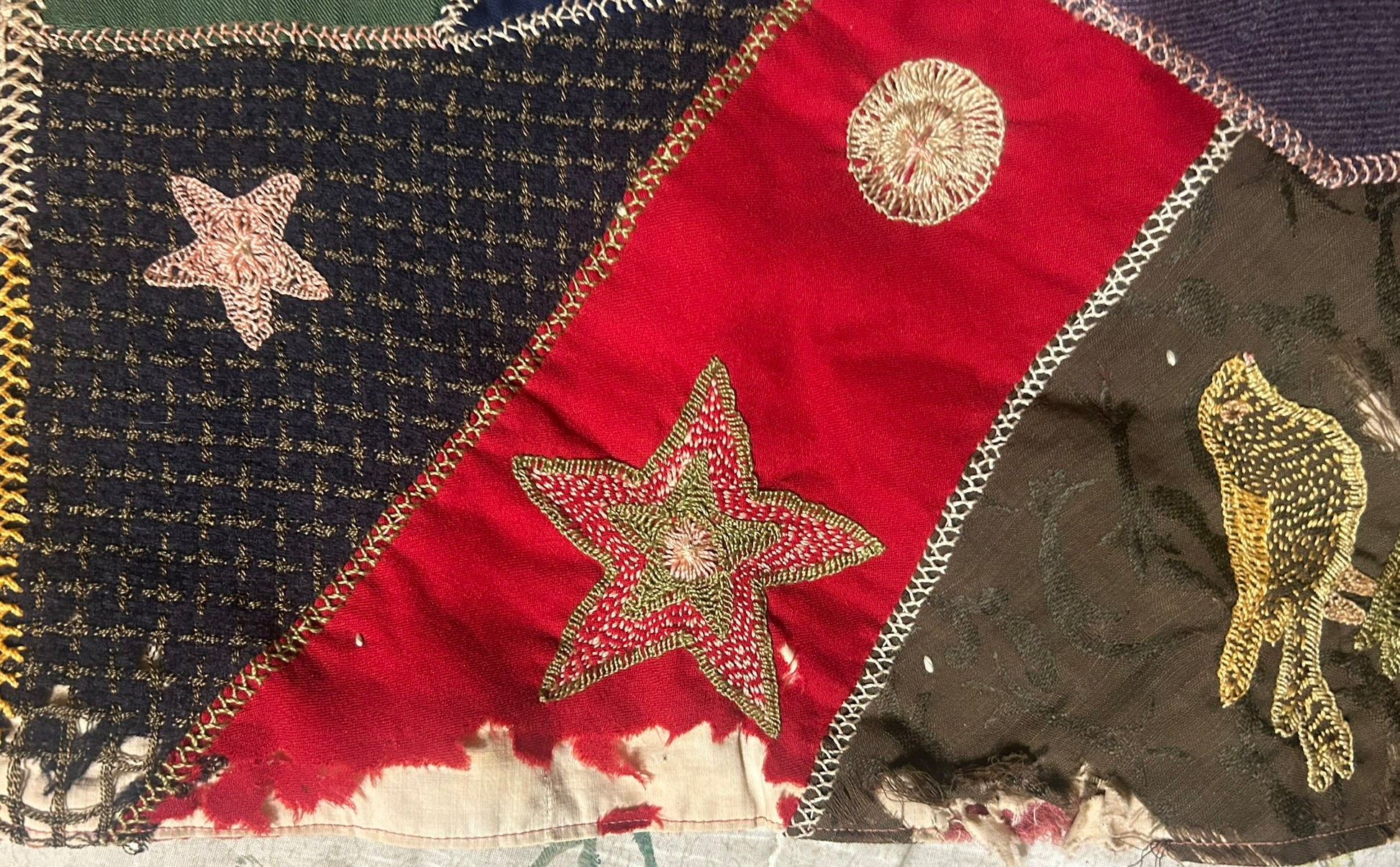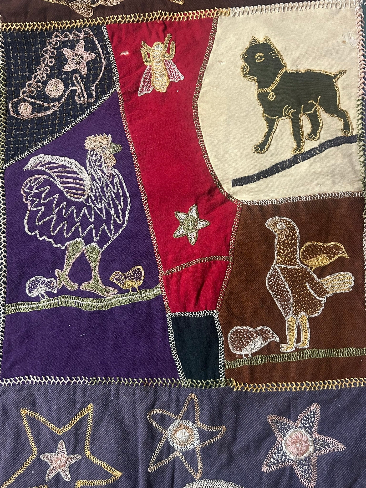 ANTIQUE CRAZY QUILT WITH FANTASTIC FOLK ART FIGURES IN SQUARES, NOTE THERE ARE NUMEROUS AREAS OF WEAR BUT RESTORATION OF EDGES WOULD MAKE A GREAT WALL HANGING 80" LONG X 48" WIDE. CALL OR TEXT FOR MORE INFORMATION