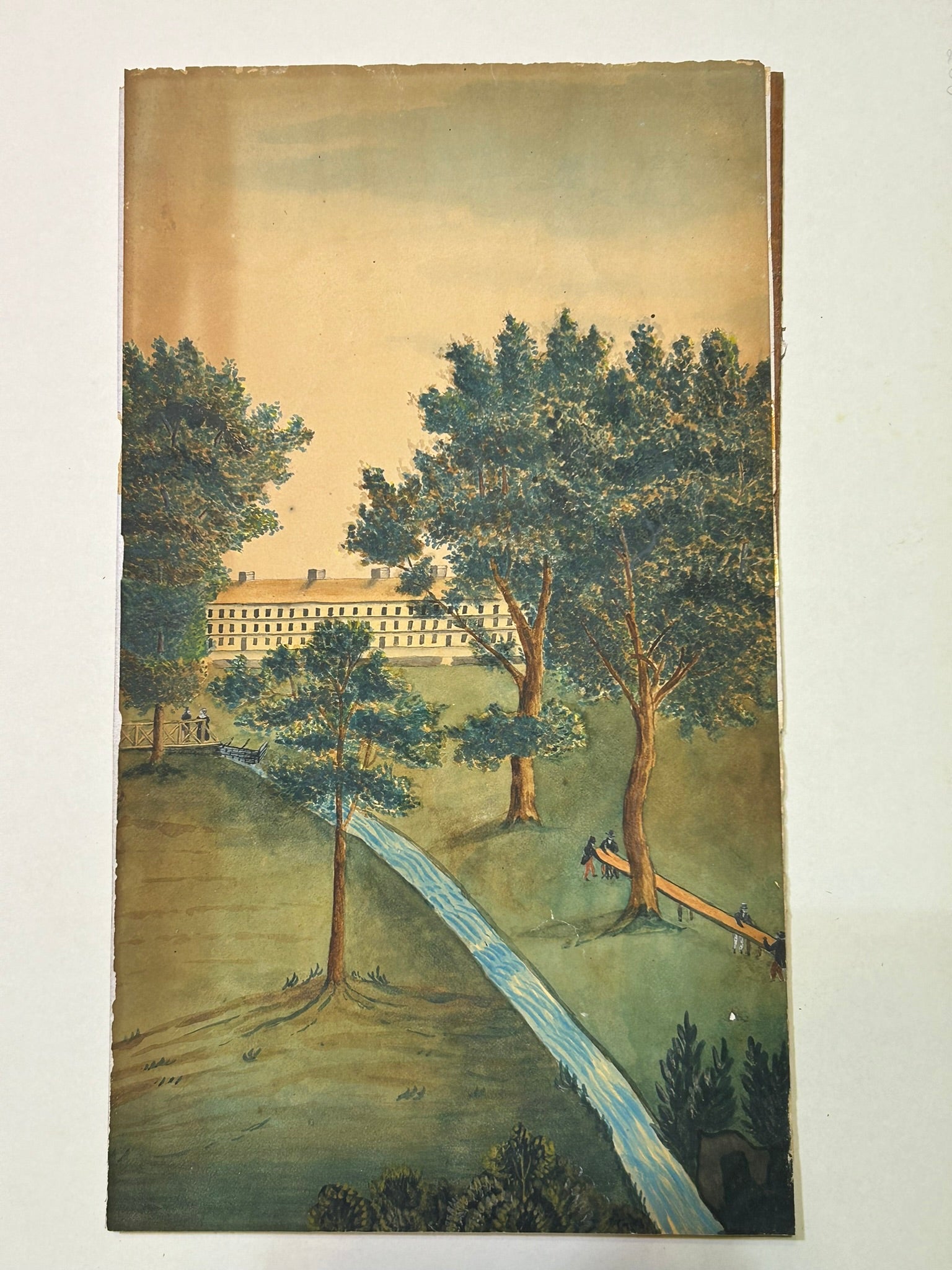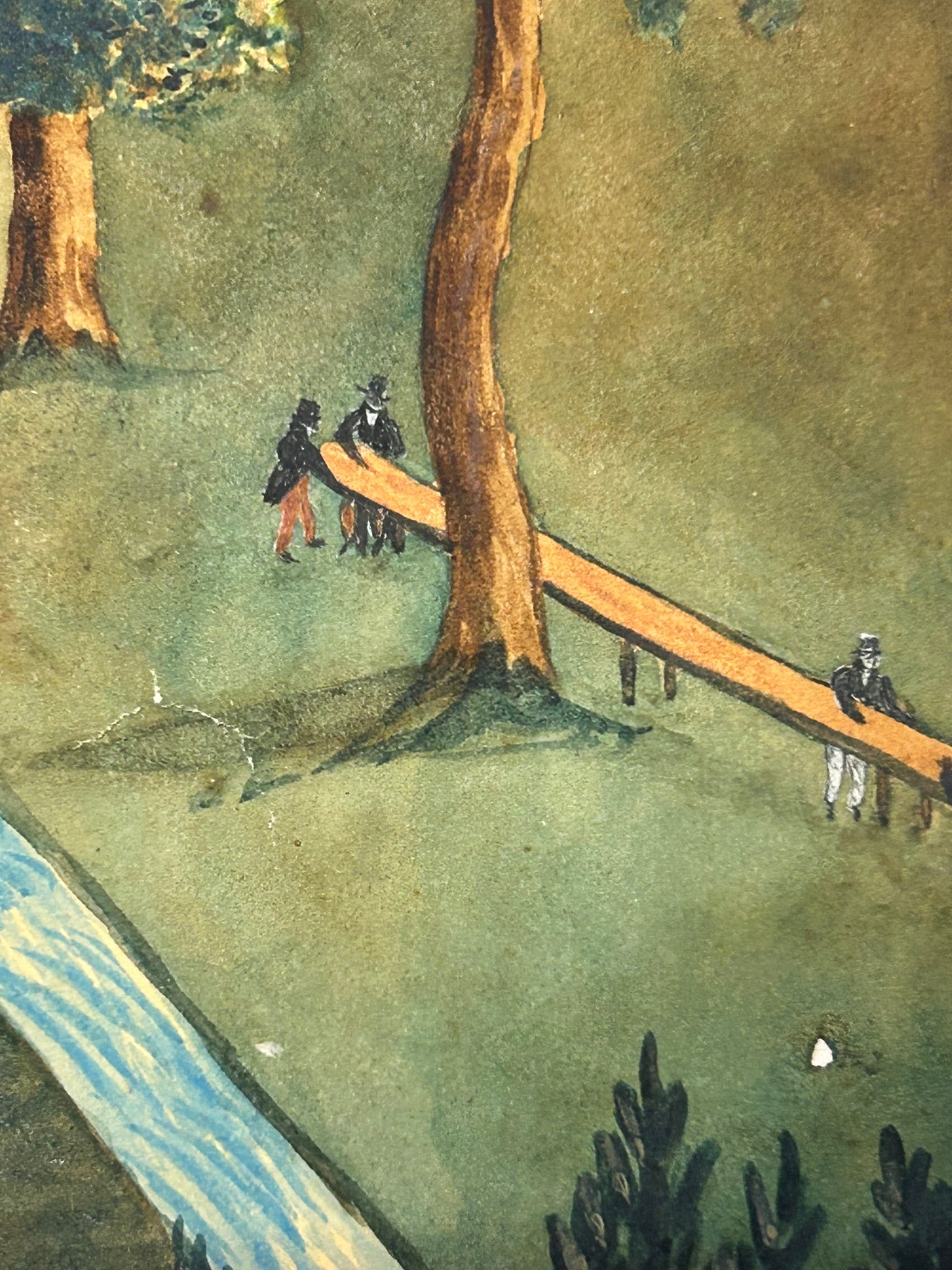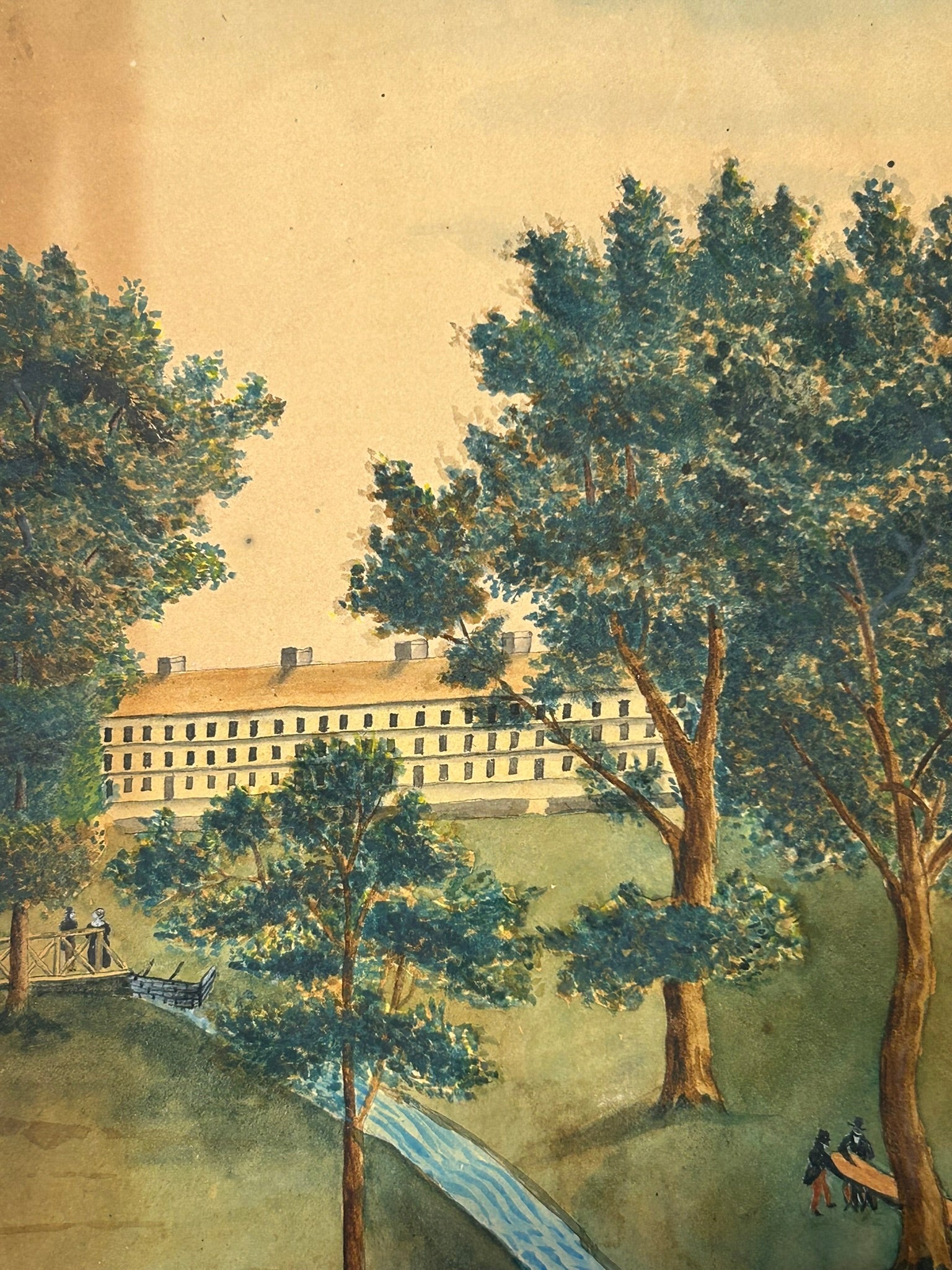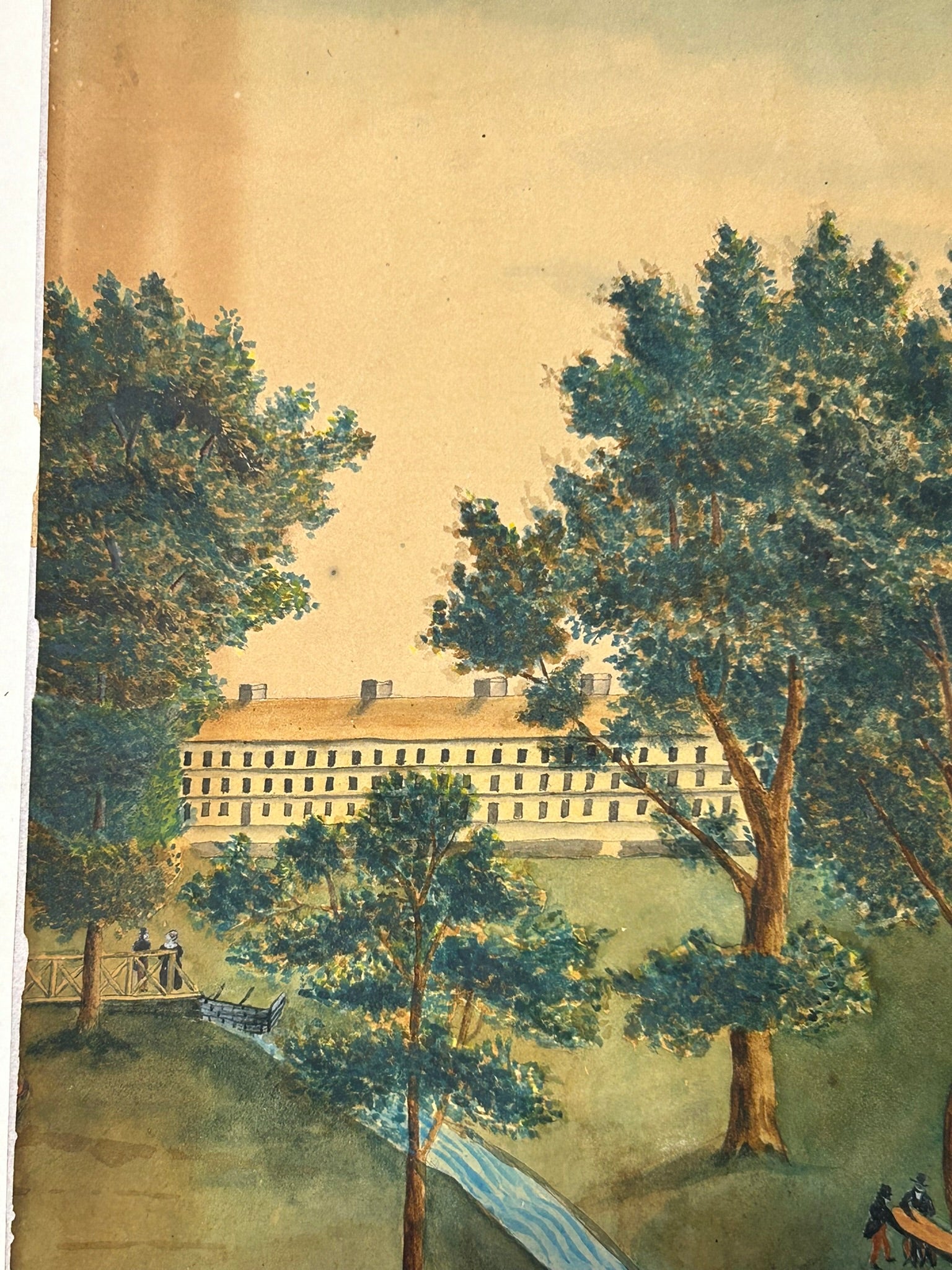 FOLK ART ANTIQUE WATERCOLOR PAINTING OF LARGE BUILDING AND PEOPLE 17" X 11" WITH FRAME. CALL OR TEXT FOR MORE INFORMATION