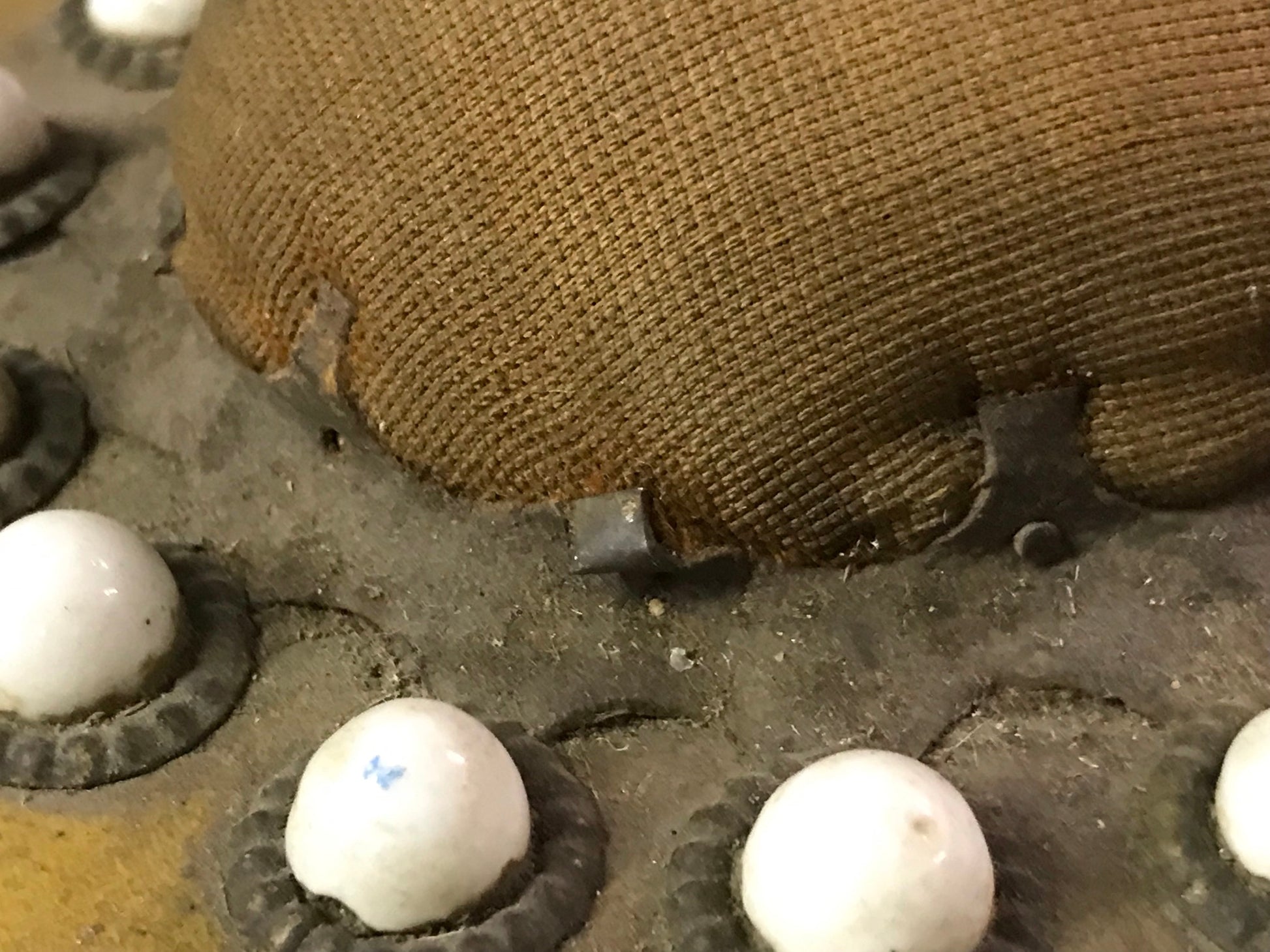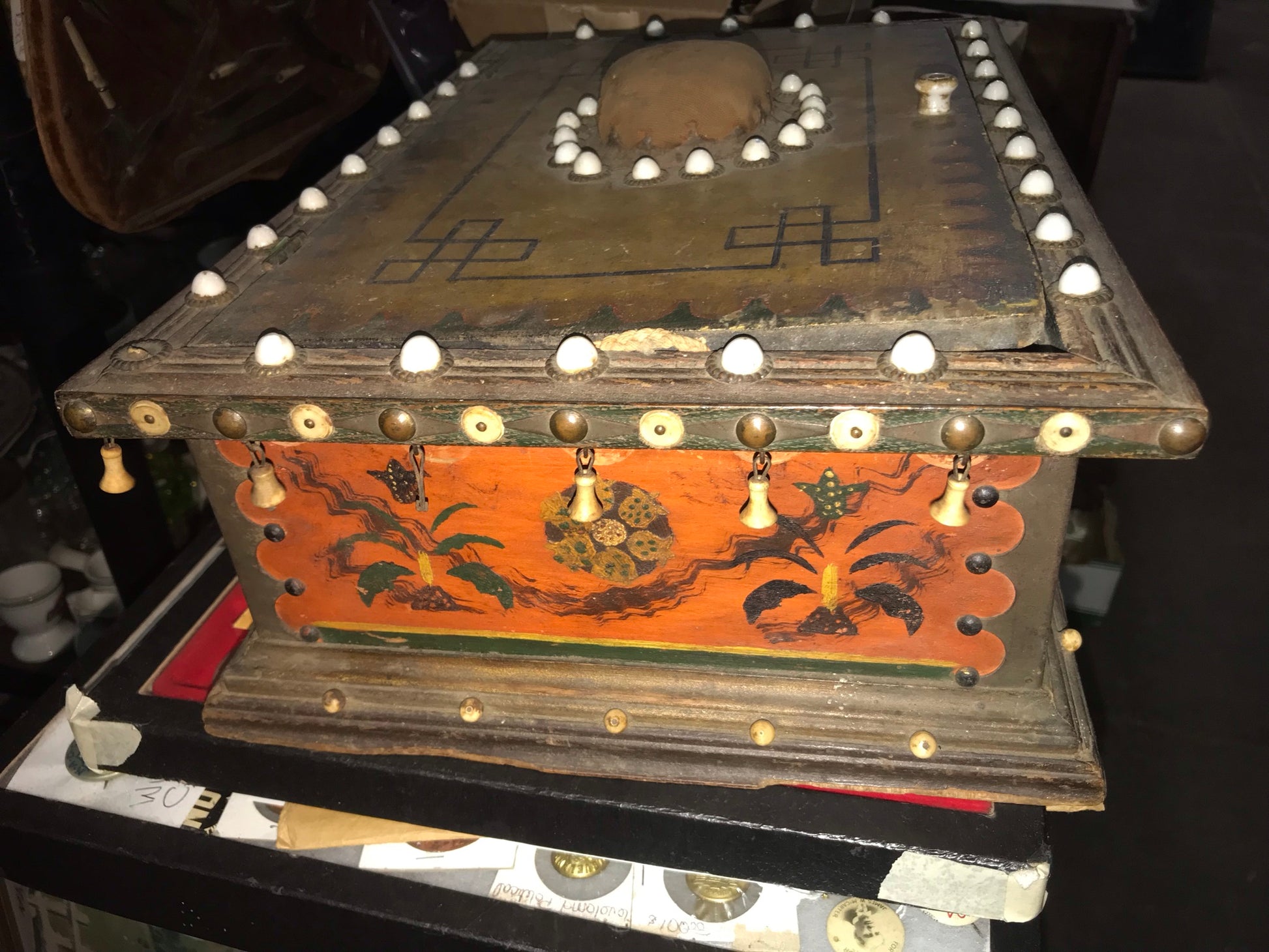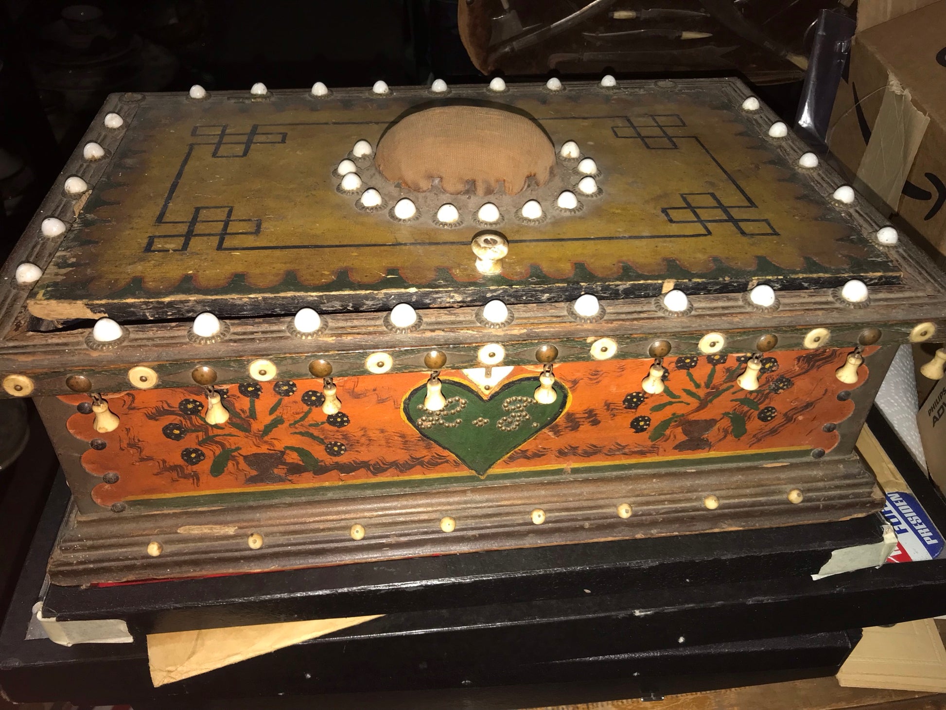 ANTIQUE FOLK ART BOX WITH CARVED DROPS, PORCELAIN NAIL HEADS, HEARTS, BIRDS, FLOWERS, ETC. 16 1/2" WIDE X 11" DEEP X 5" TALL. CALL OR TEXT FOR MORE INFORMATION