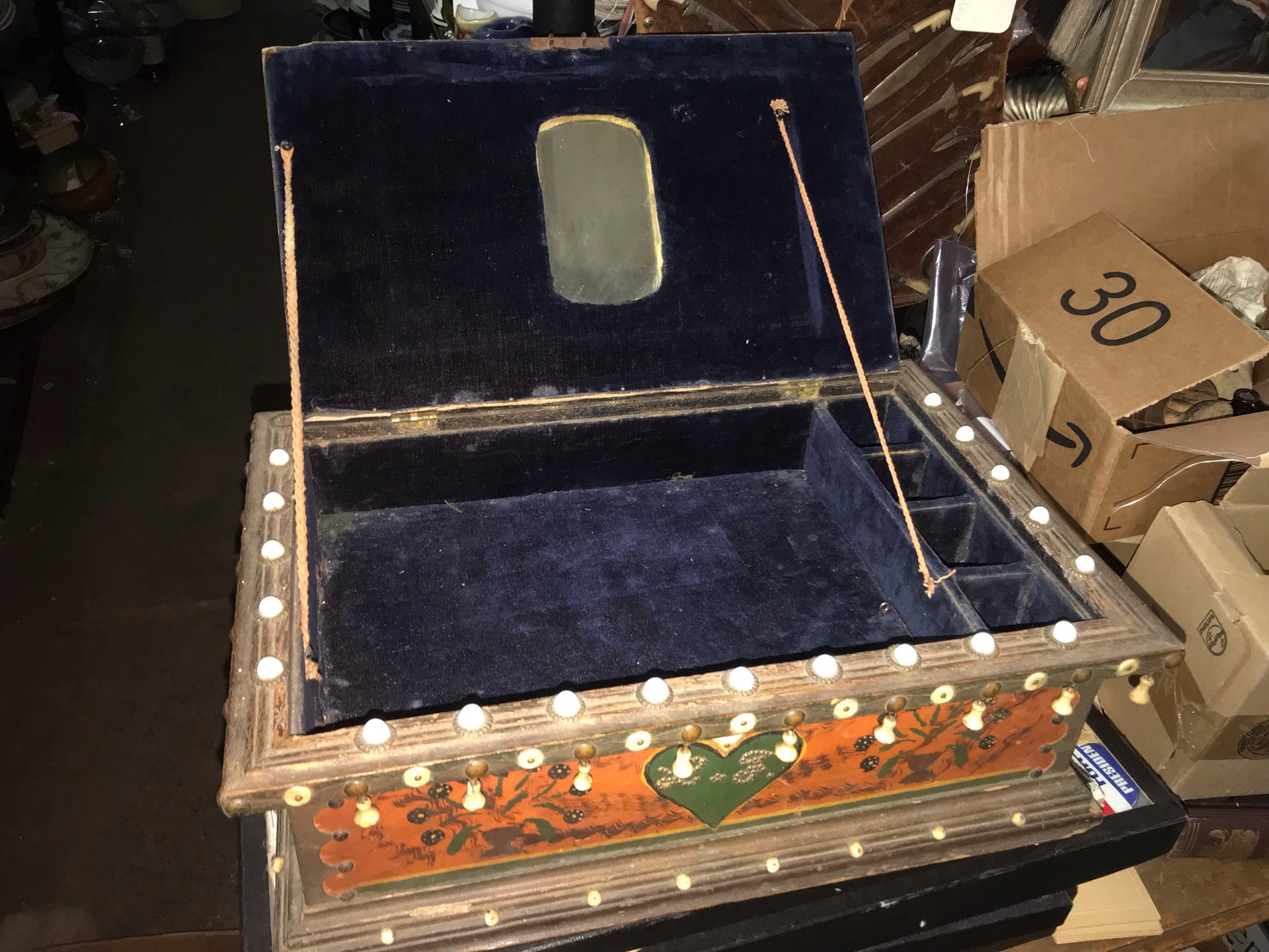 ANTIQUE FOLK ART BOX WITH HEARTS, BIRDS, ETC.