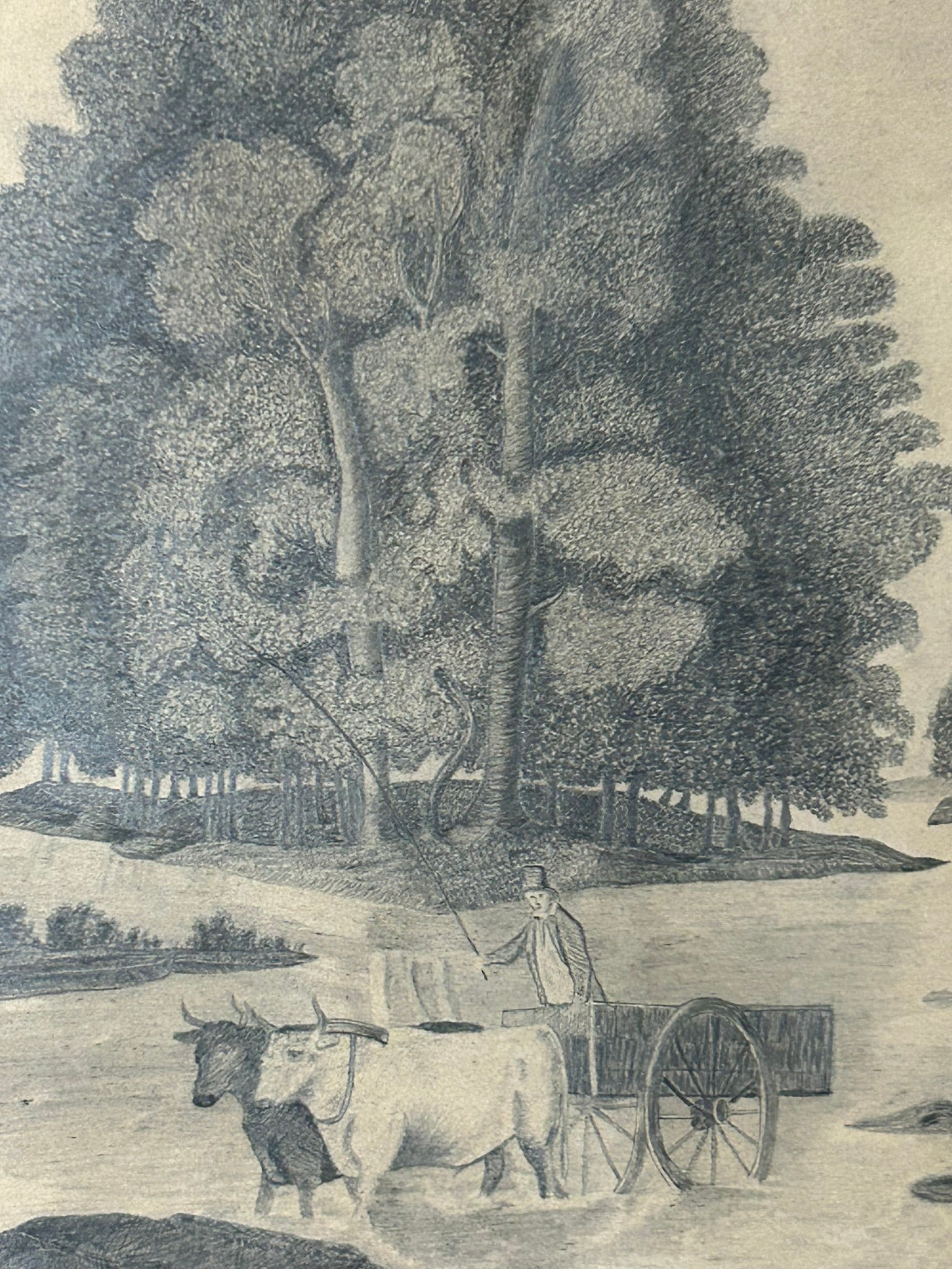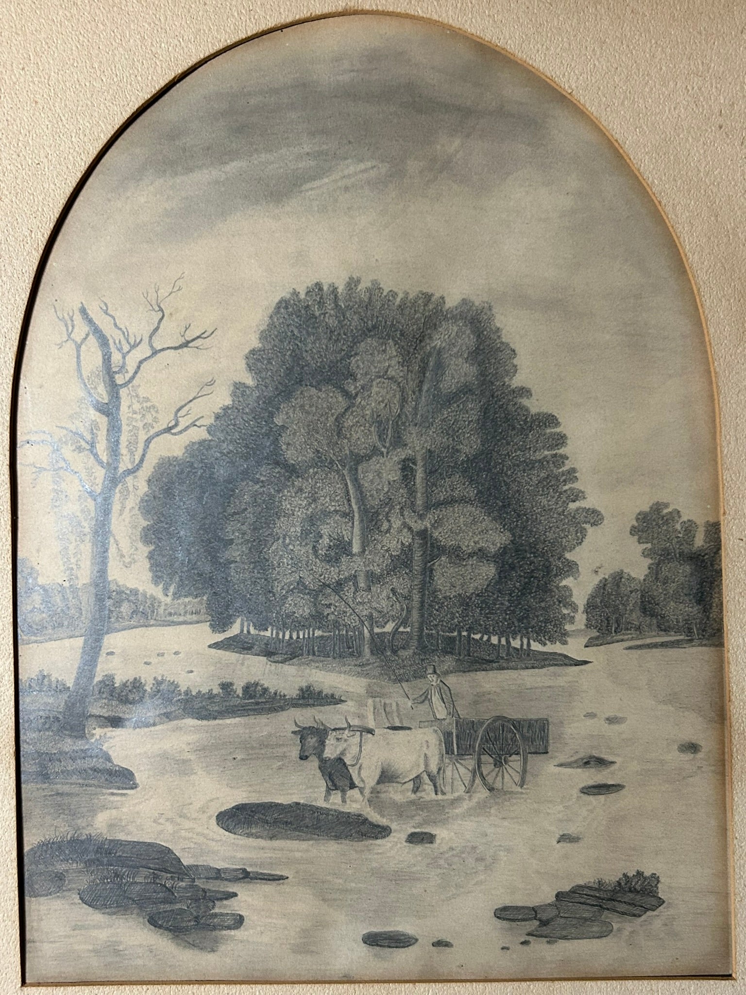 ANTIQUE FOLK ART DRAWING OF OXEN PULLING WAGON 14 1/2" X 11". CALL OR TEXT FOR MORE INFORMATION