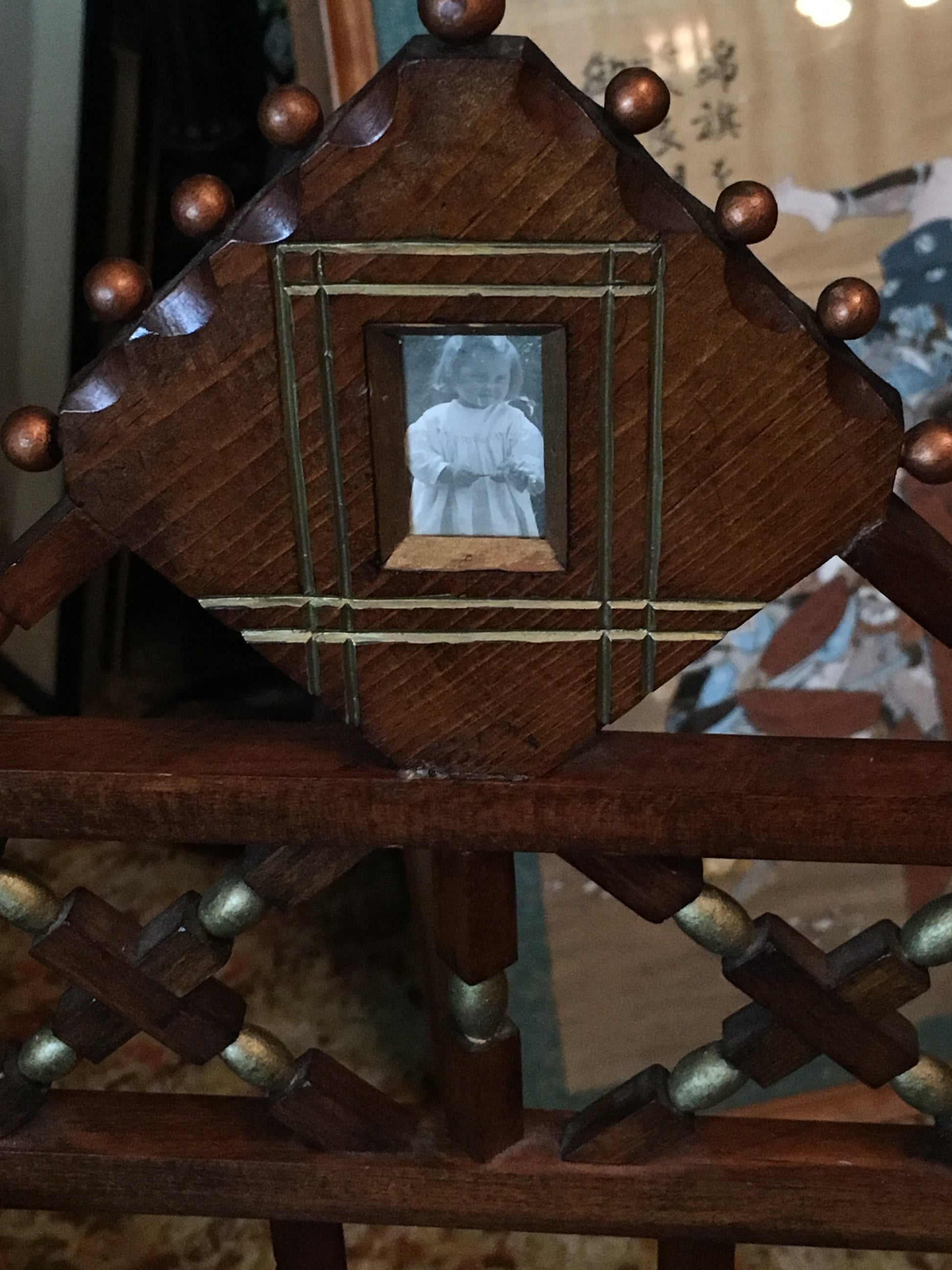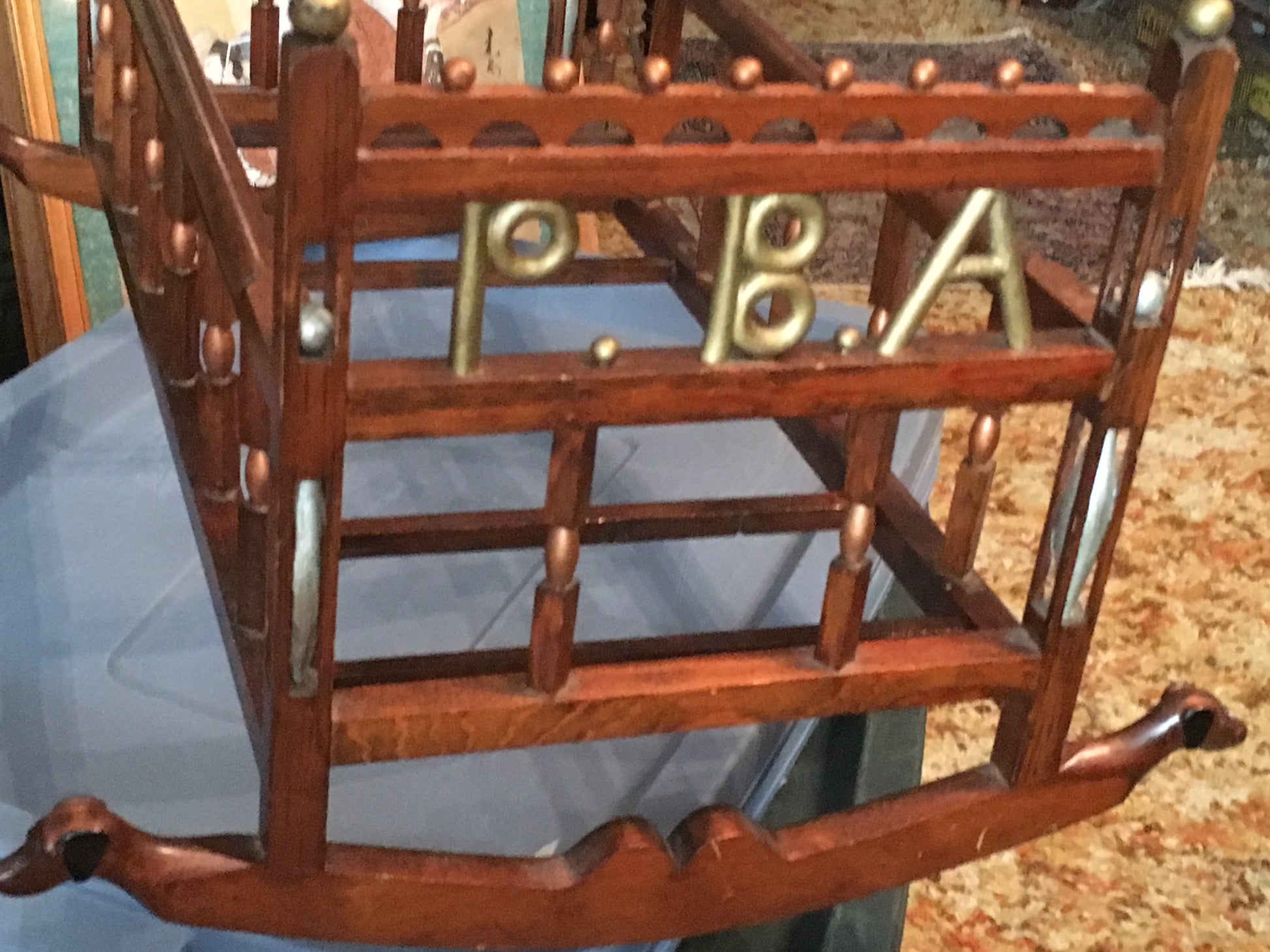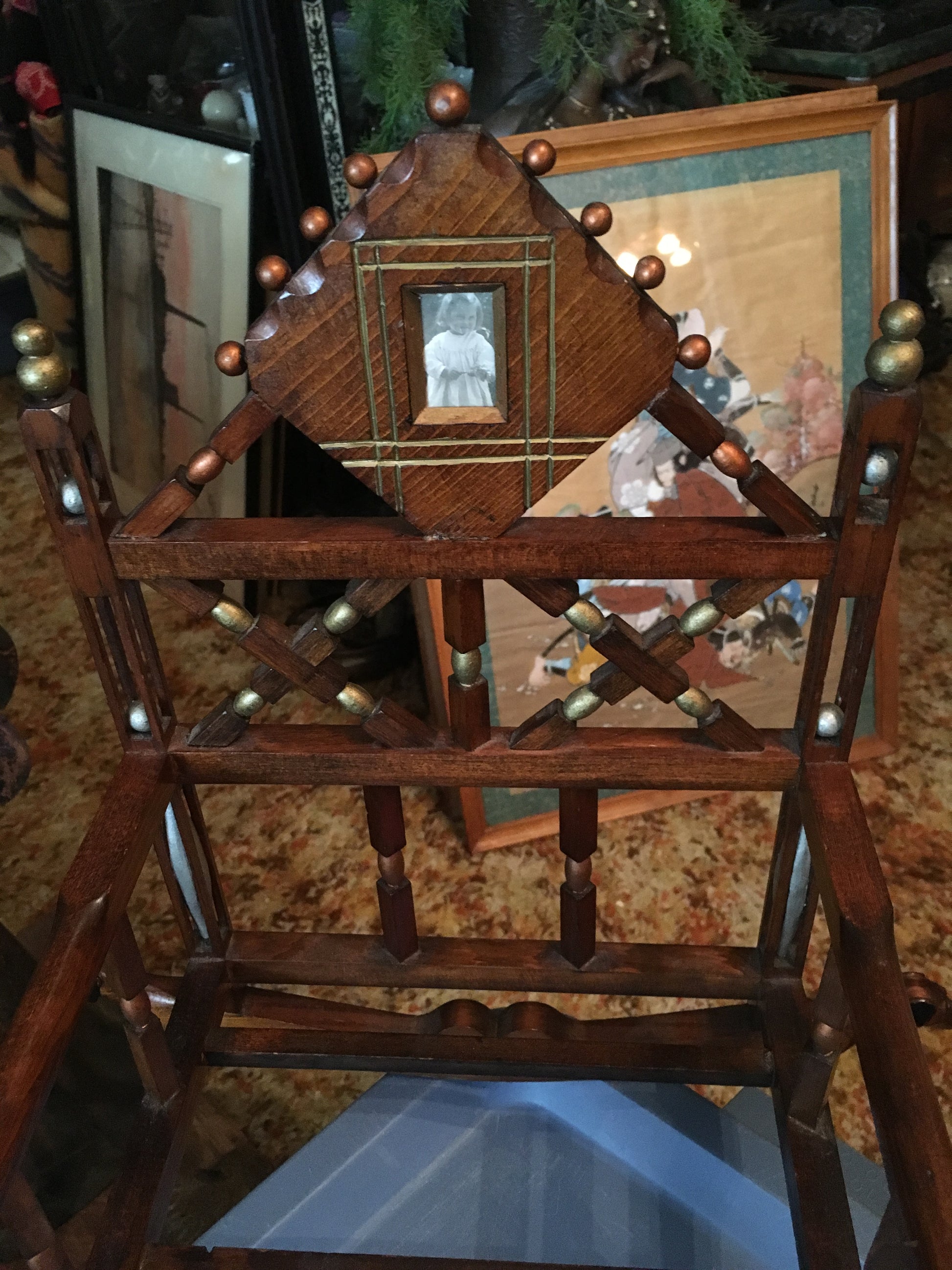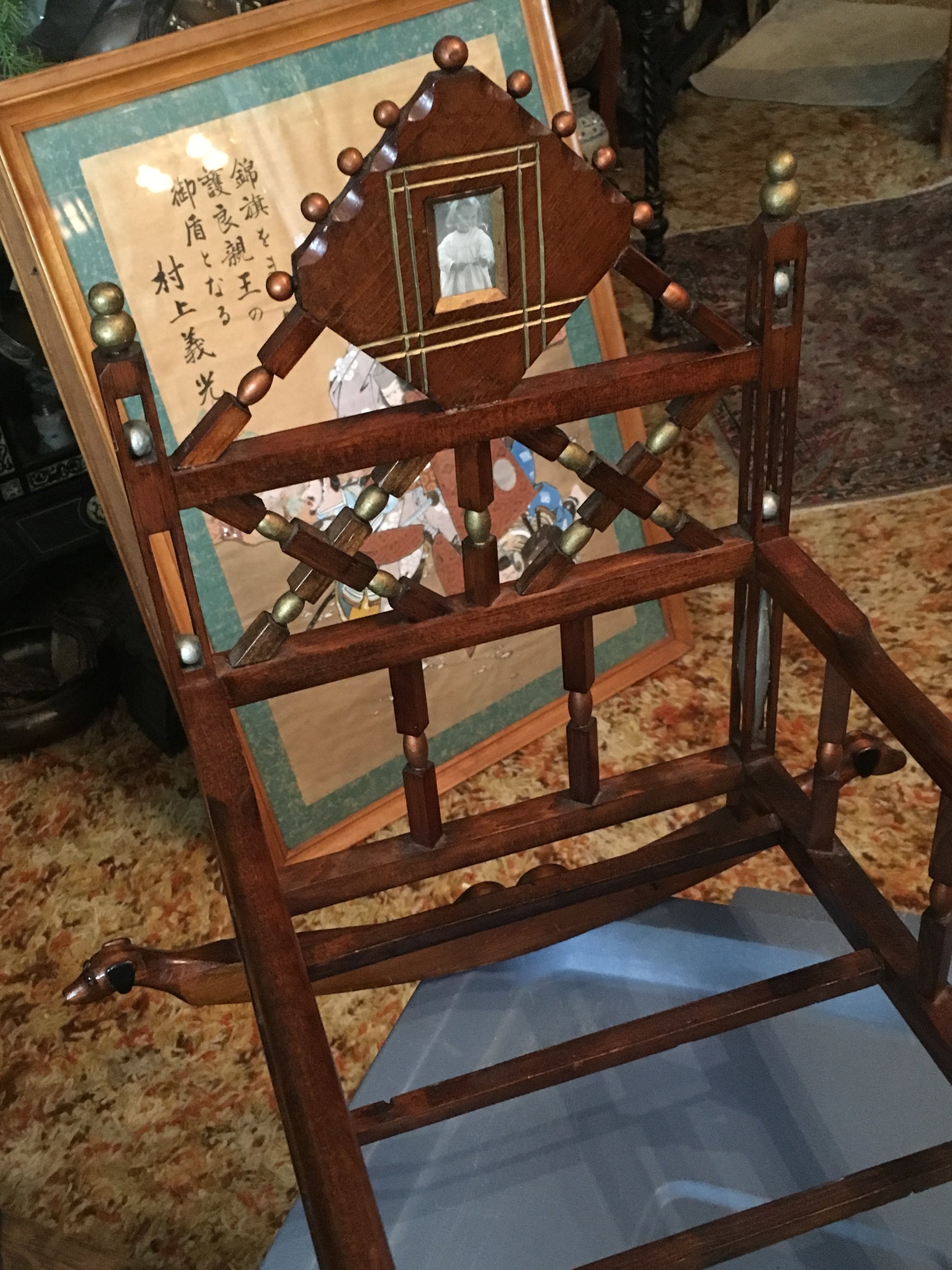 FOLK ART EARLY CARVED WOOD DOLL CRADLE WITH MOVING BALLS IN CAGES, CARVED DOGS. PHOTOS, DATES, ETC. PLUS ALL ORIGINAL AND IN GREAT SHAPE. CALL, TEXT, OR E-MAIL FOR MORE INFORMATION
