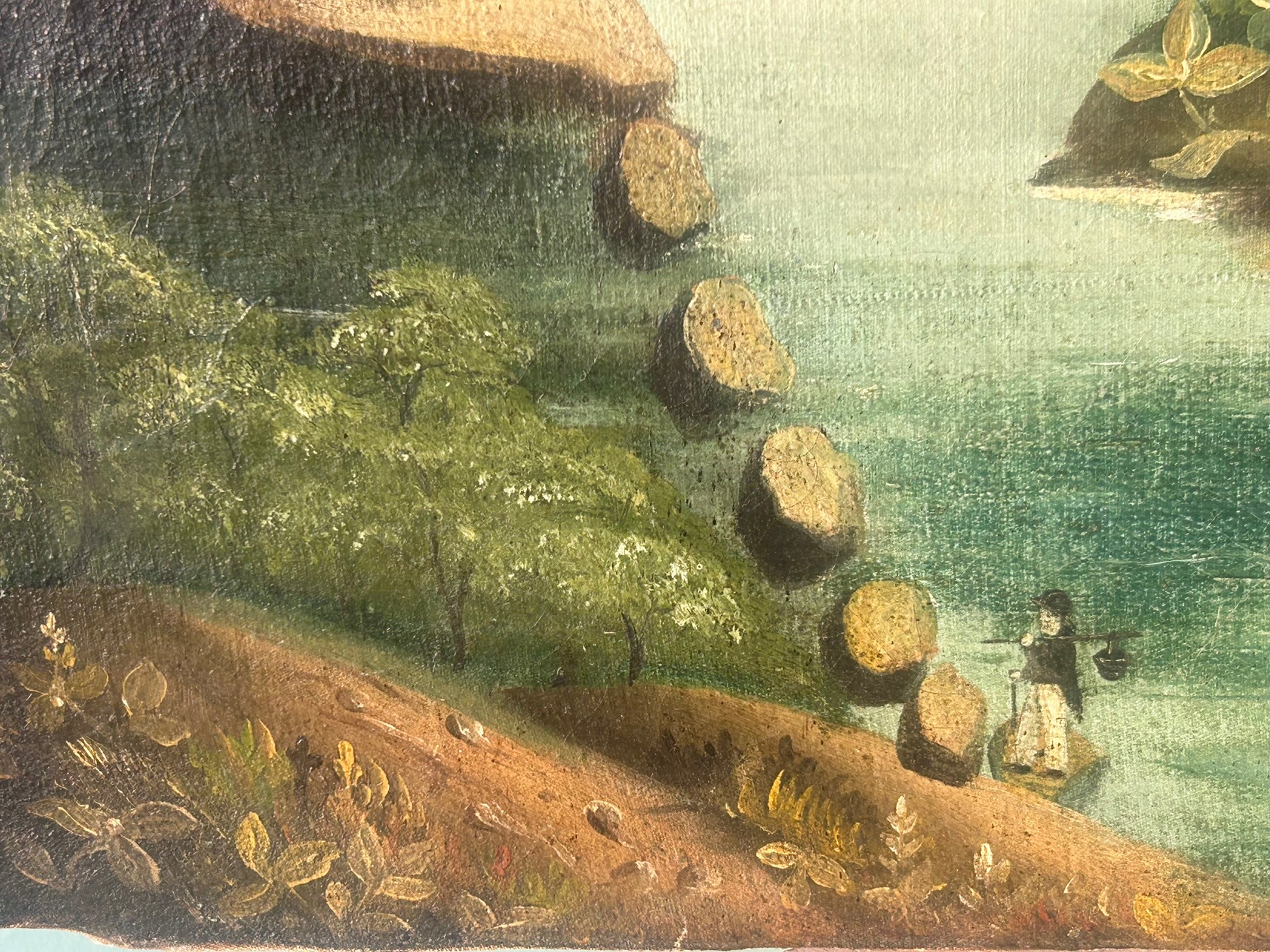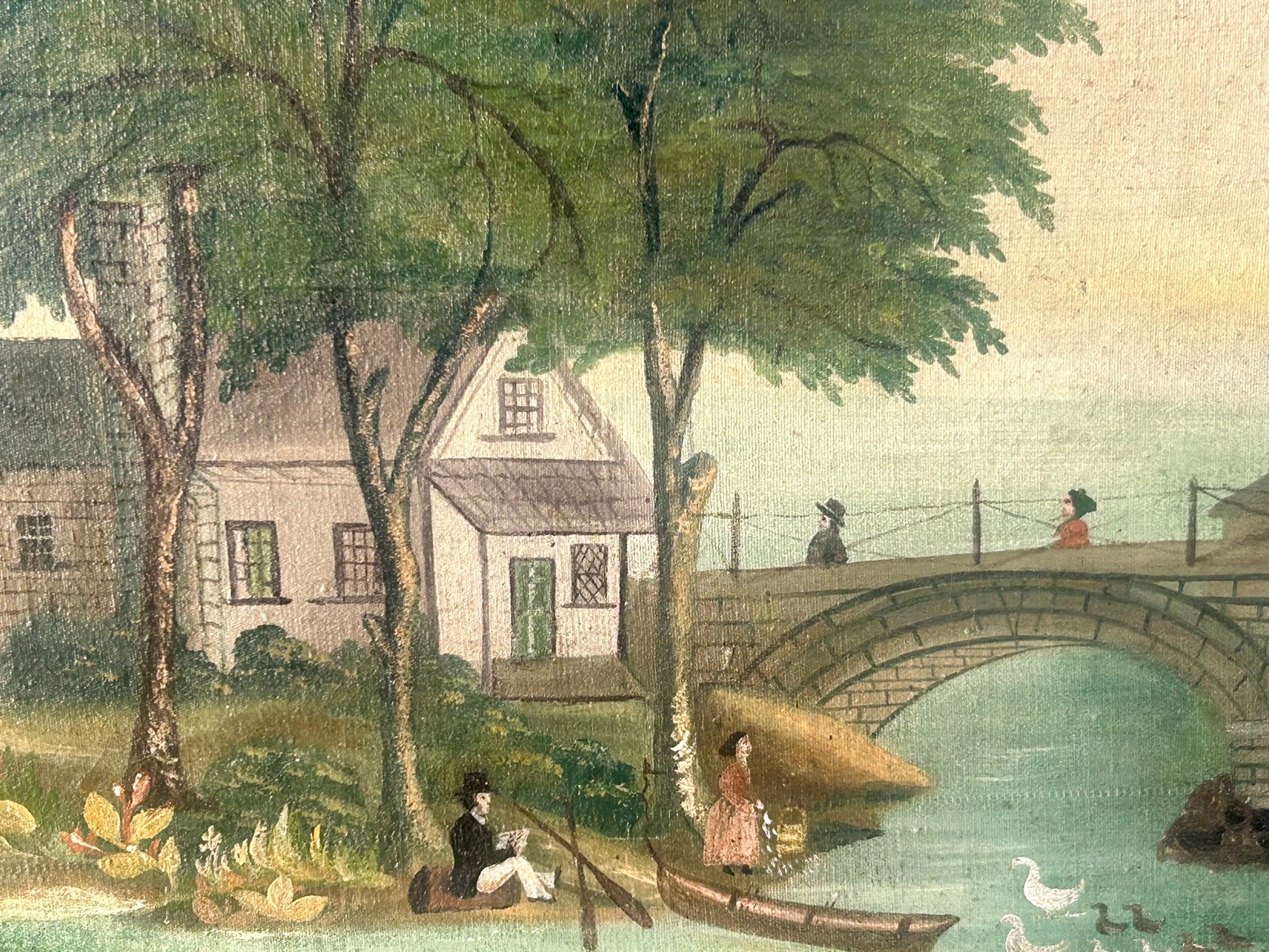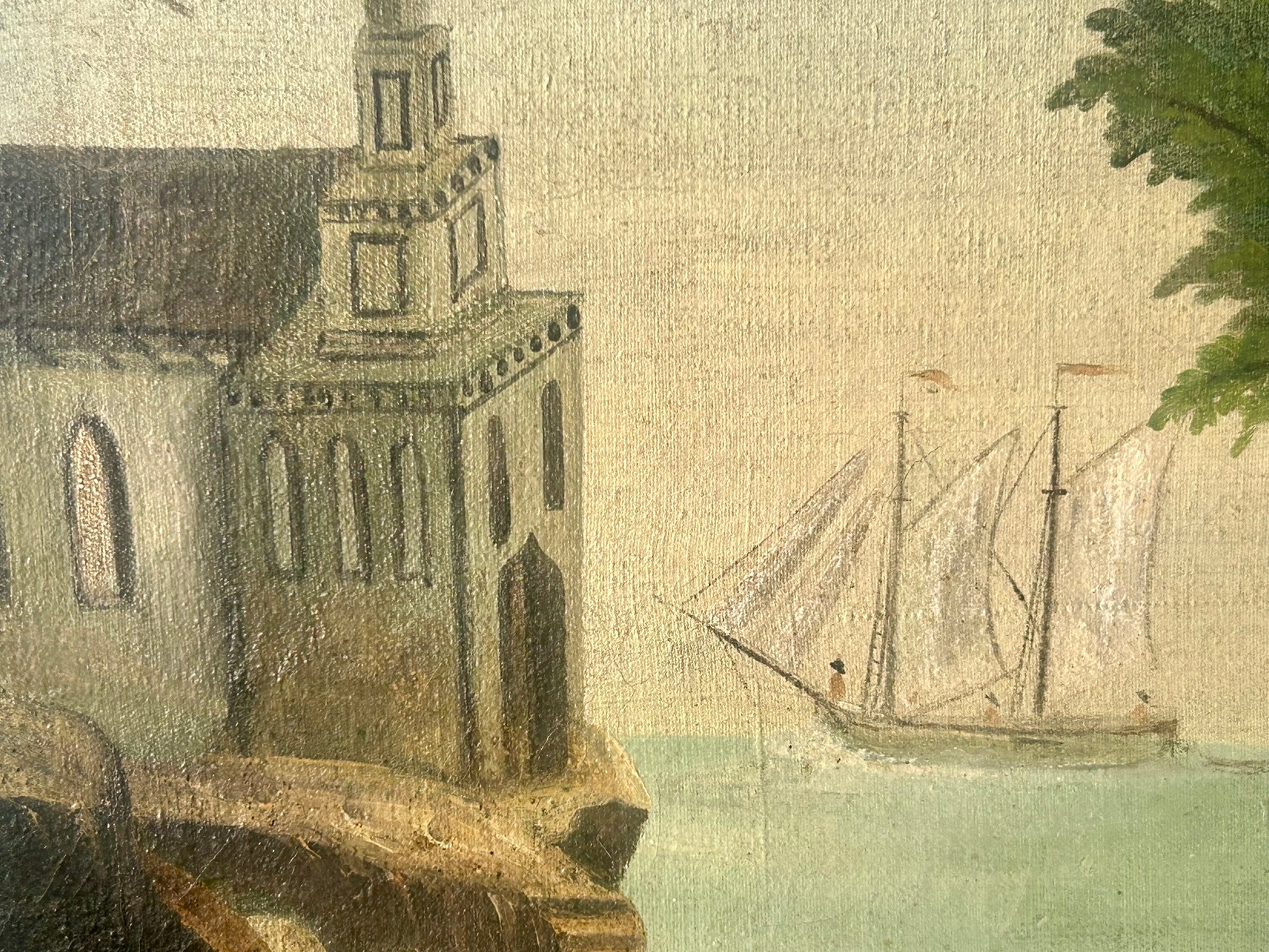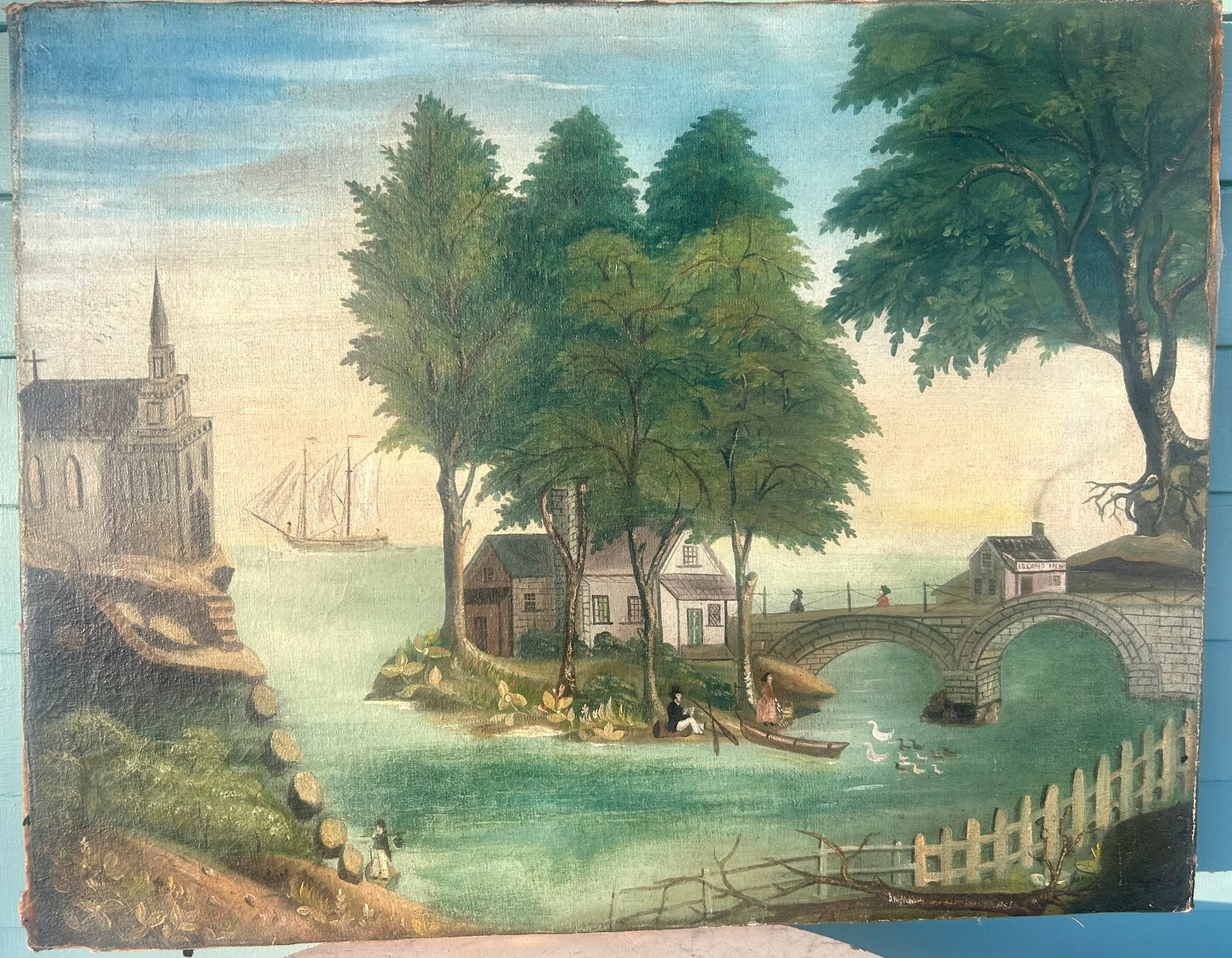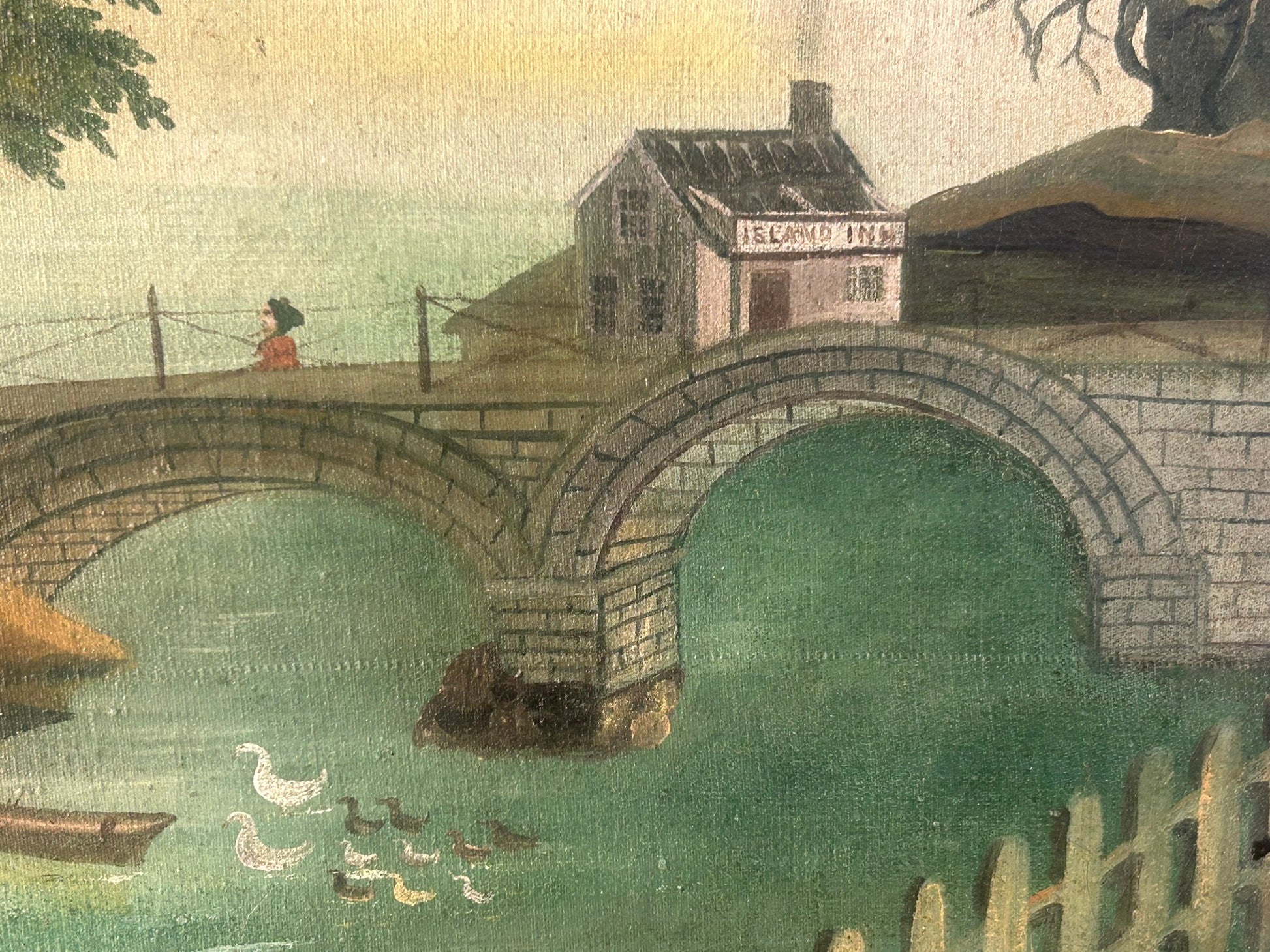 FOLK ART "ISLAND INN" PAINTING WITH SHIP, PEOPLE & BUILDINGS 1800's 24" X 29"
