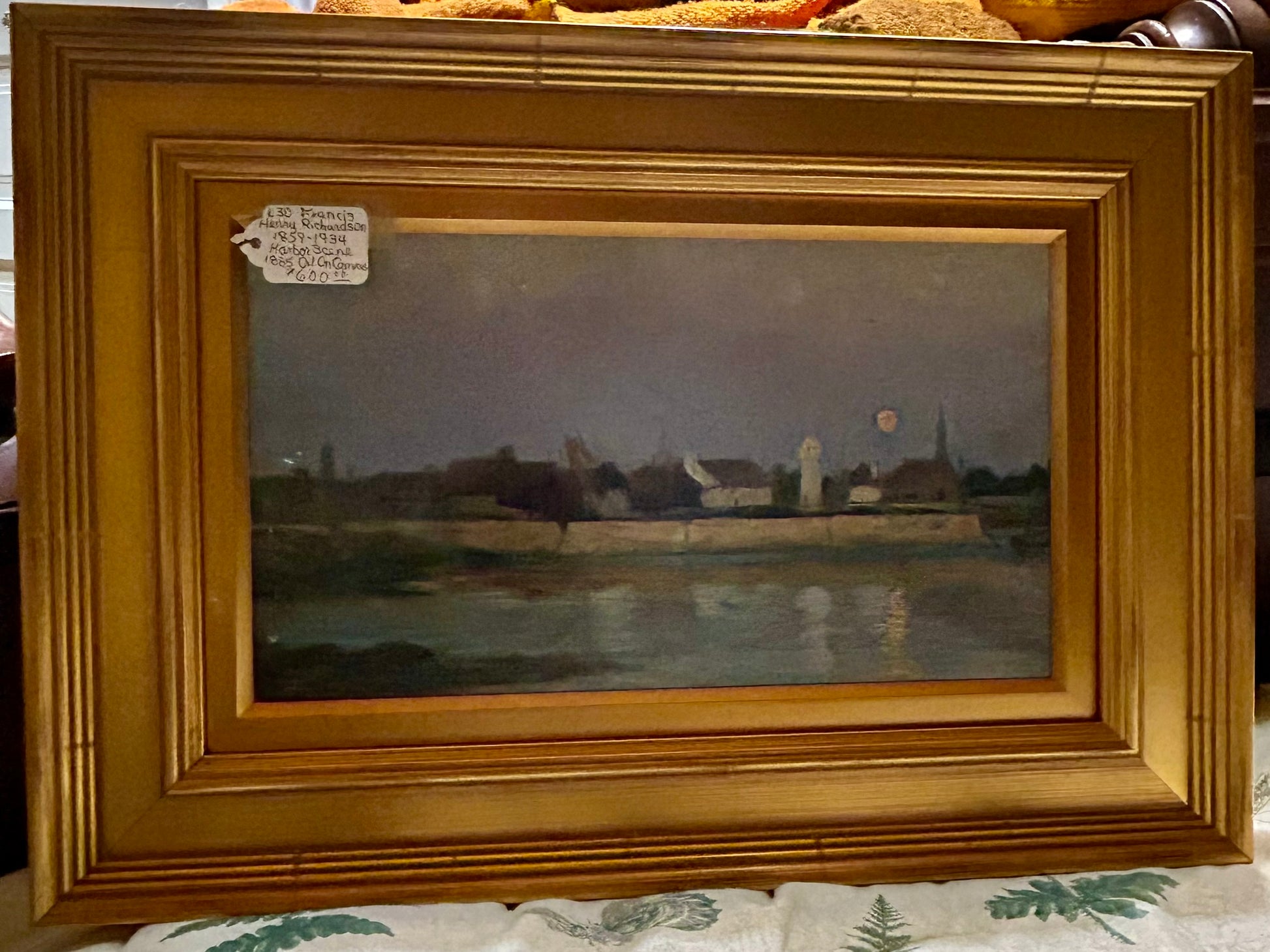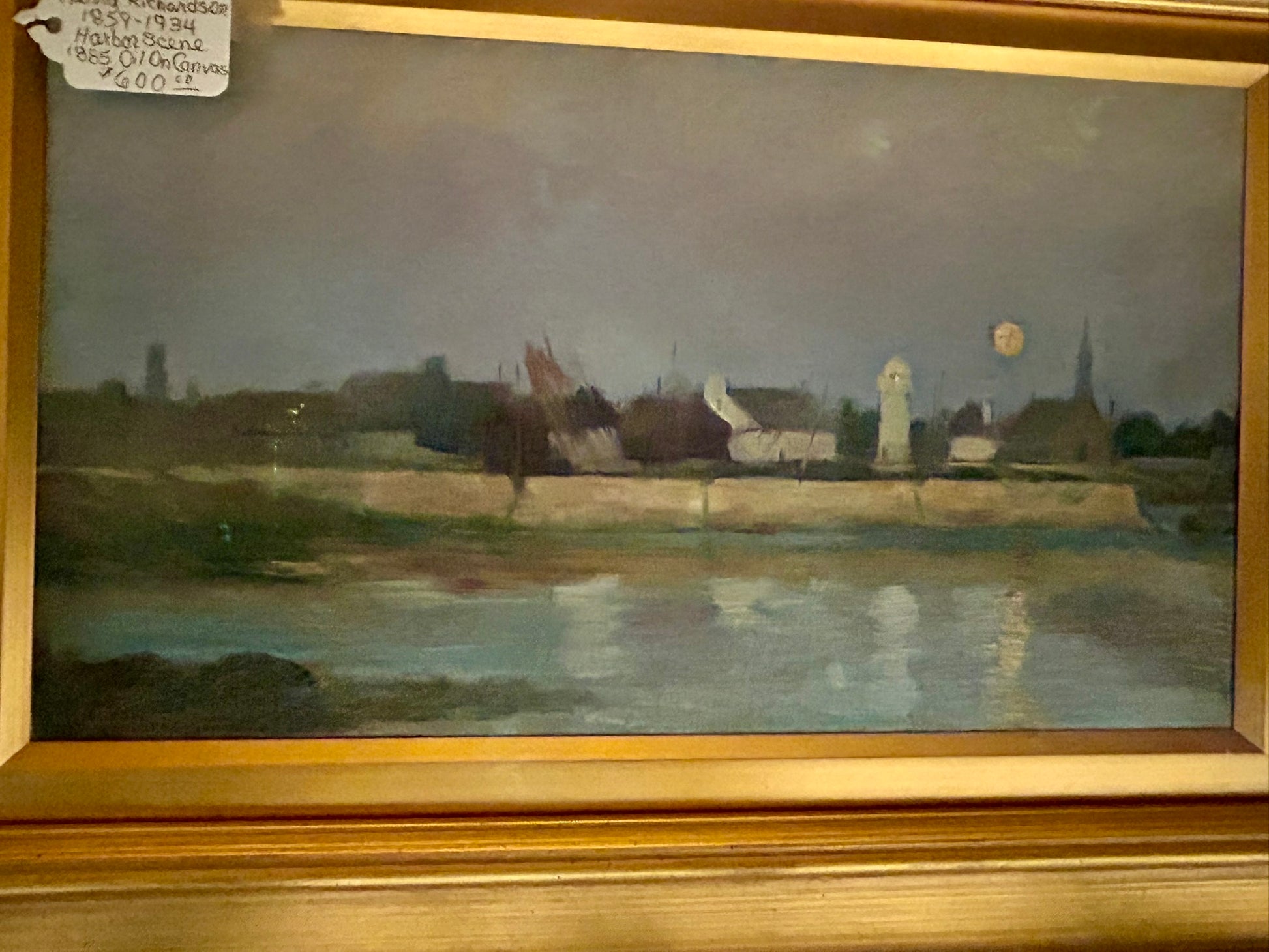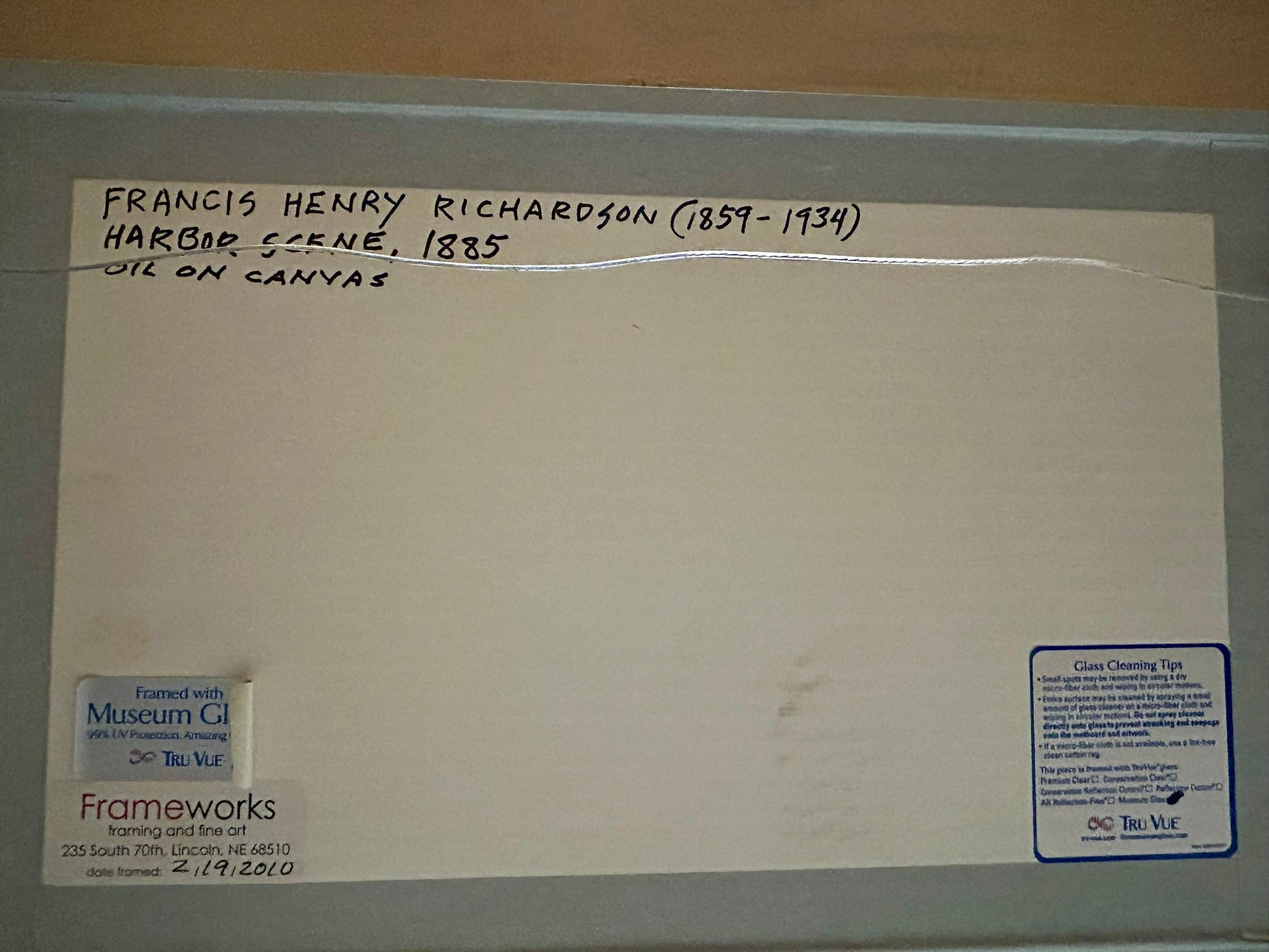 Francis Henry Richardson 1859-1934. Harbor Scene Dated 1885 oil on canvas 12" x 17 1/2 " overall, image only 8 1/2" x 14" .