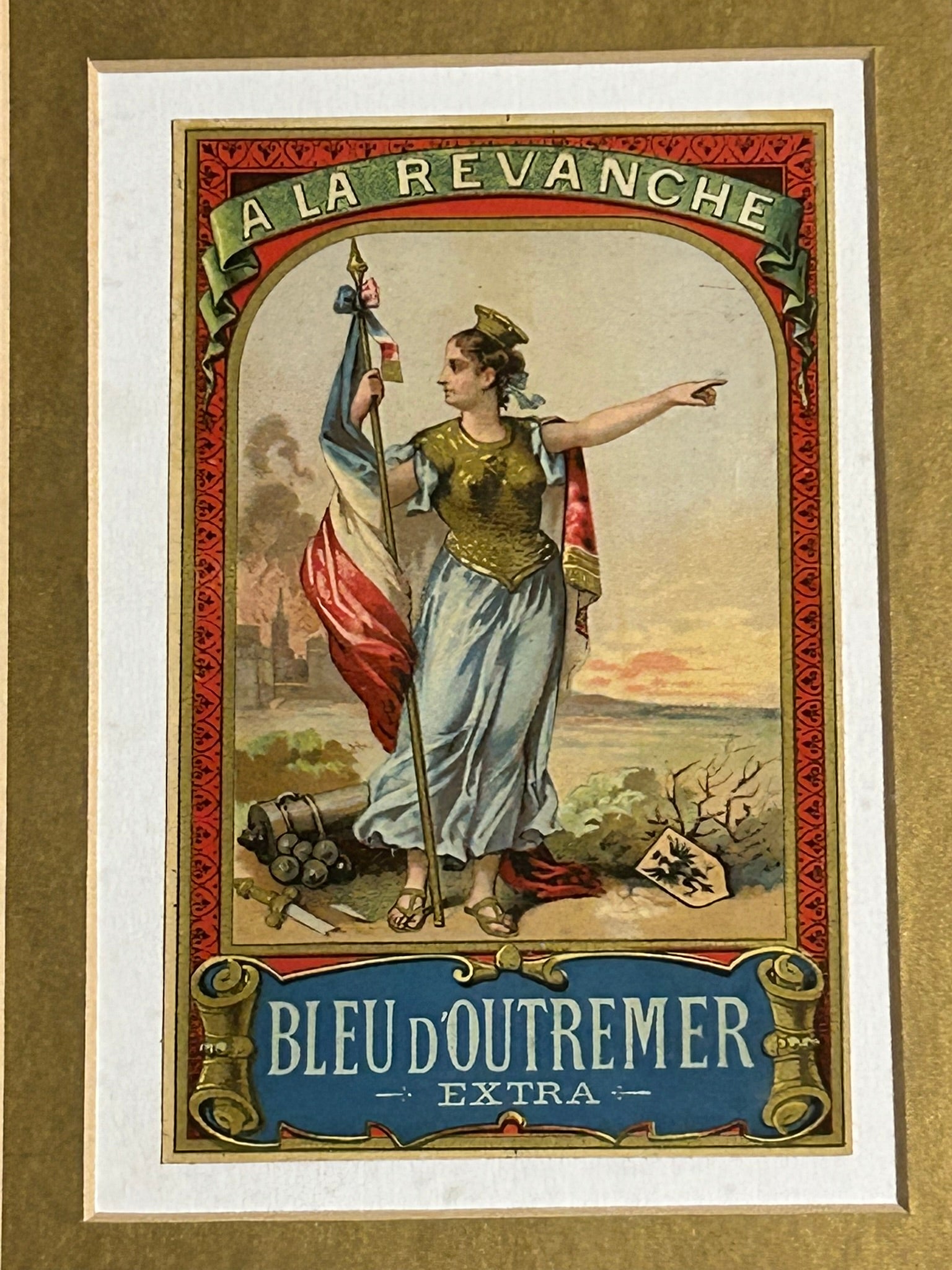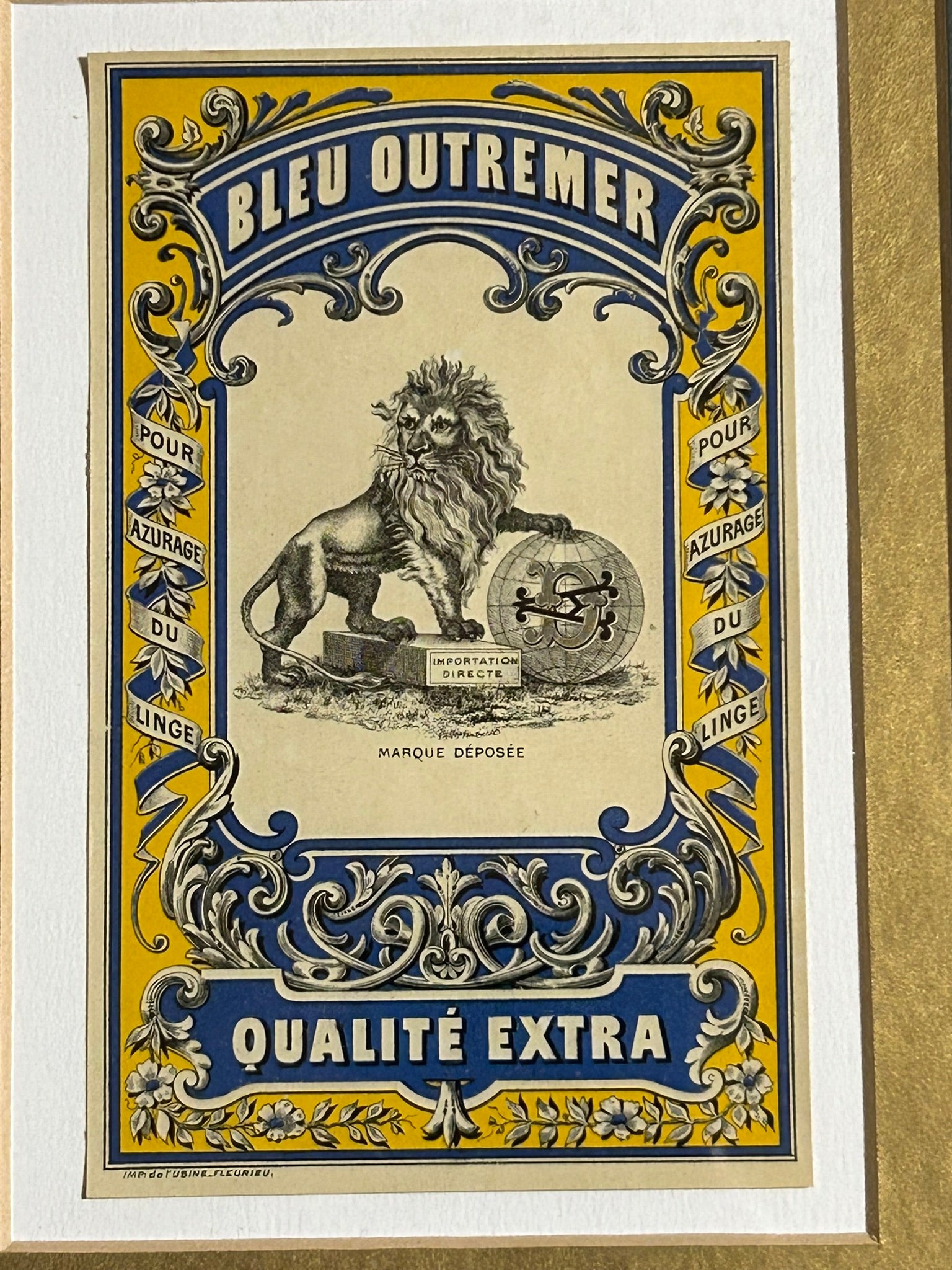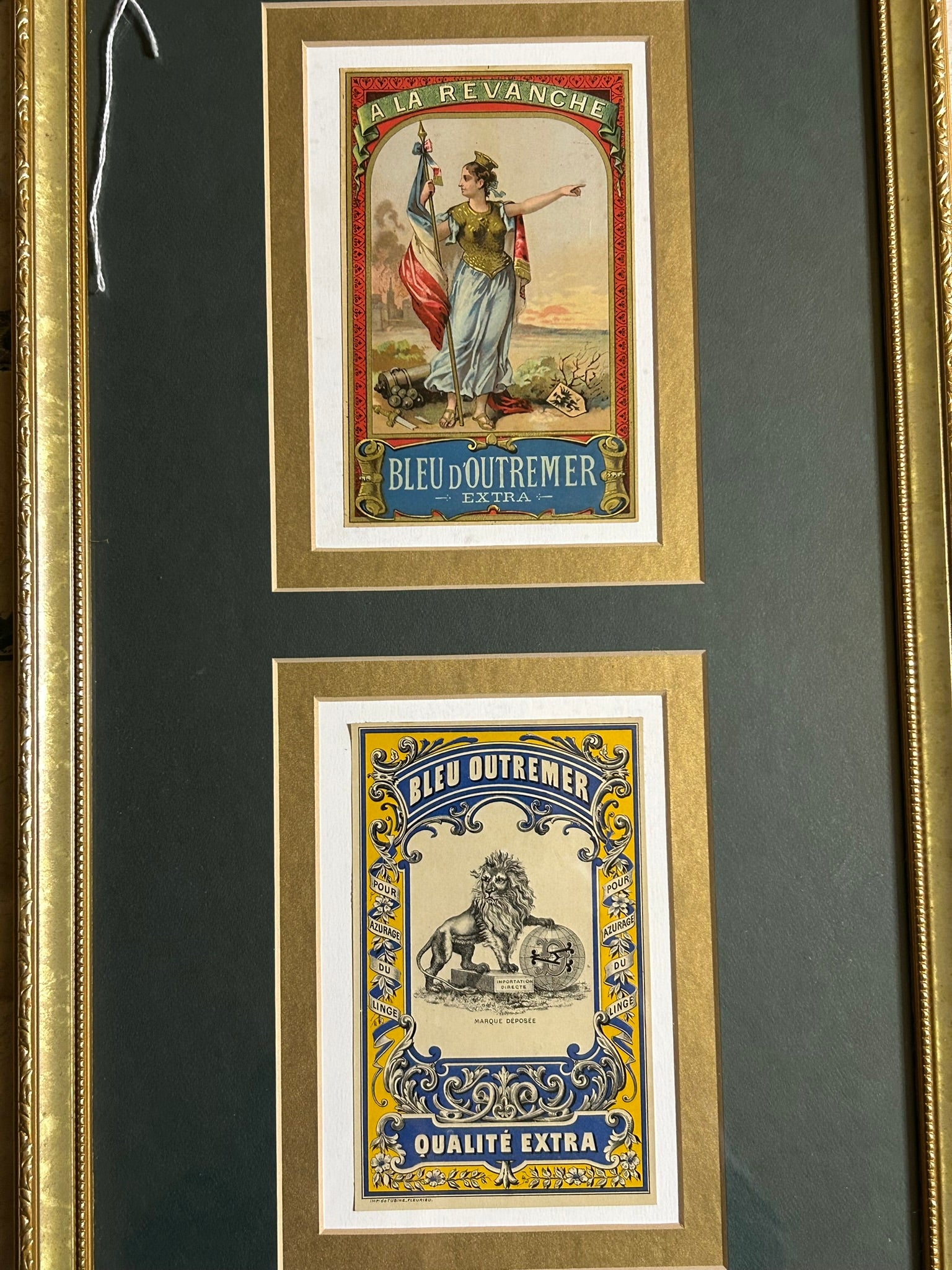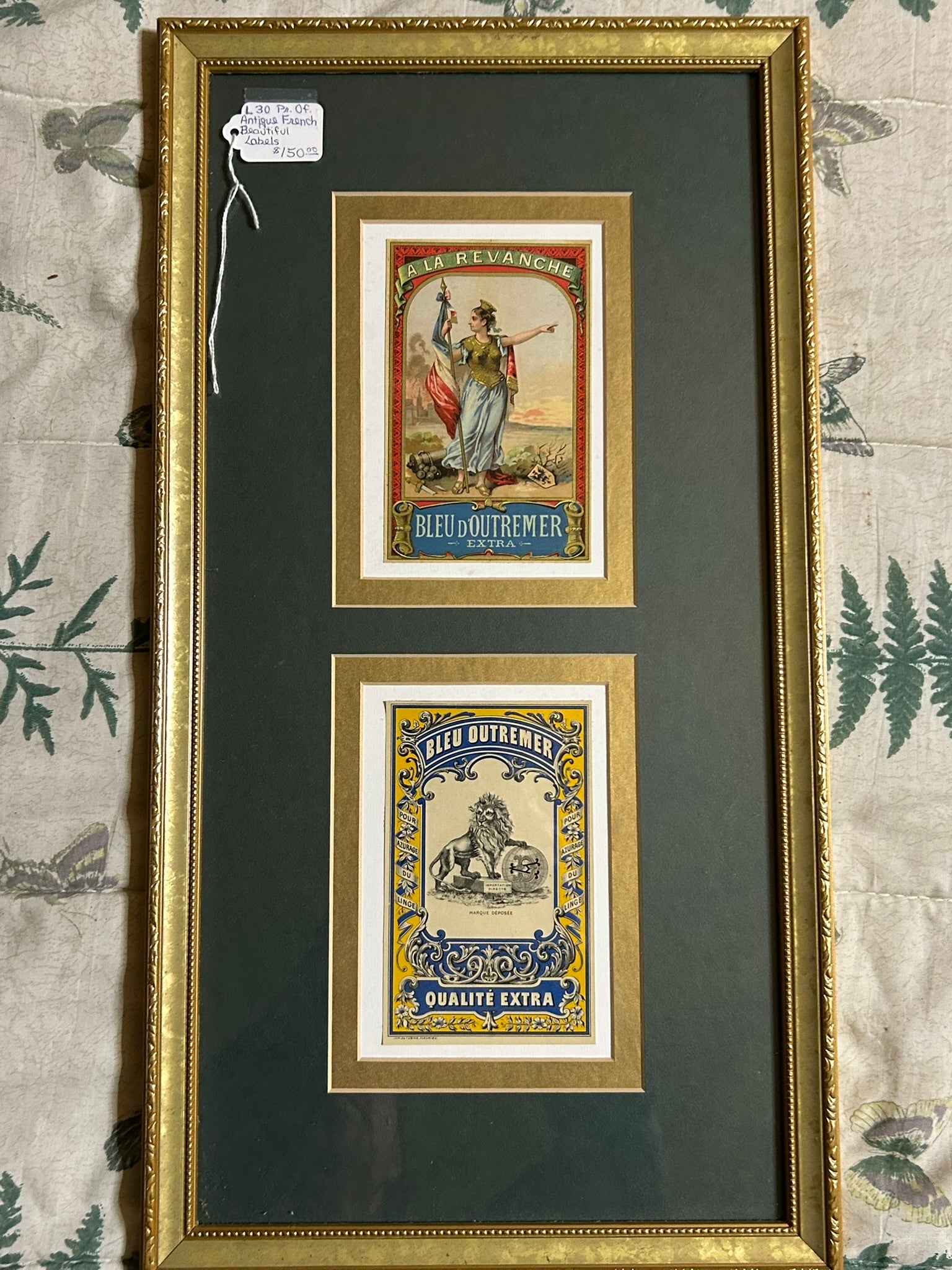 PAIR OF FANCY FRENCH ANTIQUE LABELS FRAMED TOTAL SIZE 21 X 11". CALL OR TEXT FOR MORE INFORMATION