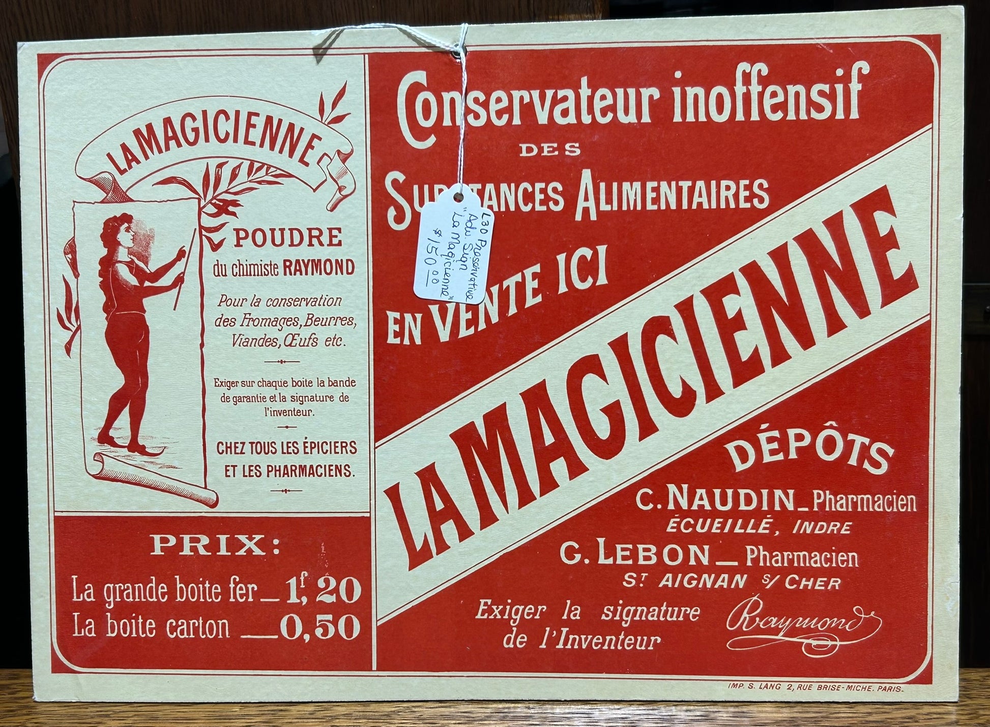 FRENCH PRESERVATIVE ADVERTISING CARDBOARD SIGN "LA MAGICIENNE", 10" X 14". PLEASE CALL, TEXT, OR E-MAIL FOR MORE INFORMATION