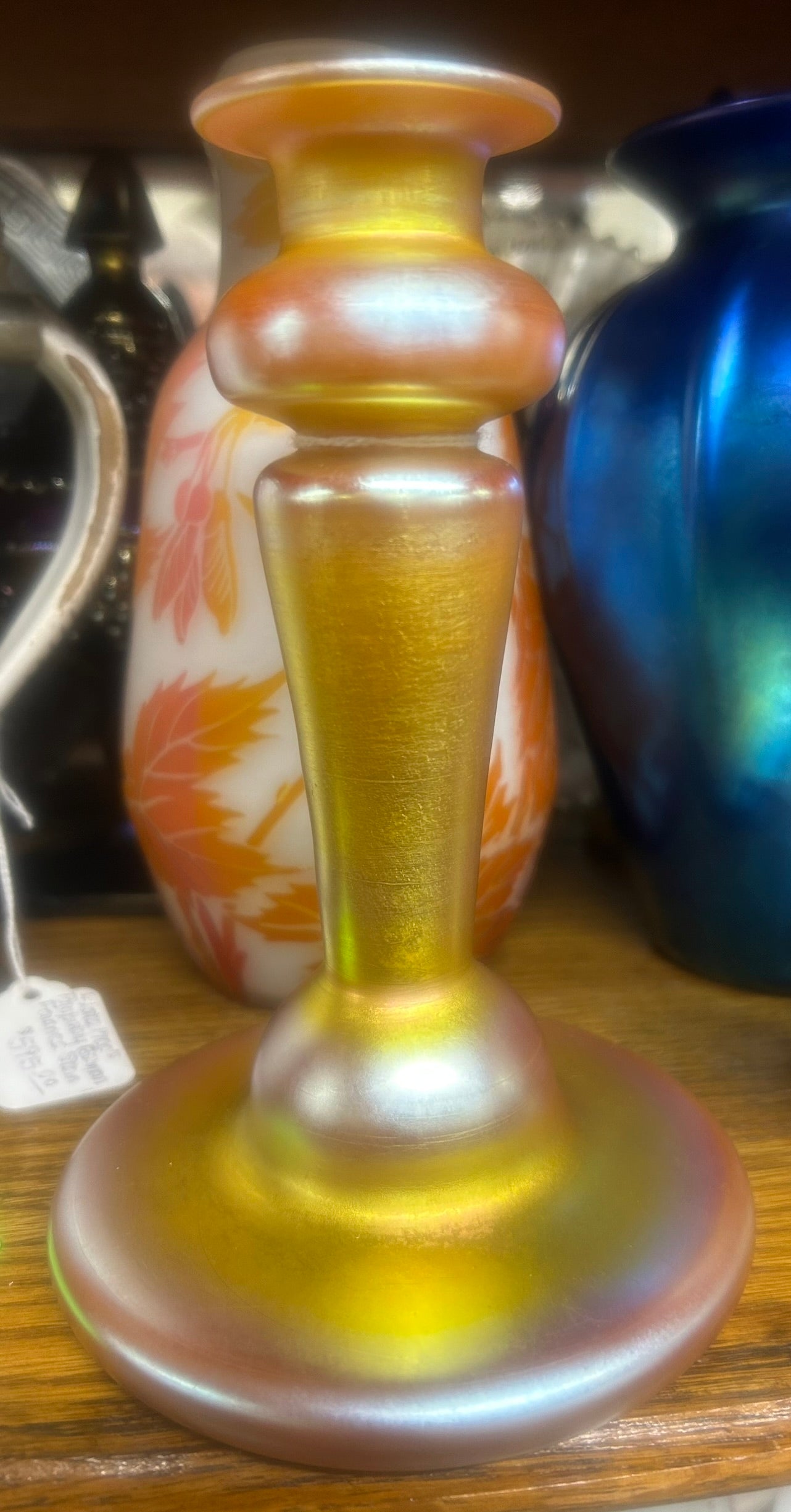 GOLD IRRIDESCENT GLASS ANTIQUE VASE OR CANDLESTICK 7" TALL. CALL OR TEXT FOR MORE INFORMATION