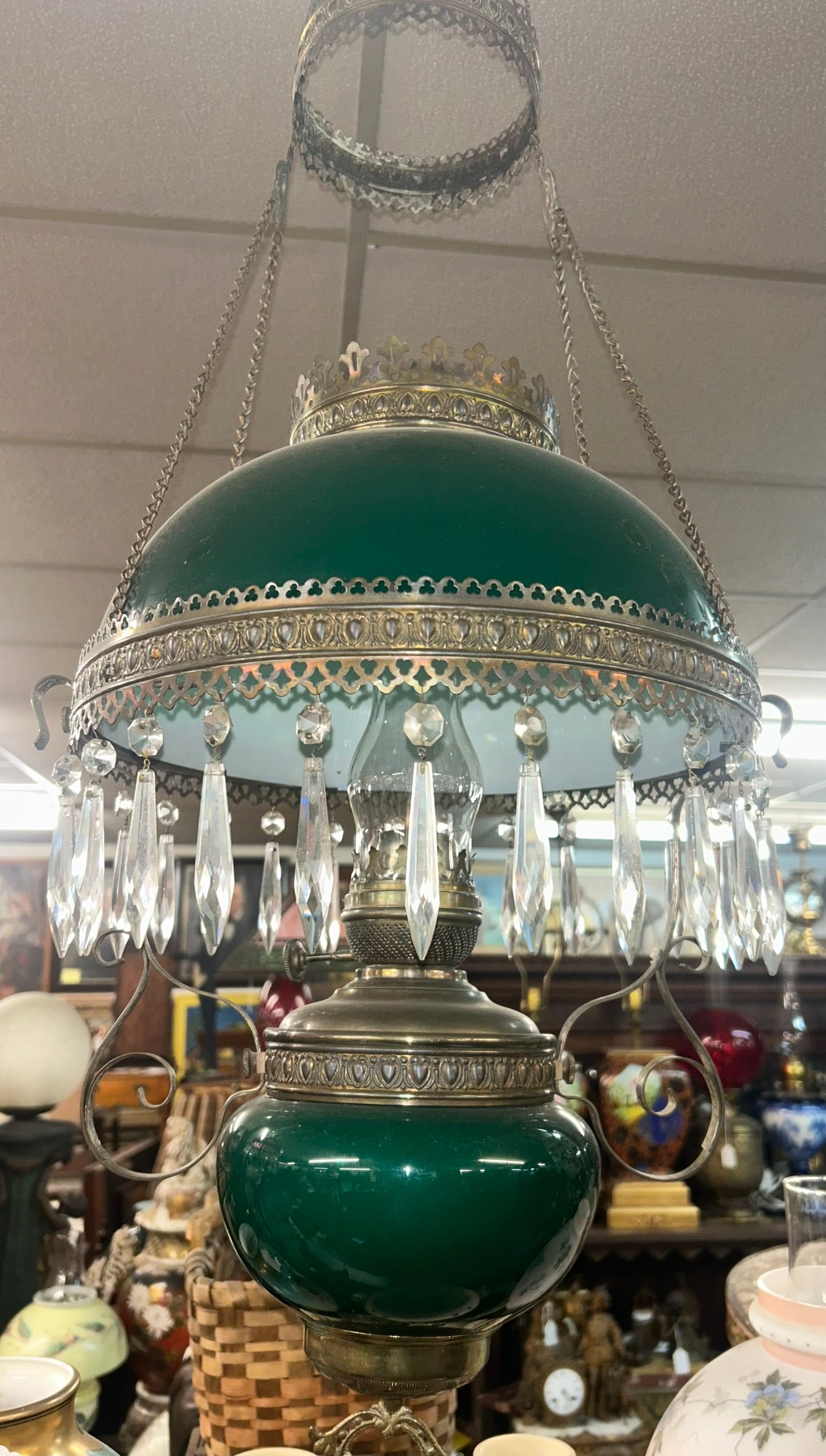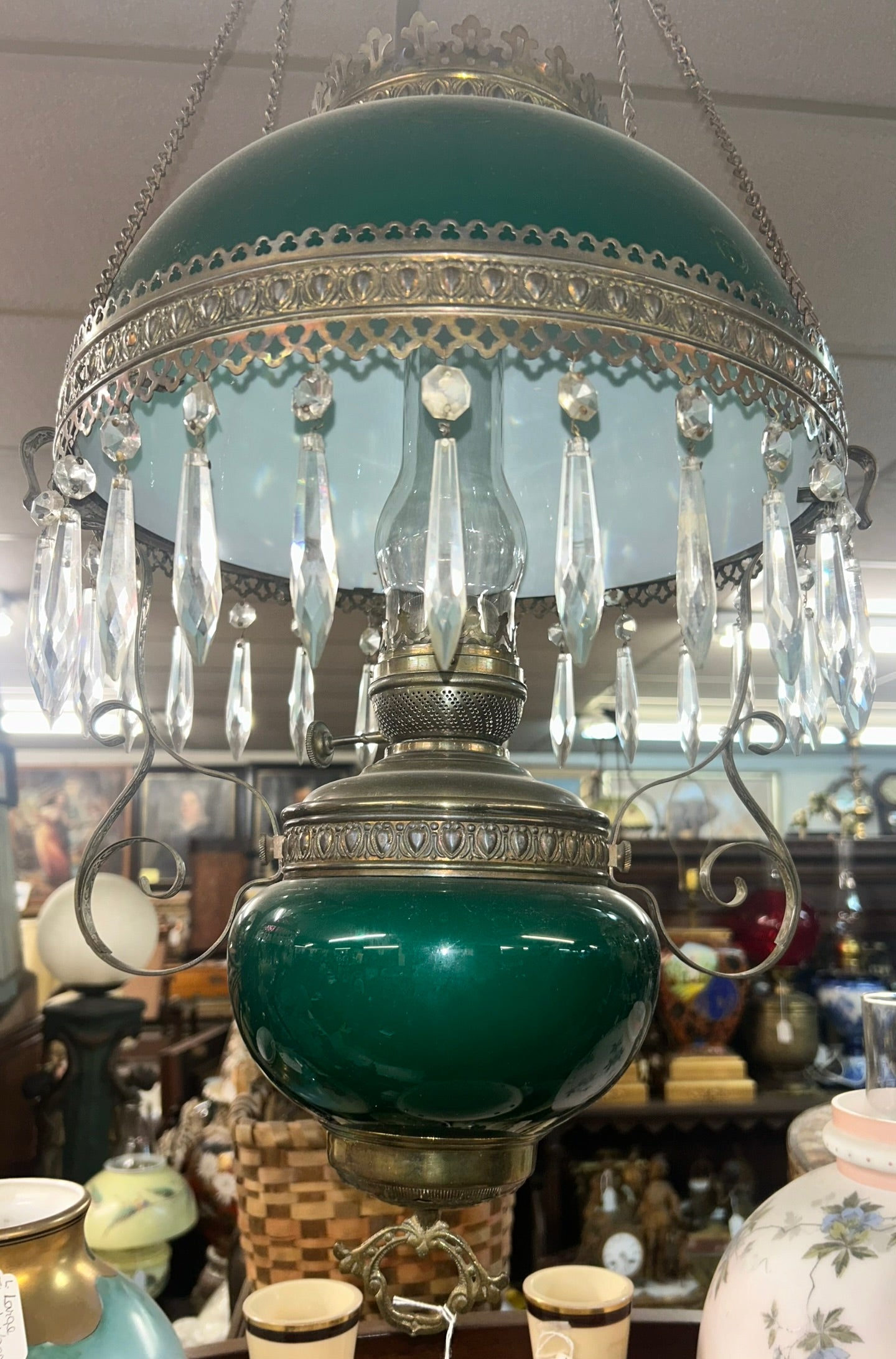 GREEN EMERLITE SHADE HANGING ANTIQUE KEREOSCENE LIBRARY LAMP. CALL OR TEXT FOR MORE INFORMATION