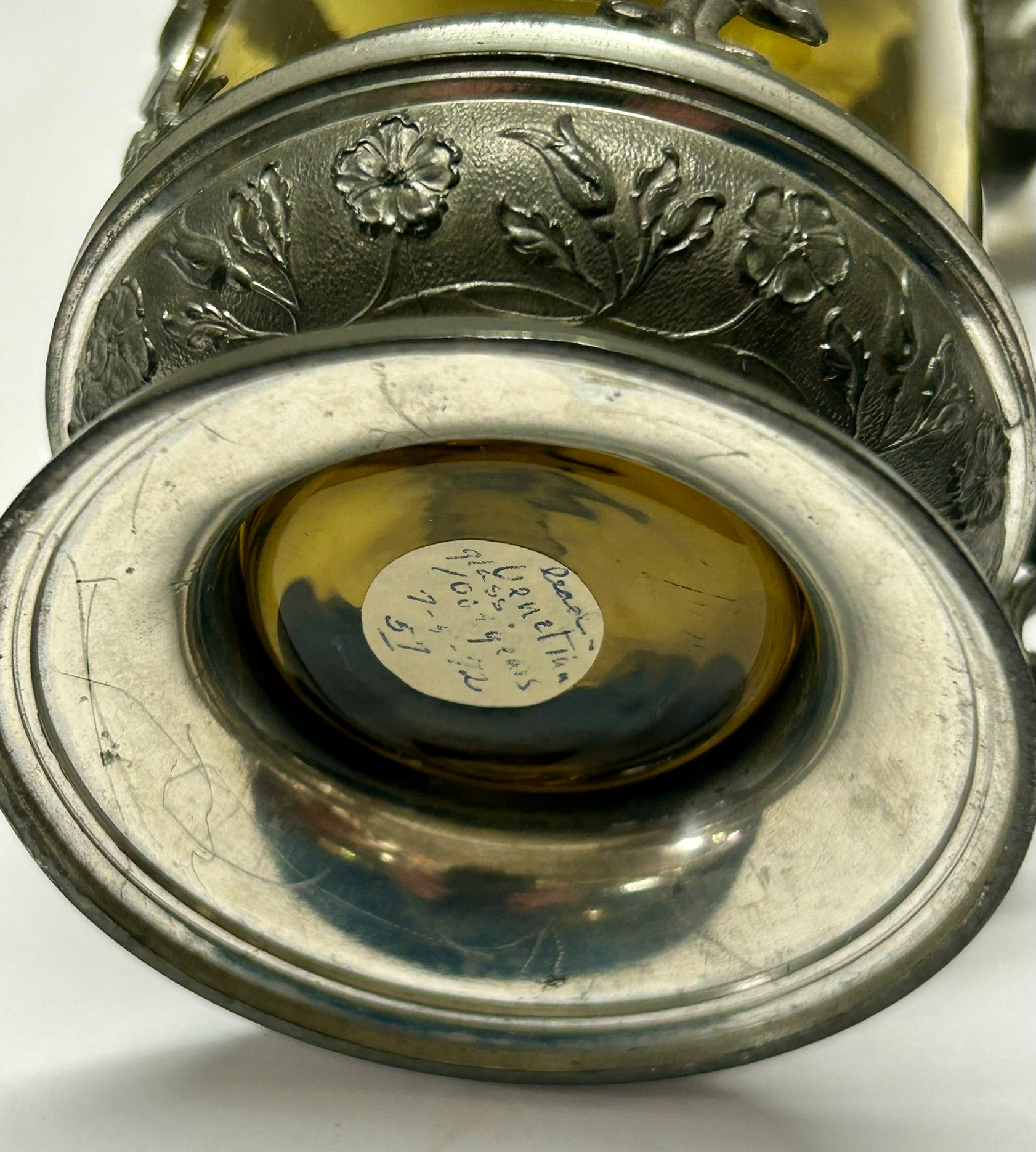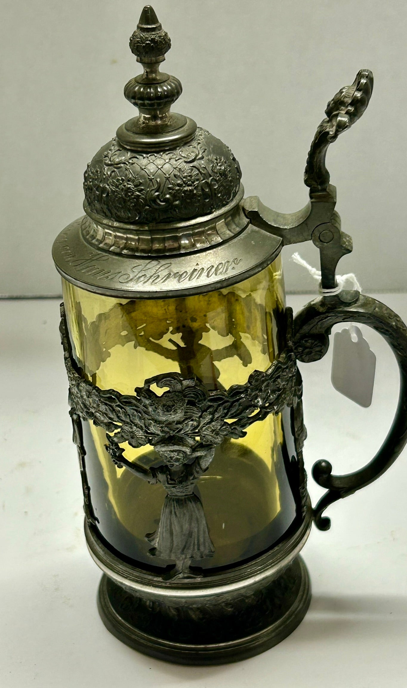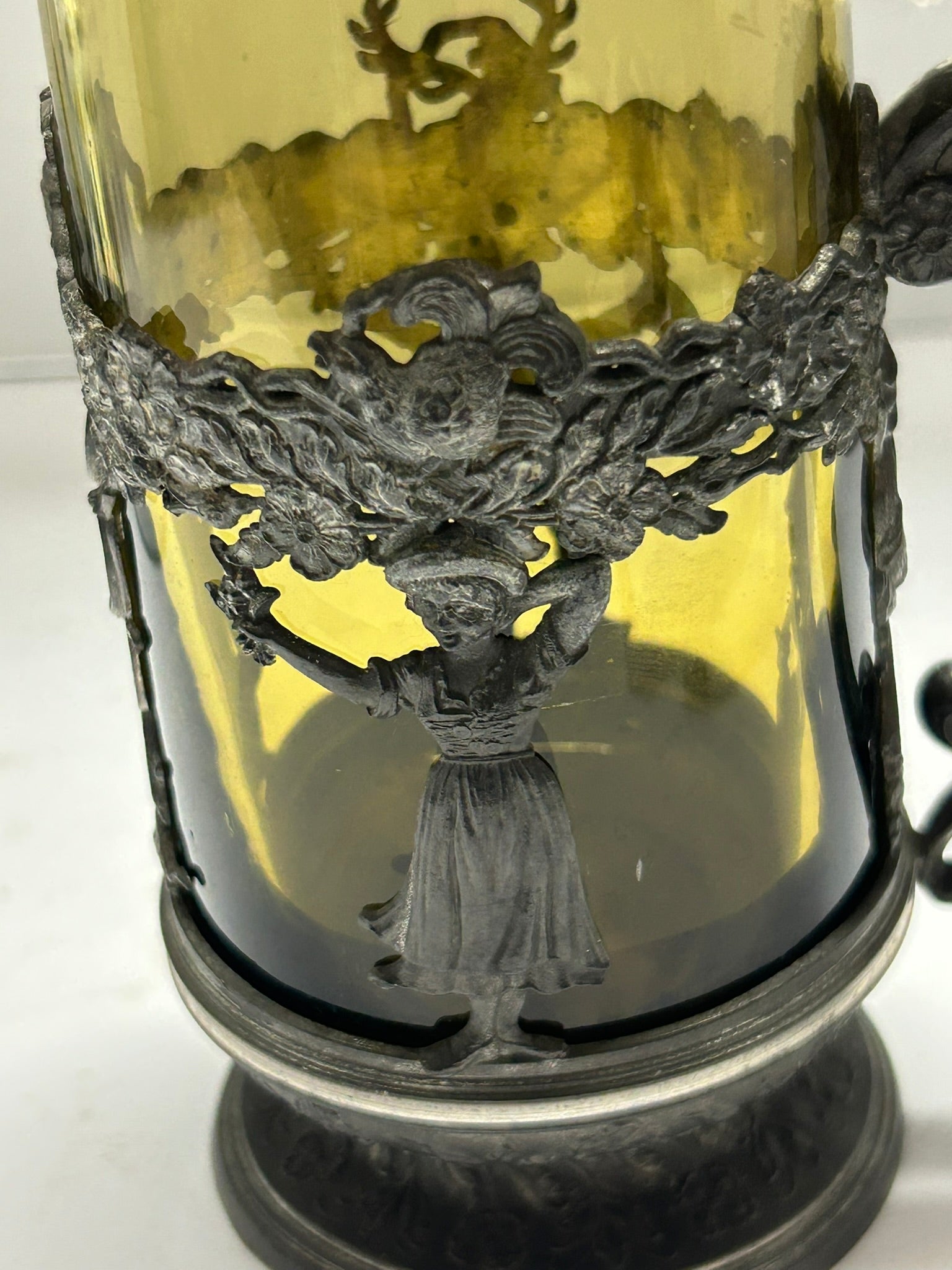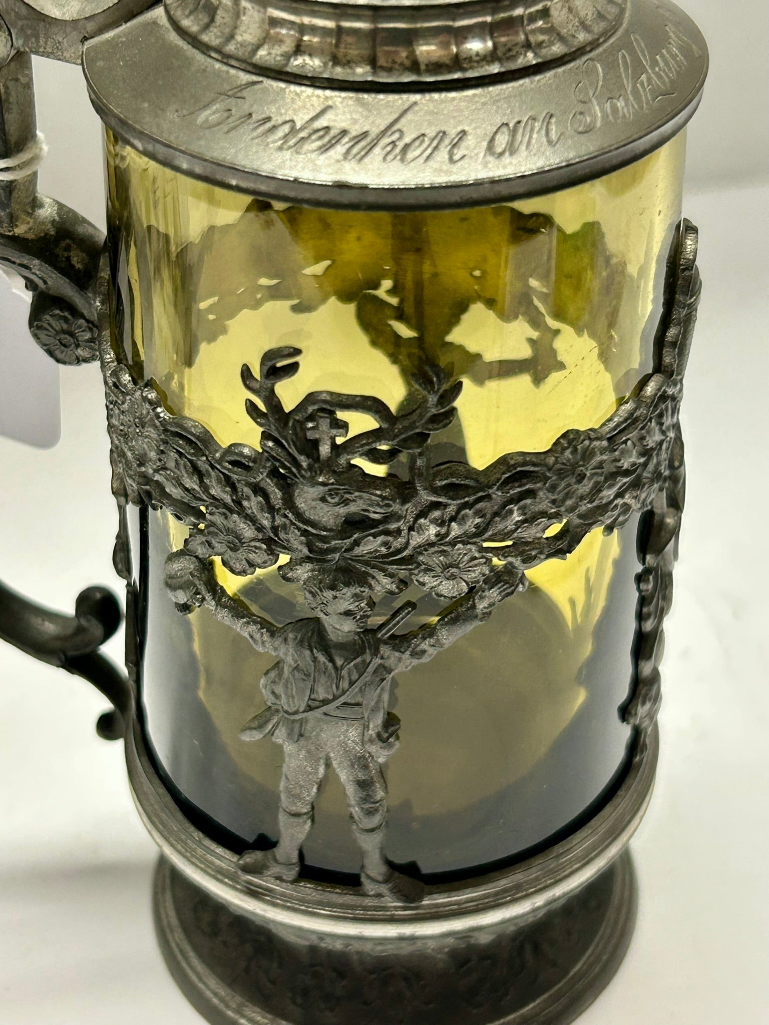 ANTIQUE GREEN GLASS STEIN IN PEWTER MOUNT 9" TALL X 3 1/2" DIAMETER NOT INCLUDING HANDLE. CALL OR TEXT FOR MORE INFORMATION