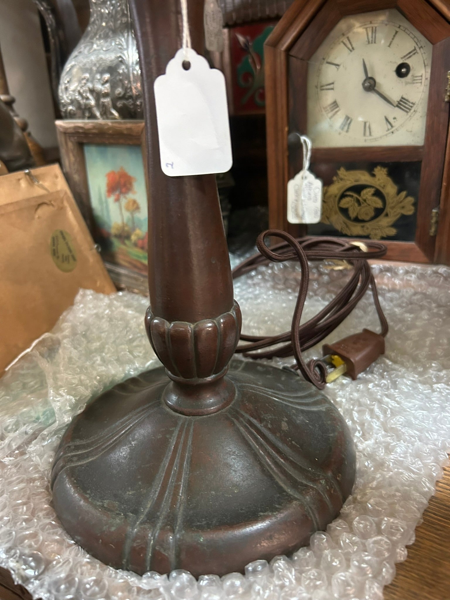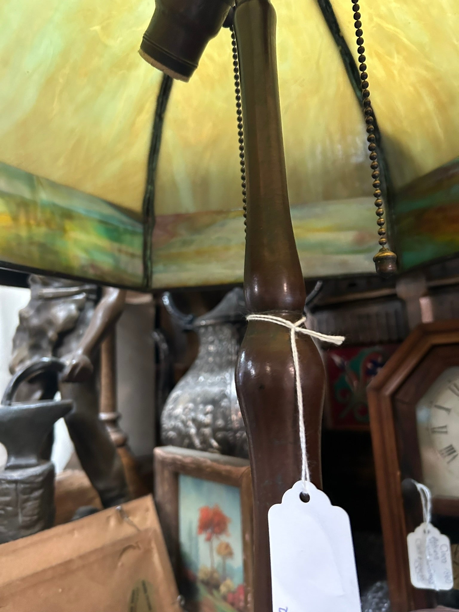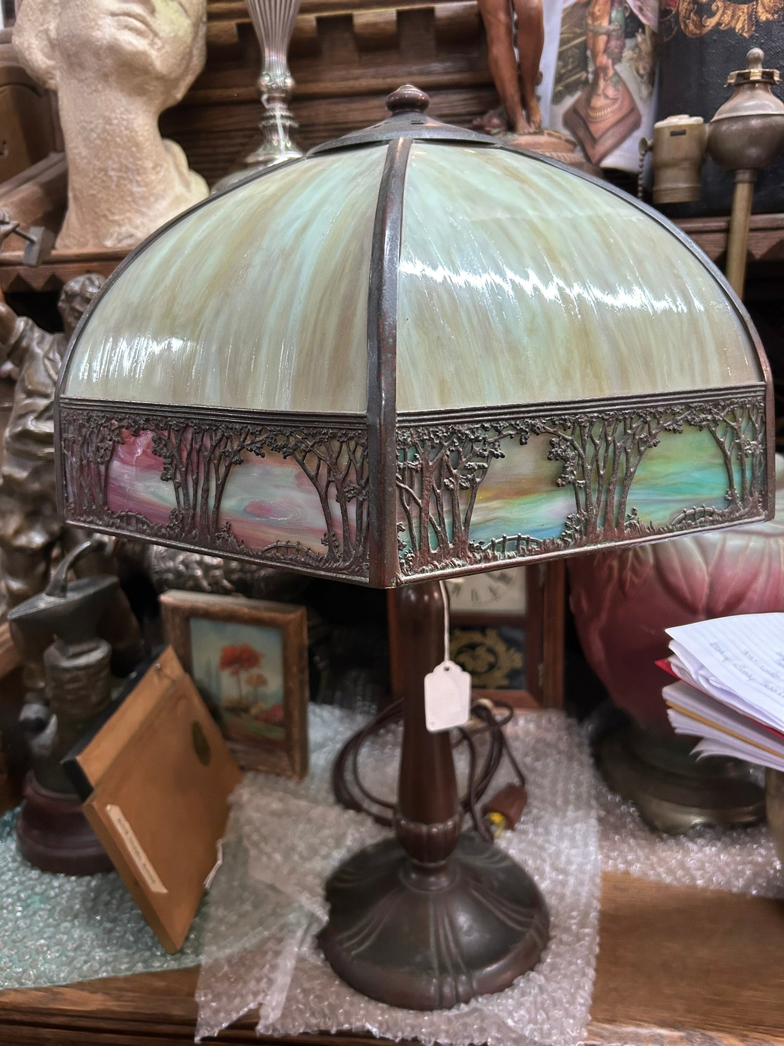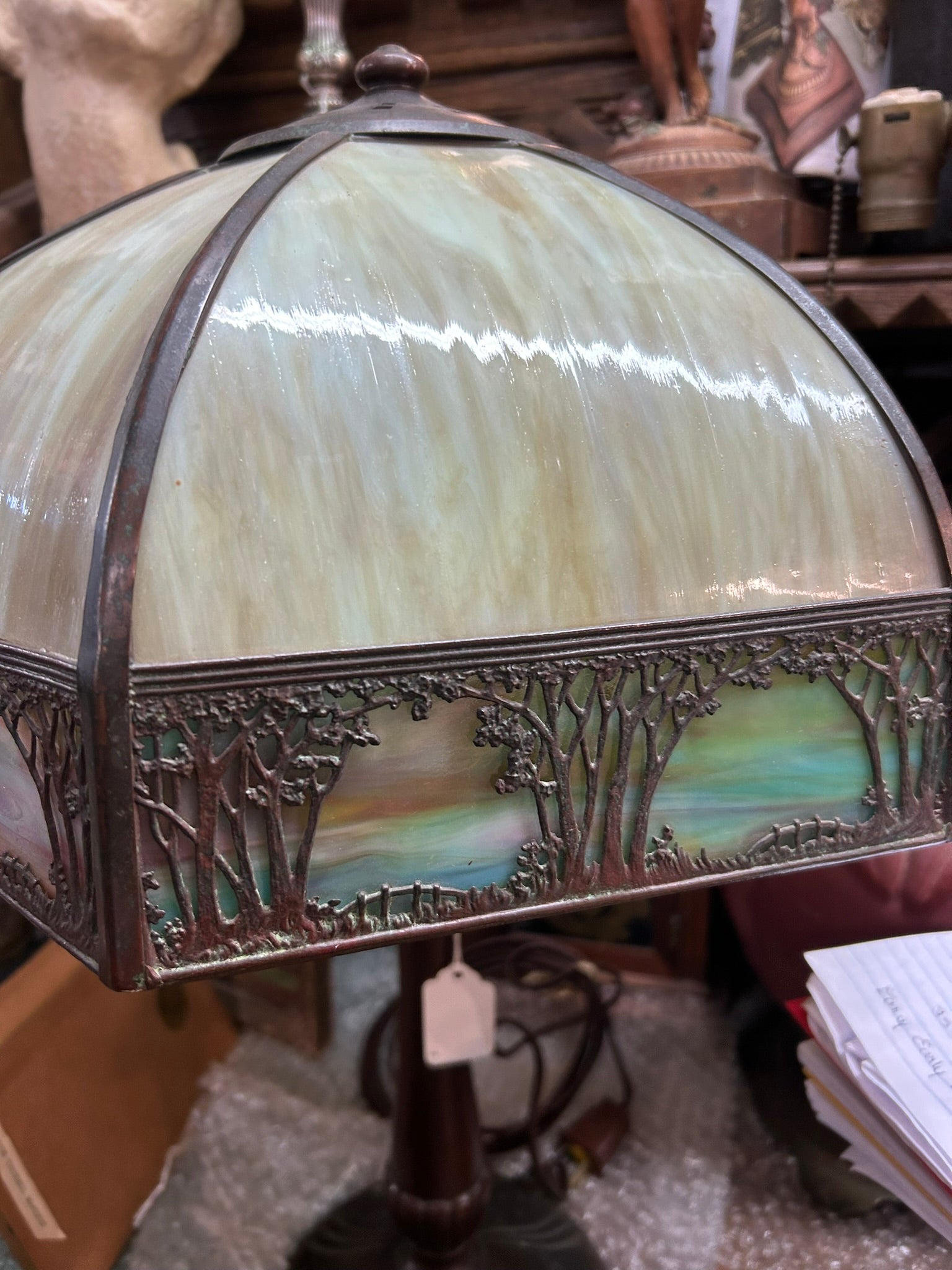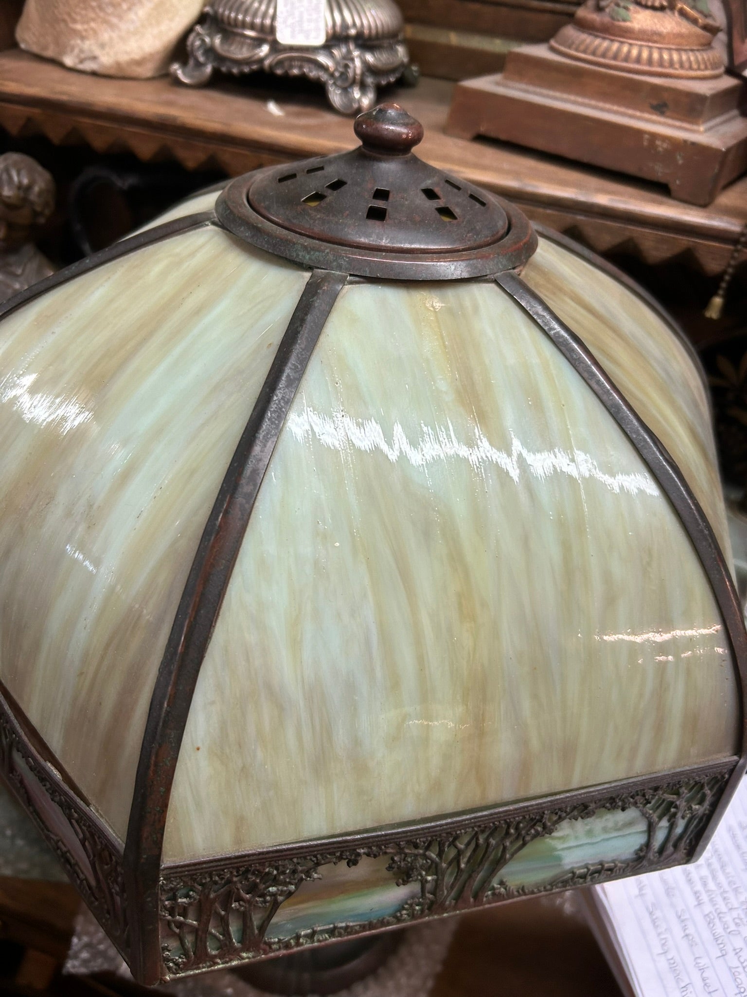 HANDEL SCENIC OVERLAY PANELED SHADE LAMP SIGNED, 19" TALL. CALL OR TEXT FOR MORE INFORMATION