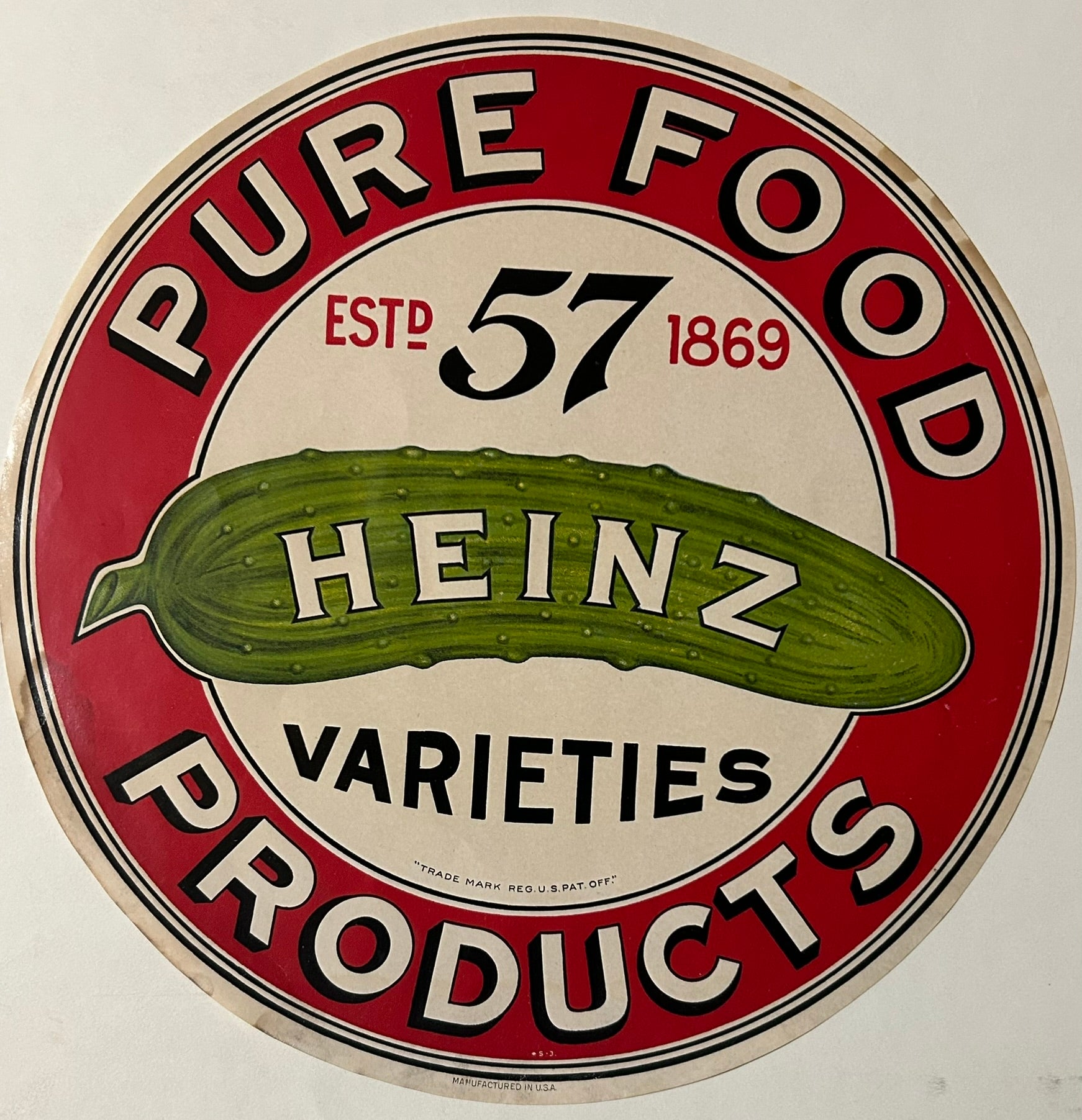 HEINZ 57 VARIETIES ROUND PAPER ADVERTISING SIGN WITH PICKLE ILLUSTRATION 11" DIAMETER. CALL OR TEXT FOR MORE INFORMATION