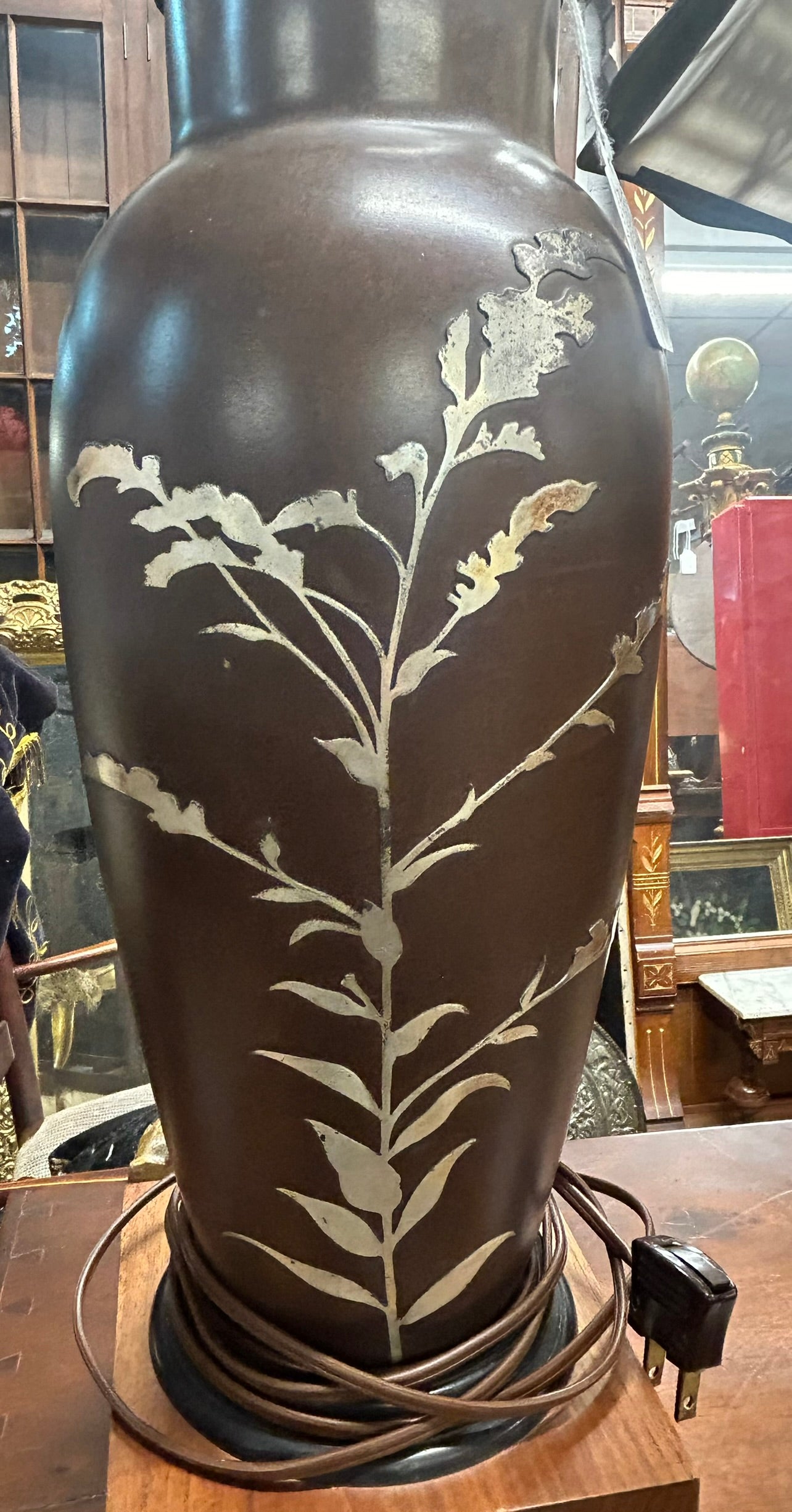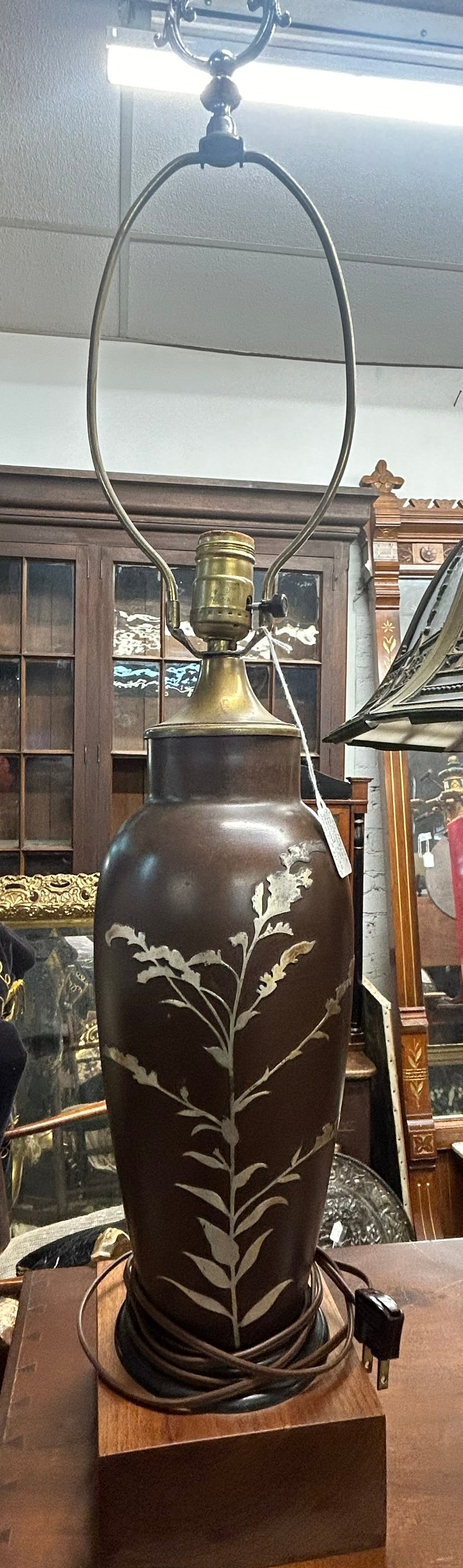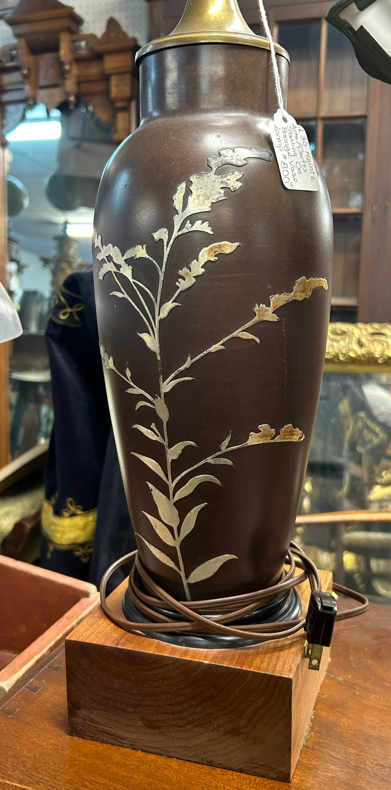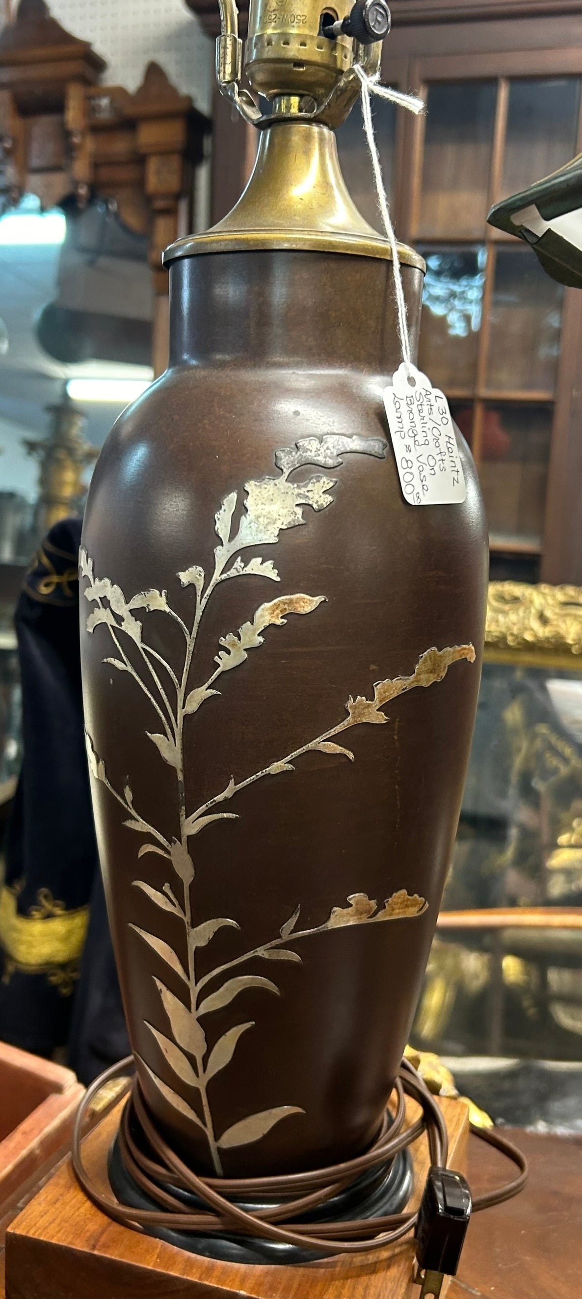 HEINZ ARTS AND CRAFTS STERLING DESIGN ON BRONZE VASE LAMP BASE 15" TALL AND TOTAL HEIGHT TO TOP OF HARP 31" TALL. CALL, TEXT, OR E-MAIL FOR MORE INFORMATION
