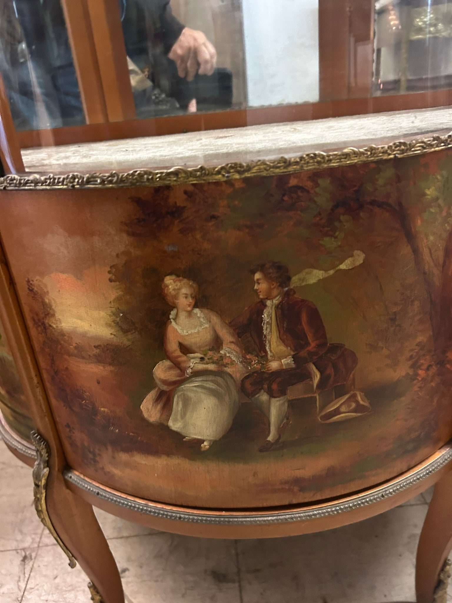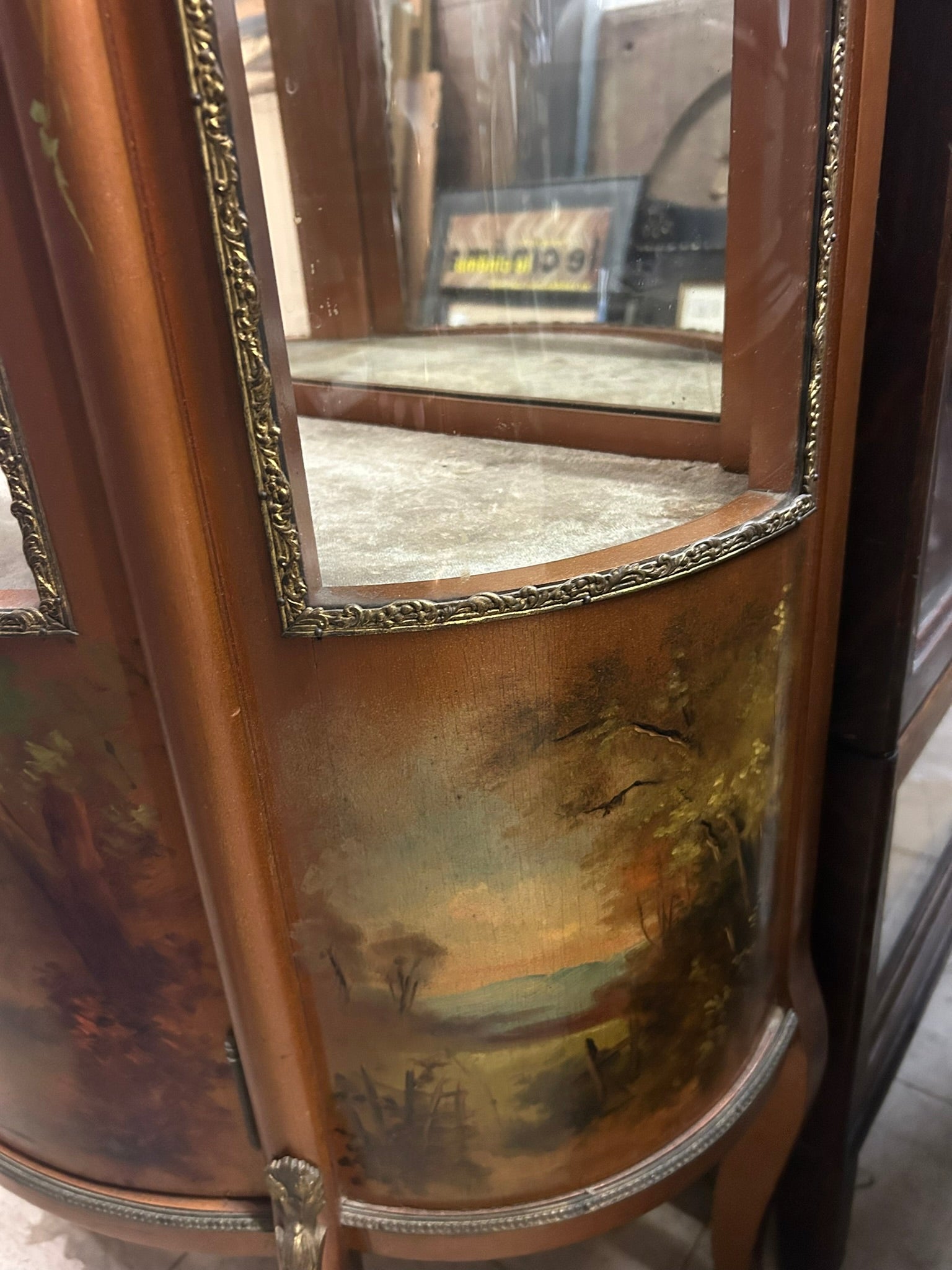HORNER FURNITURE LATE 1800's HAND PAINTED DECORATED CURVED GLASS CURIO CABINET 55" HIGH BY 36" WIDE BY 25" DEEP. CALL, TEXT, OR E-MAIL FOR MORE INFORMATION
