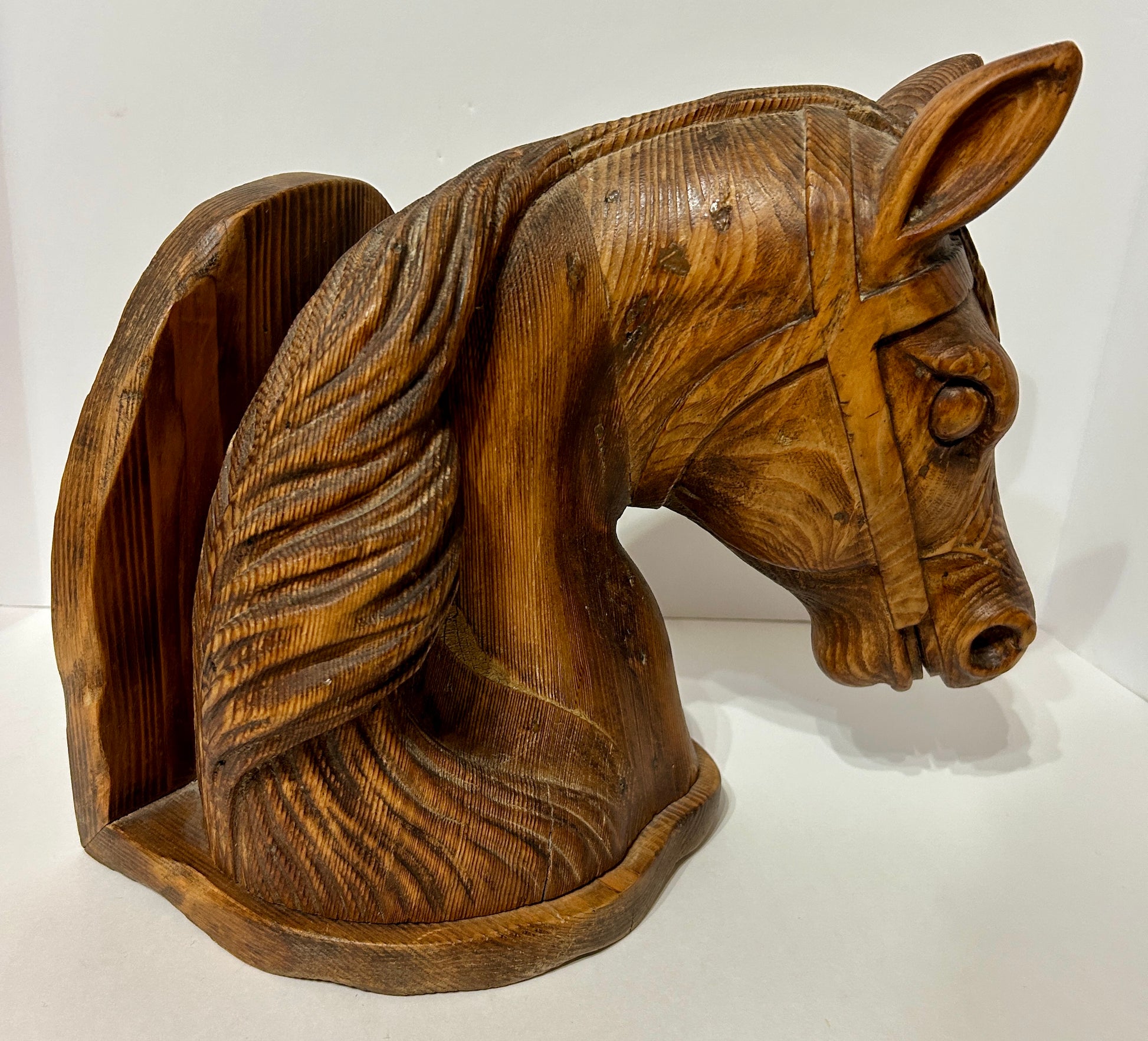 ANTIQUE CARVED WOODEN HORSE HEAD FOR WALL HANGING, HAS STICKER ON BACK FROM FAMOUS EARLY OMAHA ANTIQUE DEALERS DREWS ANTIQUES 12 1/2" TALL X 15" DEEP X 12" WIDE. SHIPPING COSTS ARE EXTRA SO BE SURE TO CALL OR TEXT FOR CHARGE TO SHIP TO YOUR ADDRESS