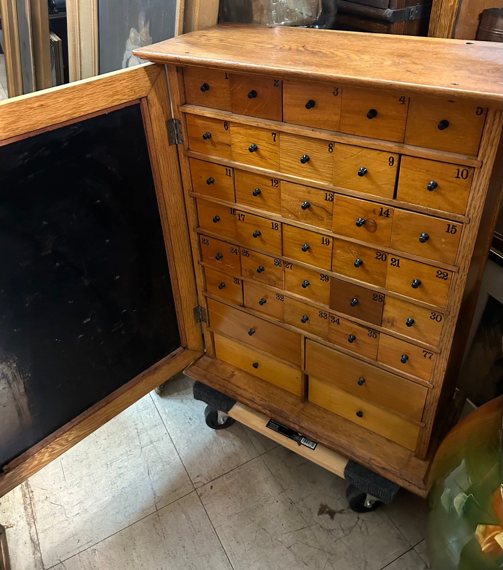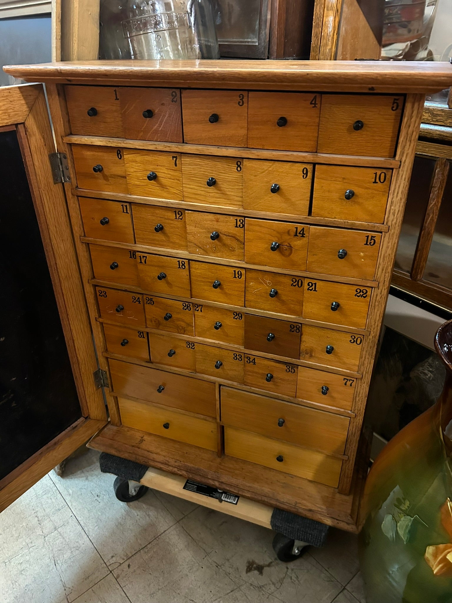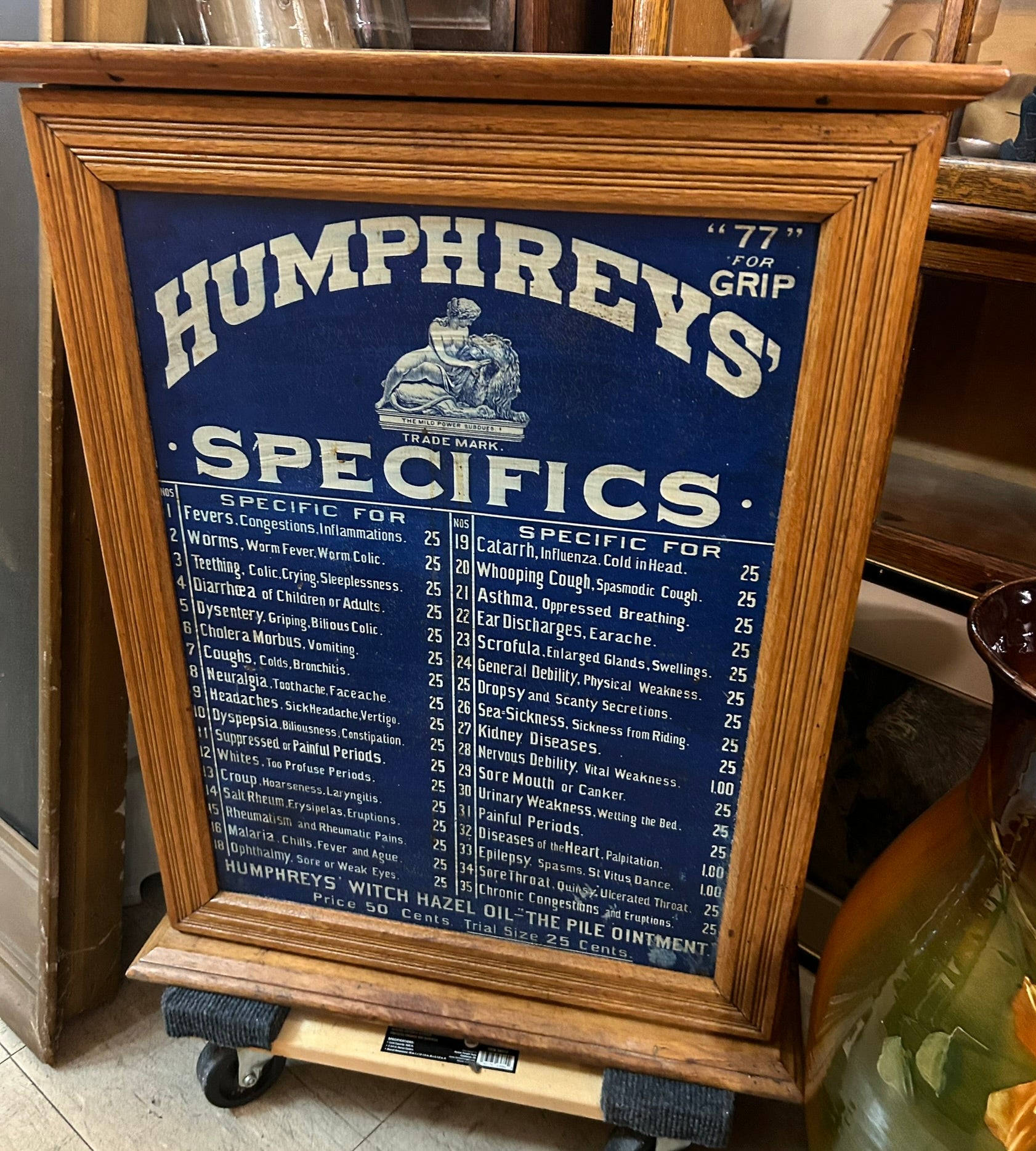 HUMPHREY'S SPECIFICS ANTIQUE CABINET WITH 34 DRAWERS INSIDE AND ADVERTISING TIN DOOR FRONT. CALL, TEXT, OR E-MAIL FOR MORE INFORMATION