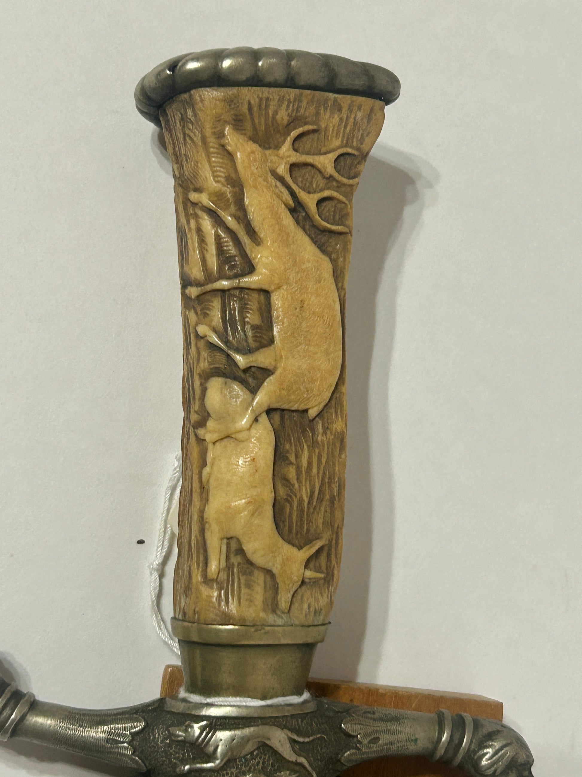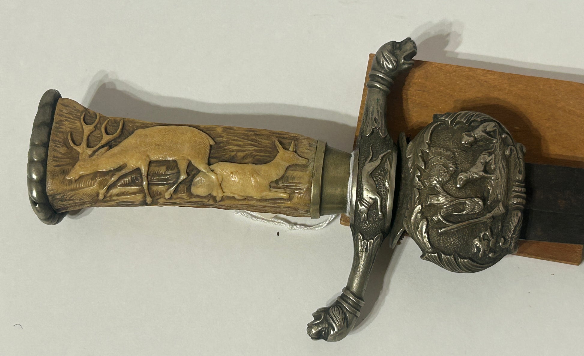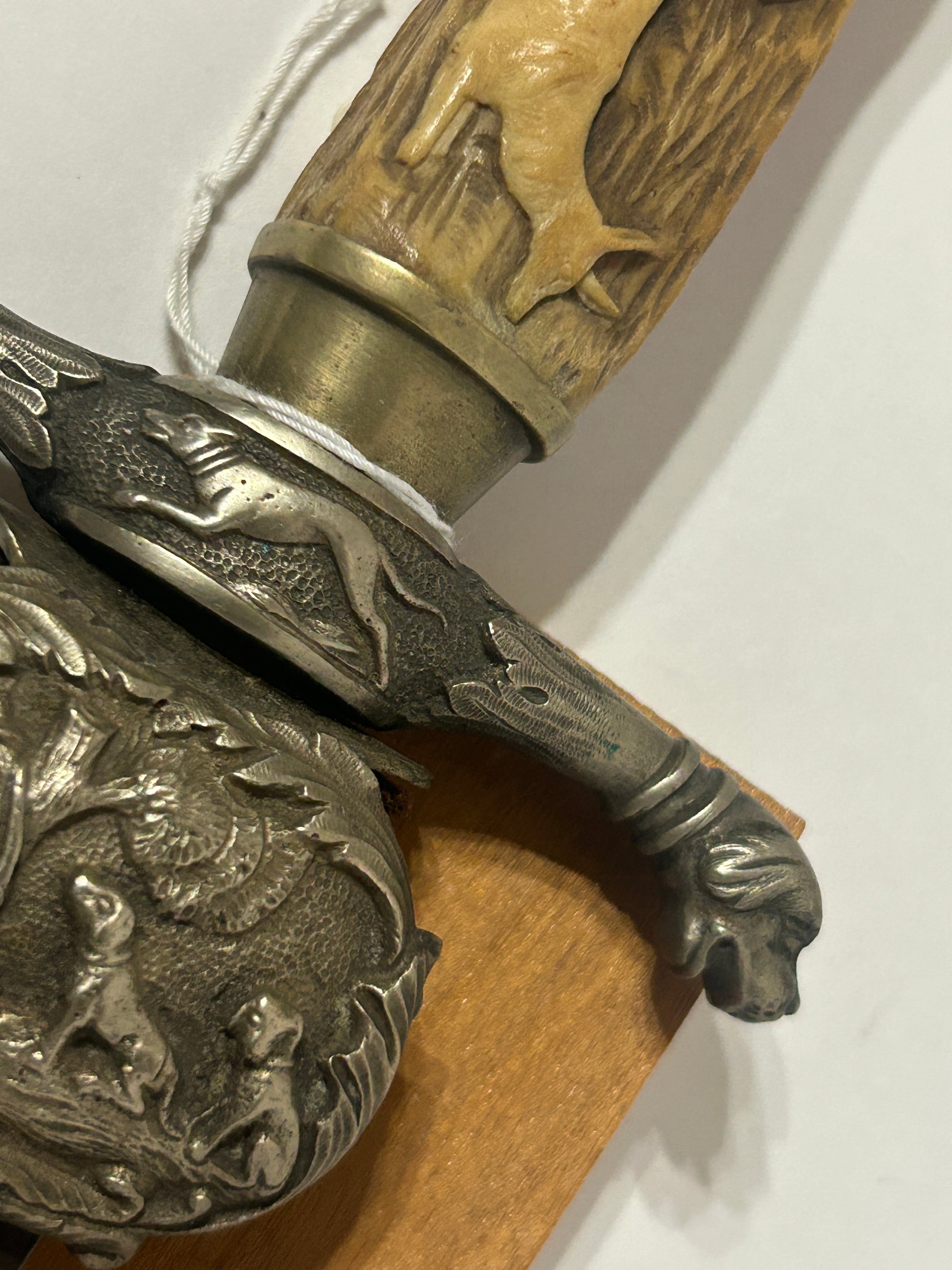 GERMAN LONG HUNTING DAGGER WITH CARVED ANTELOPE OR STAG HANDLE AND FANCY METAL DOG DESIGN 19 1/2" LONG. CALL OR TEXT FOR MORE INFORMATION