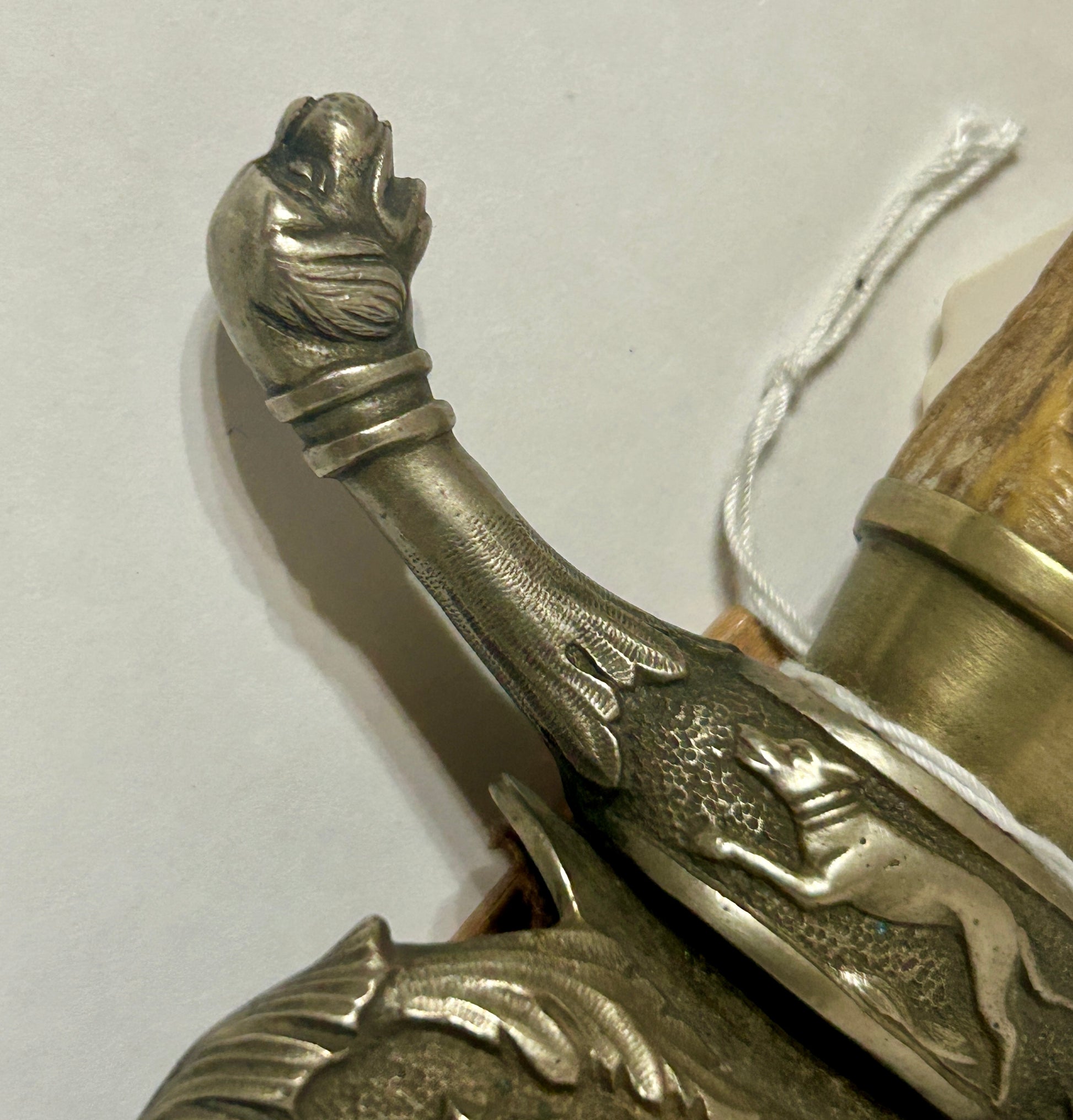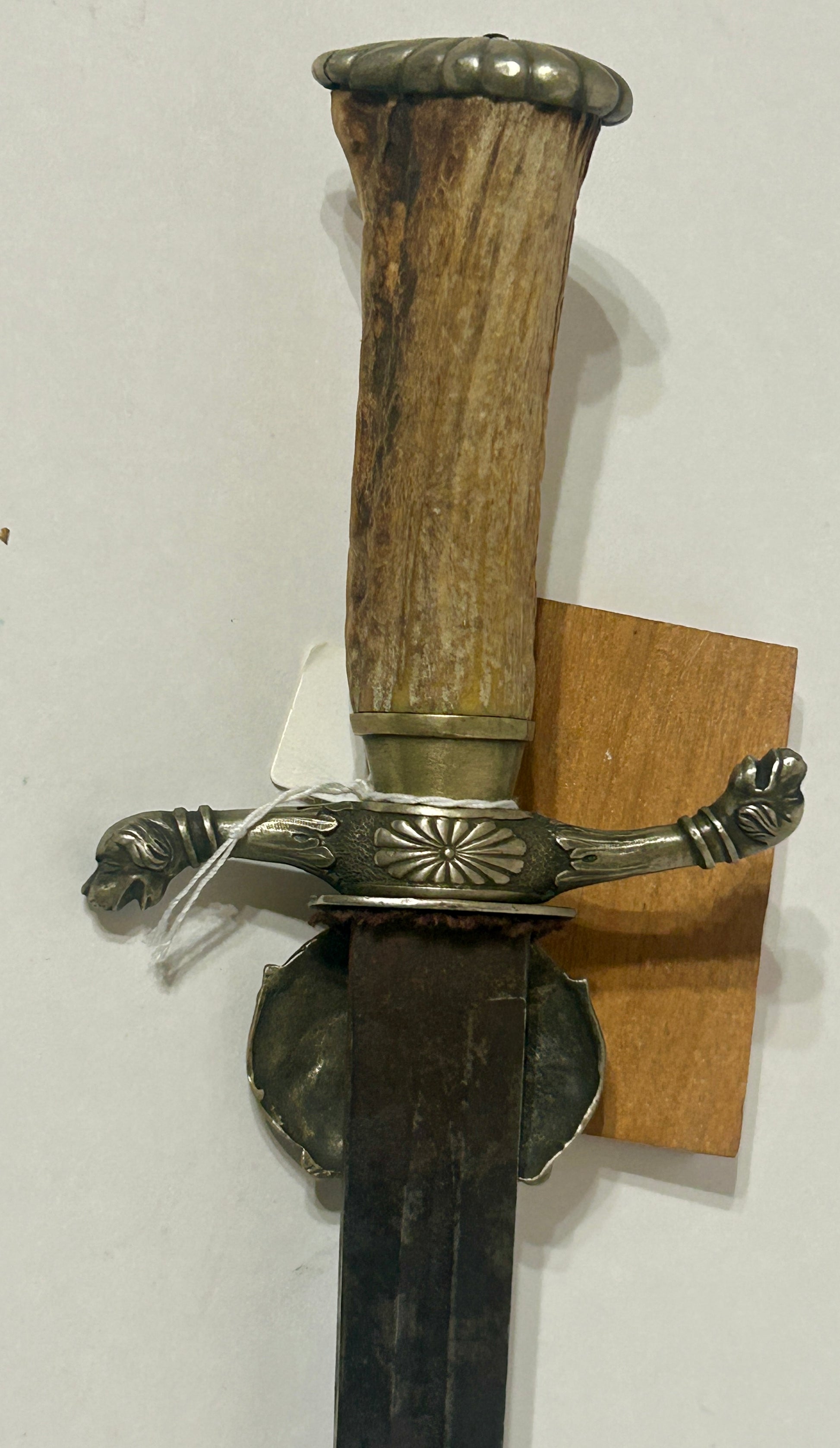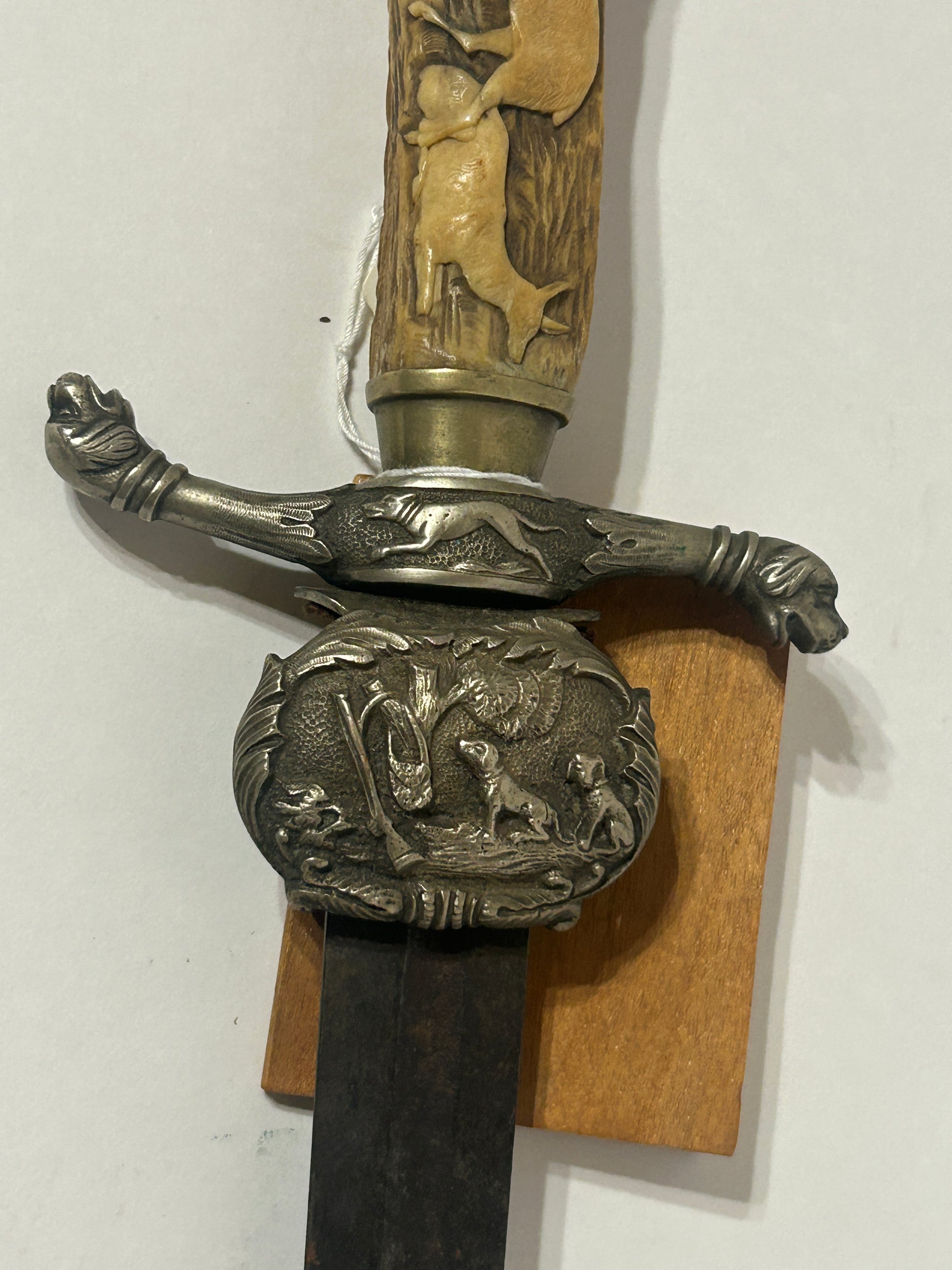 GERMAN LONG HUNTING DAGGER WITH CARVED ANTELOPE OR STAG HANDLE AND FANCY METAL DOG DESIGN 19 1/2" LONG. CALL OR TEXT FOR MORE INFORMATION