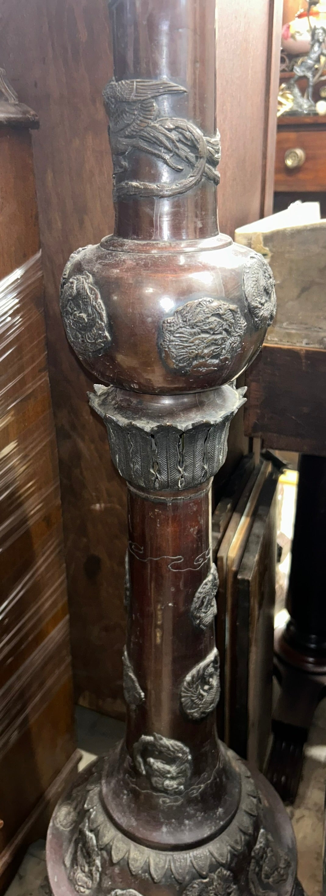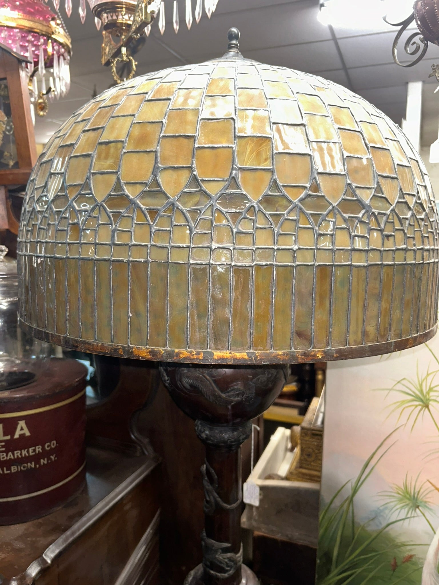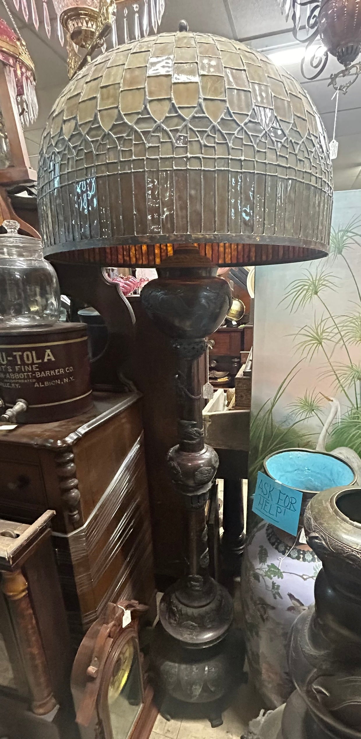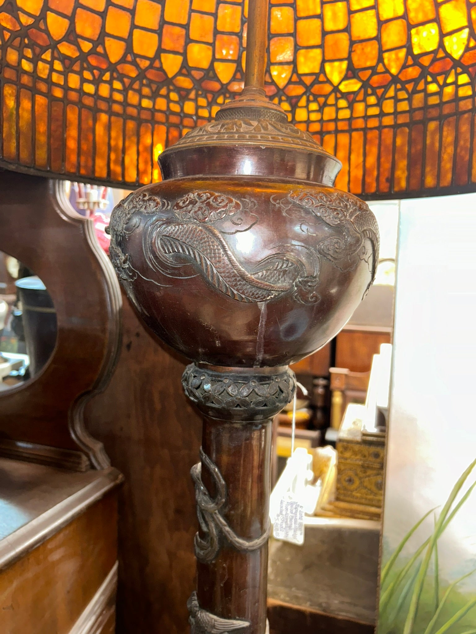 JAPANESE BRONZE MEIJI PERIOD FLOOR LAMP WITH LATER LEADED SHADE, BASE HAS DRAGON DESIGNS, TOTAL HEIGHT IS 68" X 24" DIA. SHADE. CALL, TEXT, OR E-MAIL FOR MORE INFORMATION