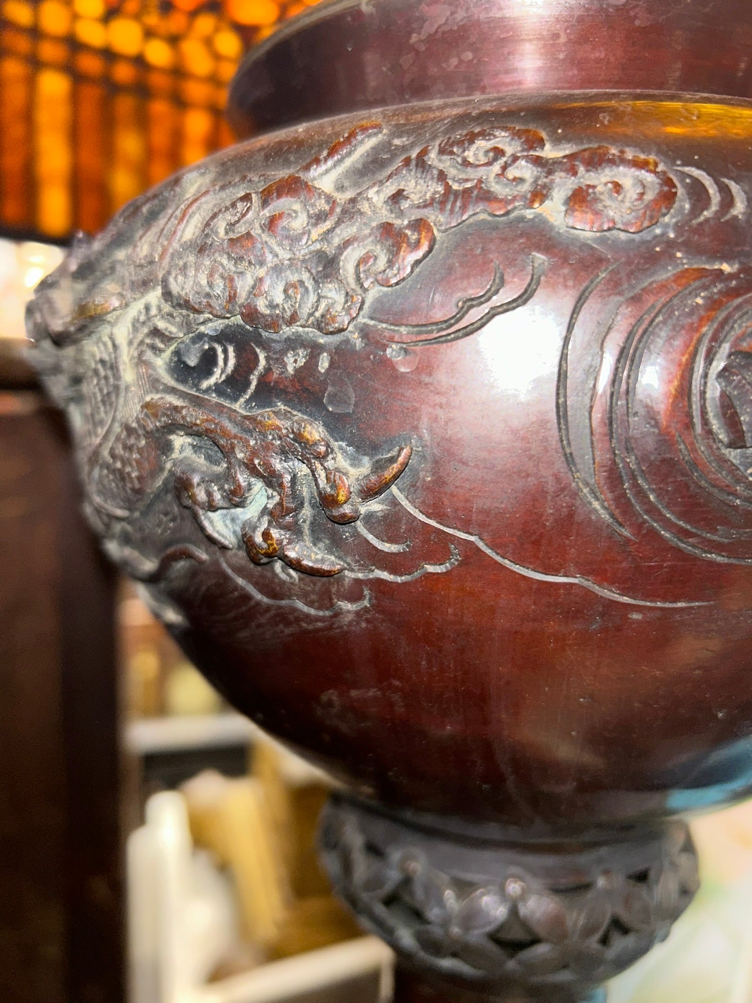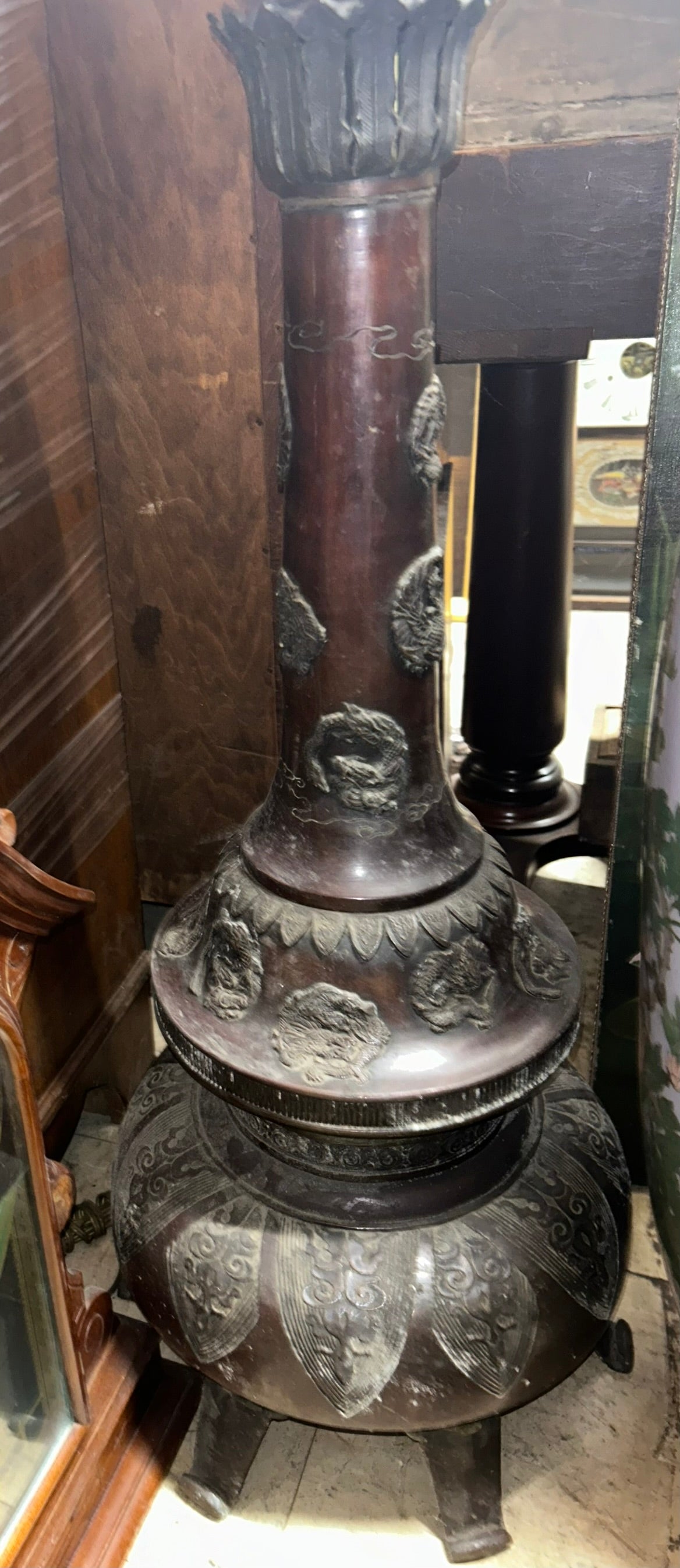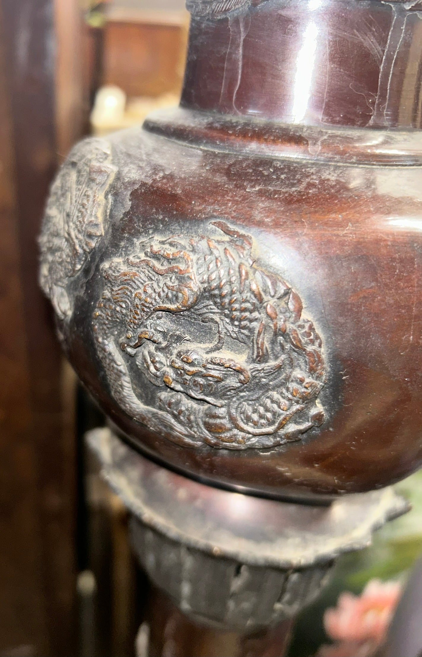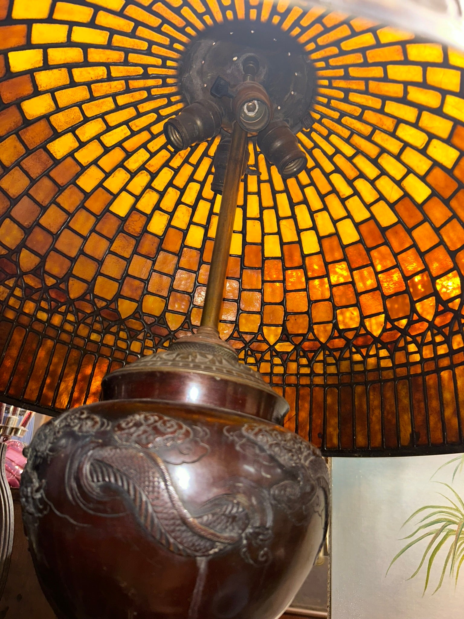 JAPANESE BRONZE MEIJI PERIOD FLOOR LAMP WITH LATER LEADED SHADE, BASE HAS DRAGON DESIGNS, TOTAL HEIGHT IS 68" X 24" DIA. SHADE. CALL, TEXT, OR E-MAIL FOR MORE INFORMATION
