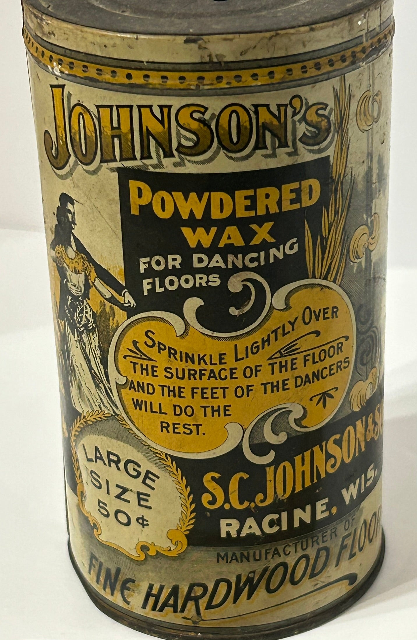 JOHNSON'S POWDERED WAX FOR DANCING FLOORS ANTIQUE ILLUSTRATED TIN 5 1/2" X 3". CALL OR TEXT FOR MORE INFORMATION