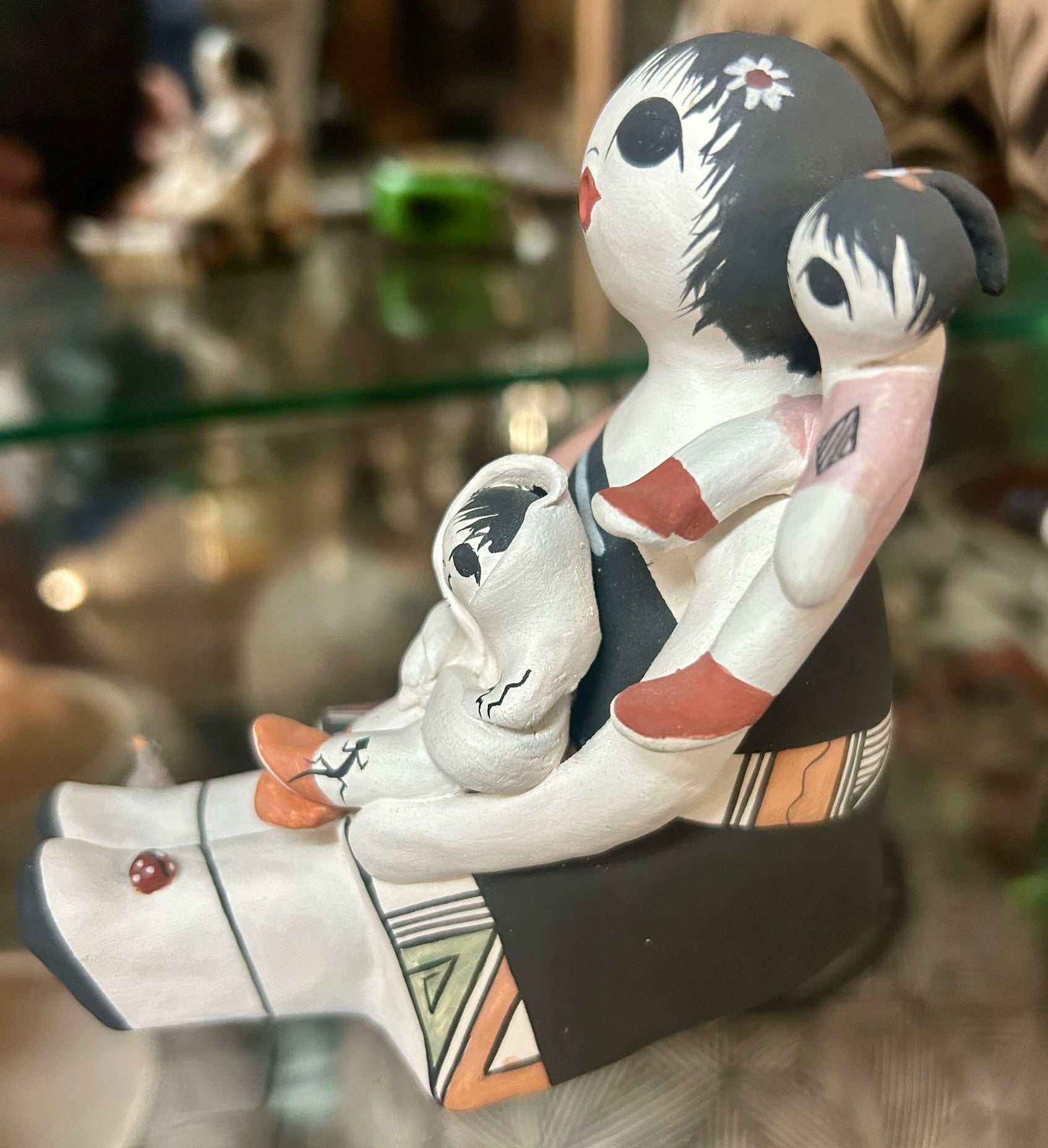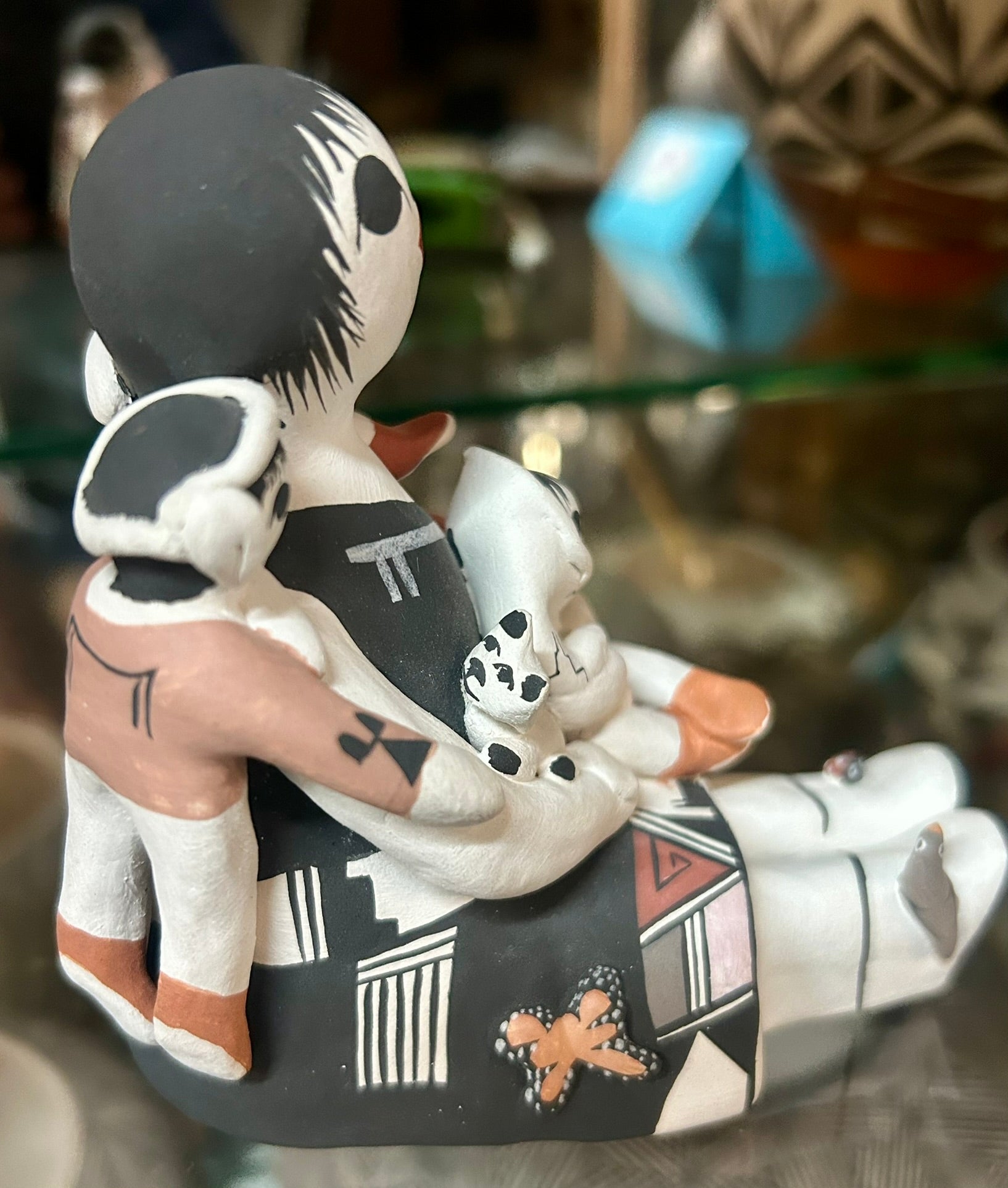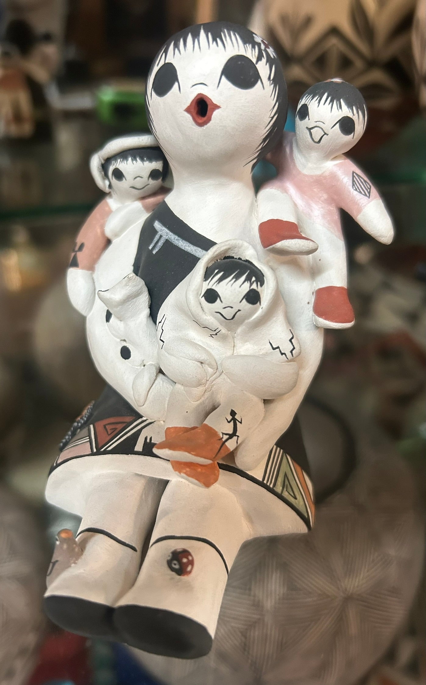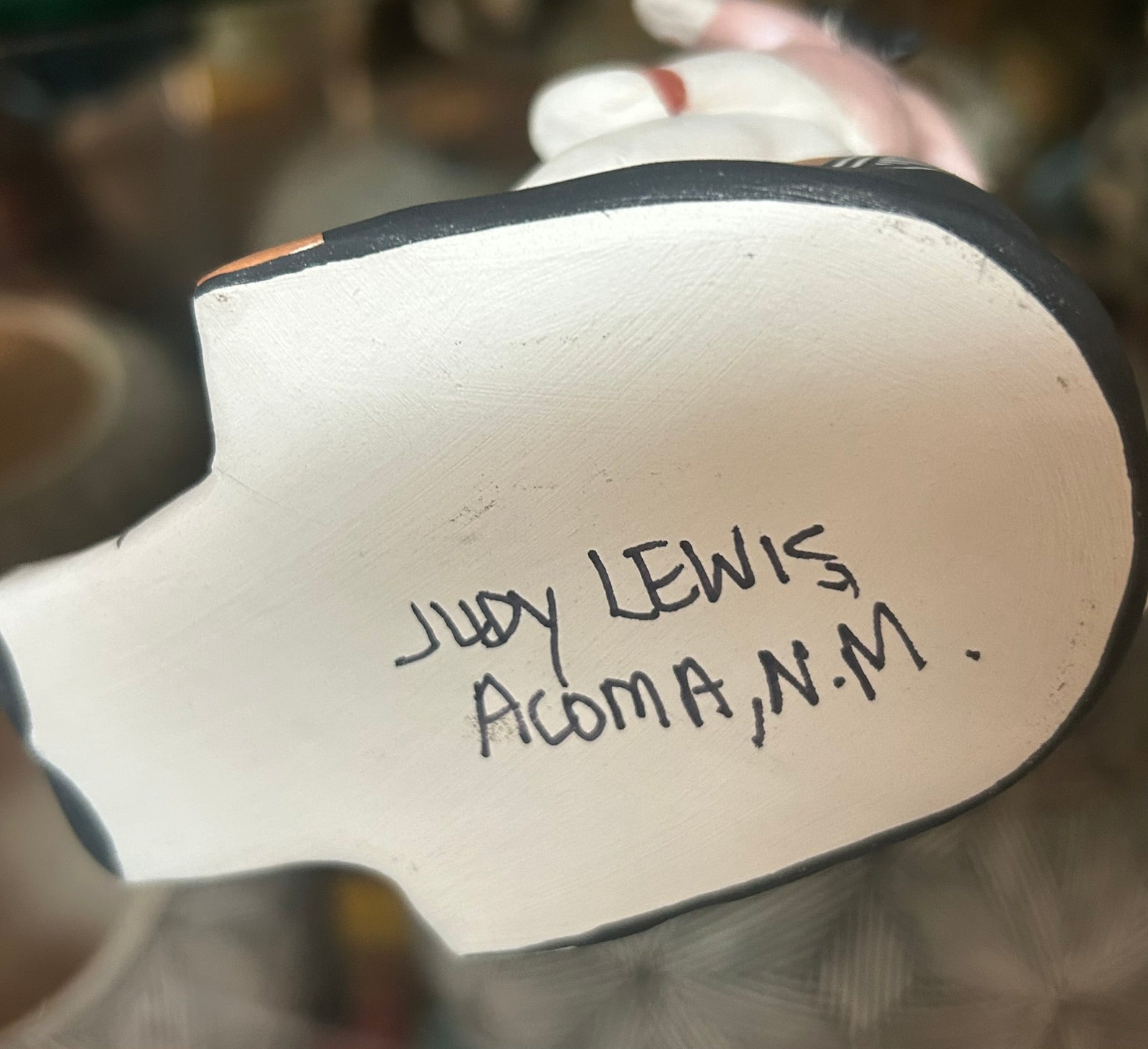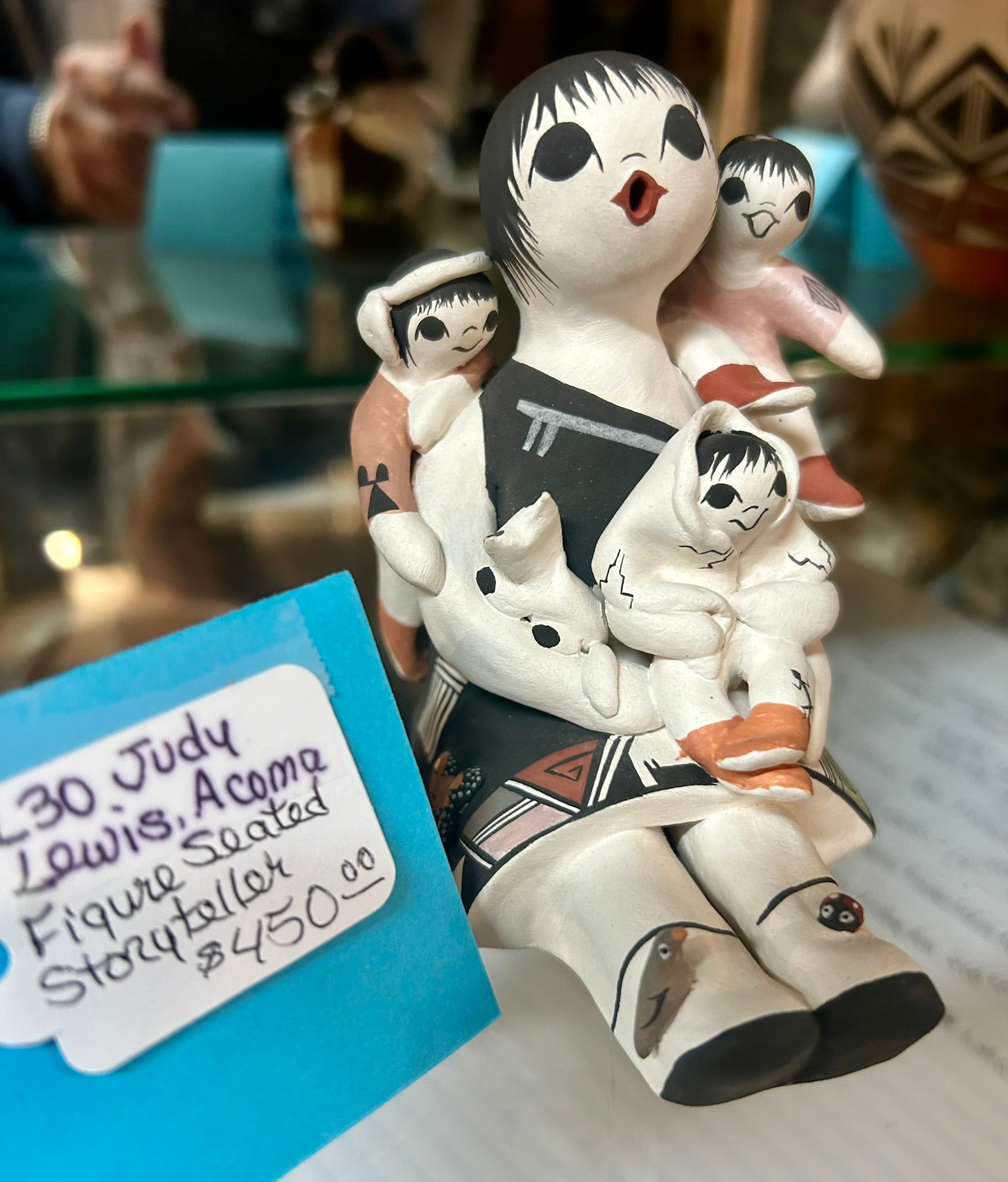 JUDY LEWIS ACOMA POTTERY FIGURE OF SEATED STORY TELLER 3 3/4" TALL. CALL OR TEXT FOR MORE INFORMATION