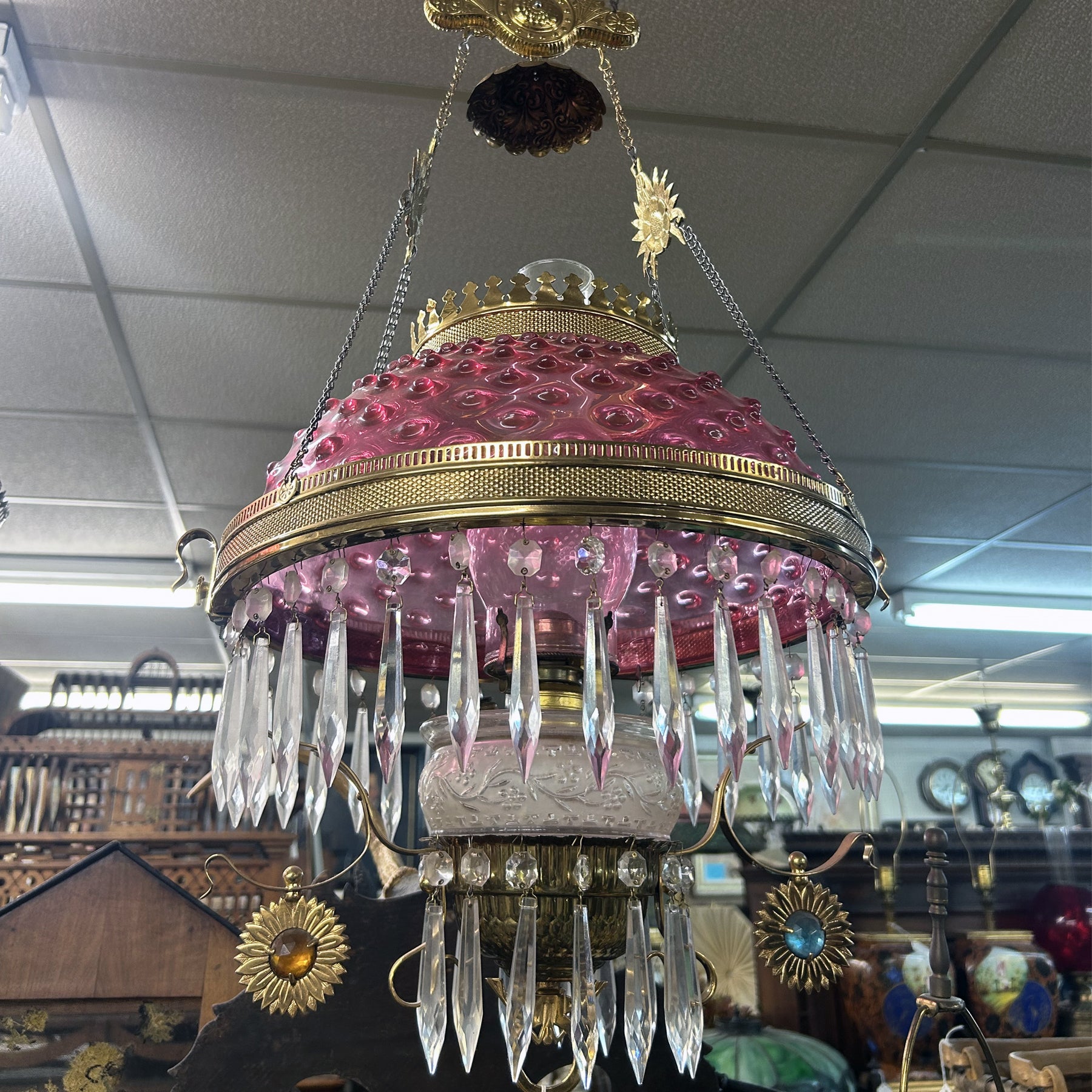 Late 1800's cranberry hobnail hanging library kerosene lamp with with jeweled flower frame.