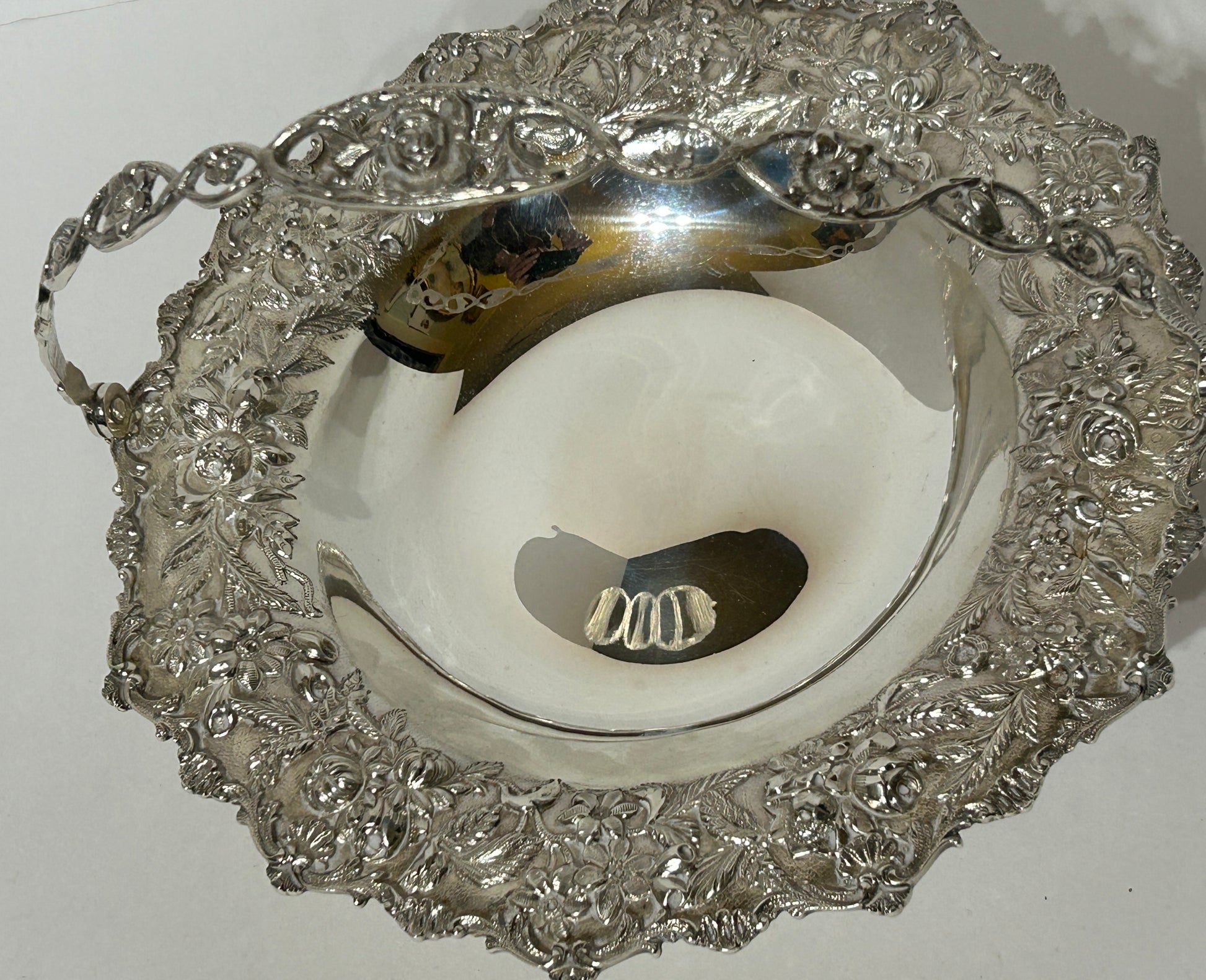 KIRK STERLING ANTIQUE BASKET IN FANCY FLORAL DESIGN