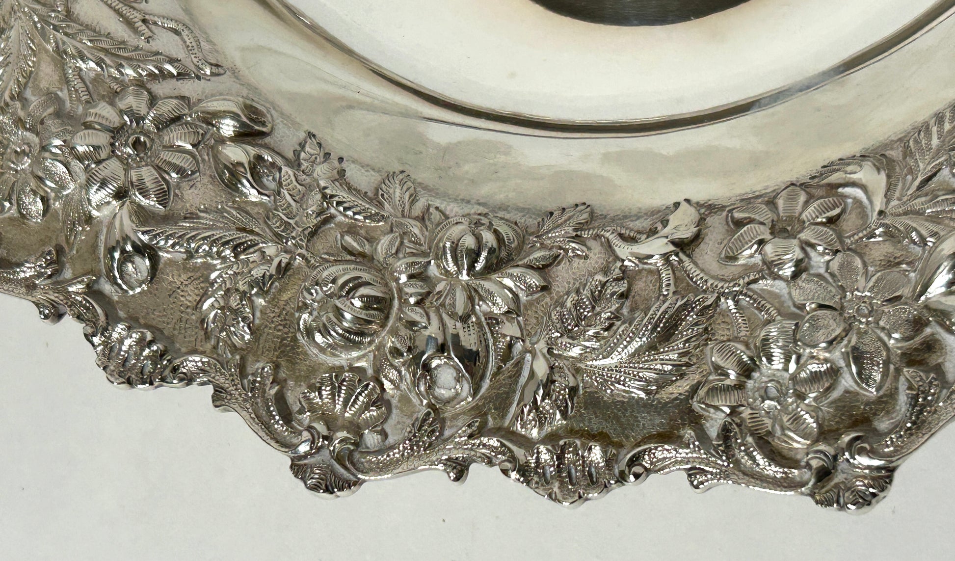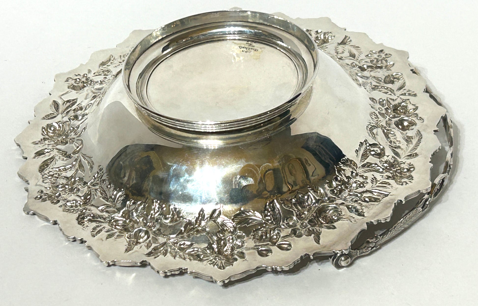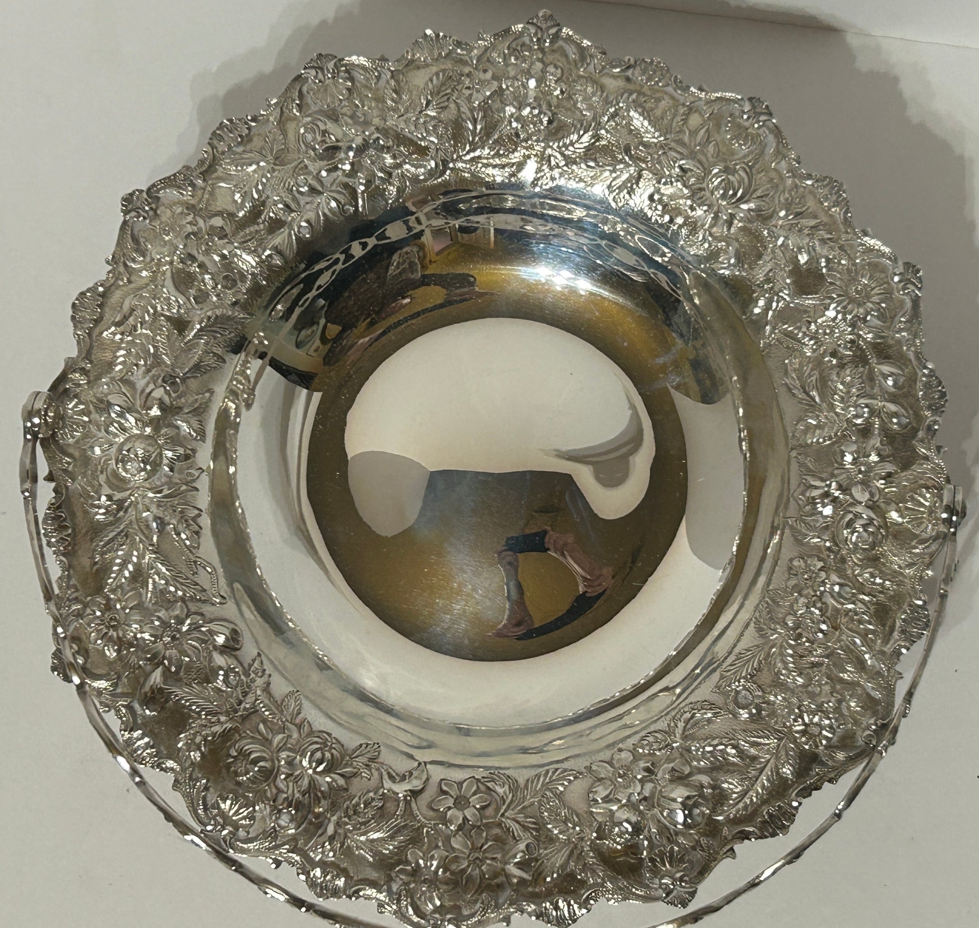 NOTE OUR HEAVIER SILVER ITEMS ARE KEPT IN BANK VAULT. KIRK STERLING FANCY FLORAL DESIGN BASKET 11" DIAMETER X 2 1/2" TALL NOT INCLUDING HANDLE AND WEIGHS 802 GRAMS OR 25.78 TROY OUNZES. SHIPPING IS EXTRA SO CALL OR TEXT TO FIND OUT HOW MUCH SHIPPING WILL COST.