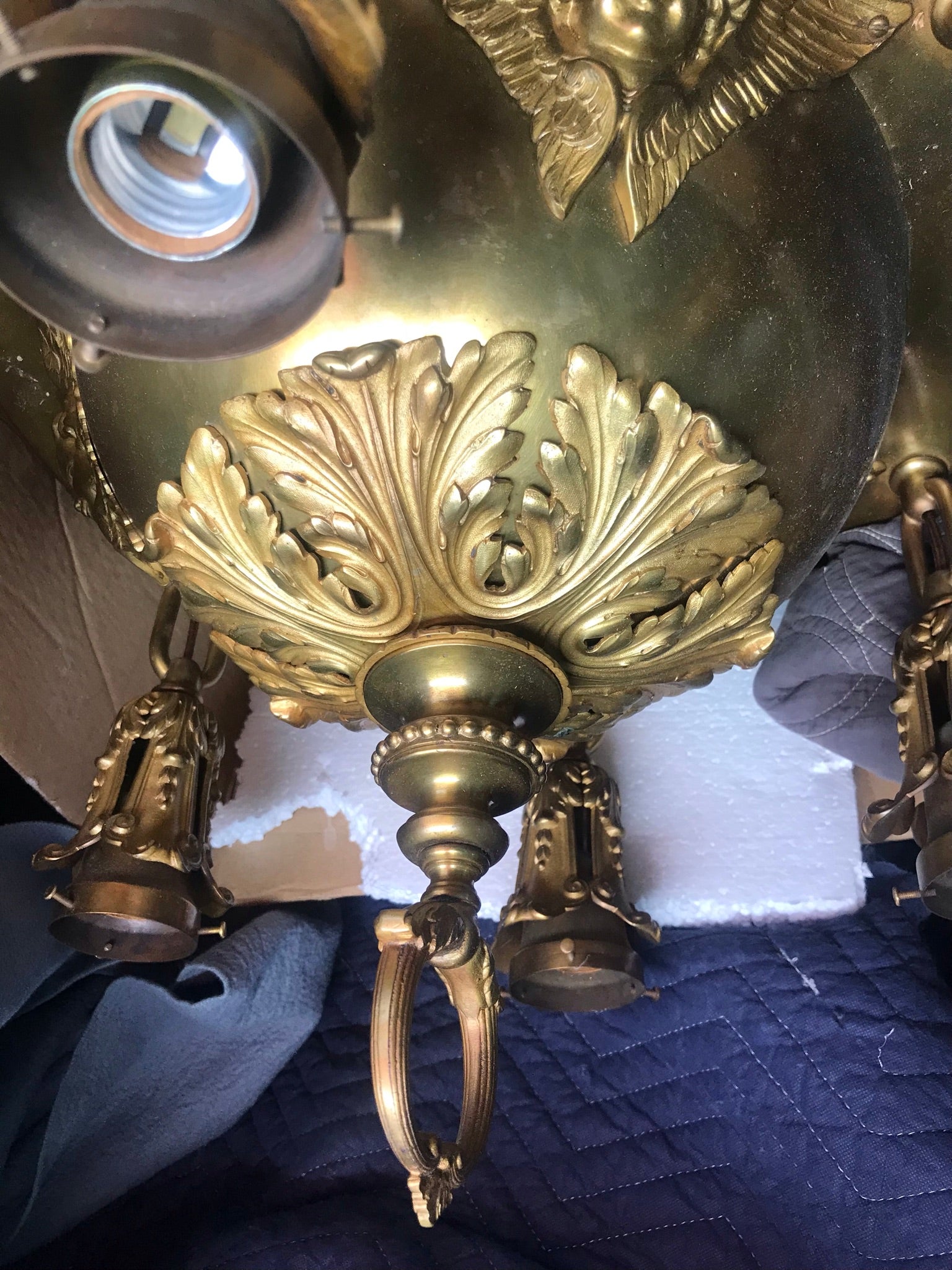 LARGE BRASS HANGING ANTIQUE LIGHT FIXTURE WITH CHERUB HEADS