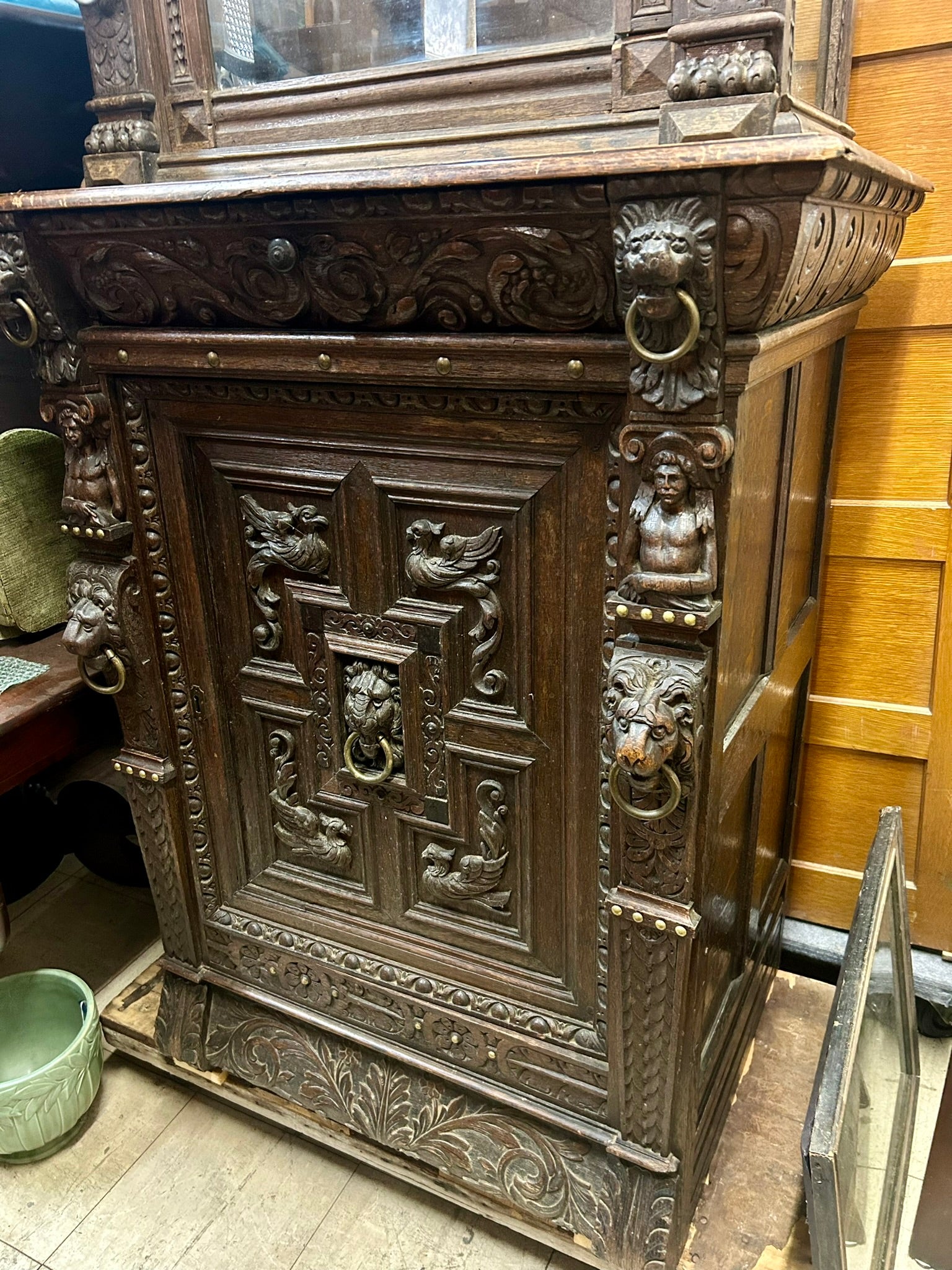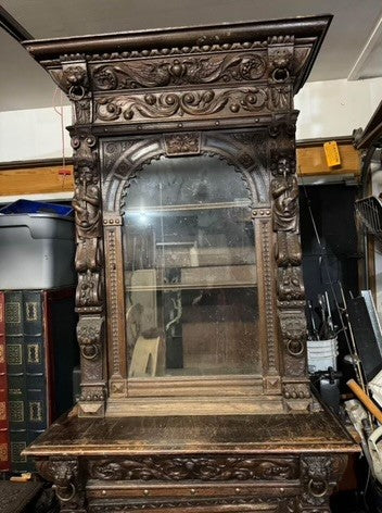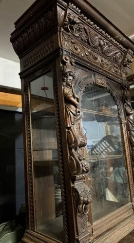 LATE 1800's HEAVILY CARVED GOTHIC DESIGN DARK OAK CABINET 94" TALL X 36" WIDE BY BOTTOM 25" DEEP, TOP AND BOTTOM IN TWO SECTIONS. CALL, TEXT, OR E-MAIL FOR MORE INFORMATION