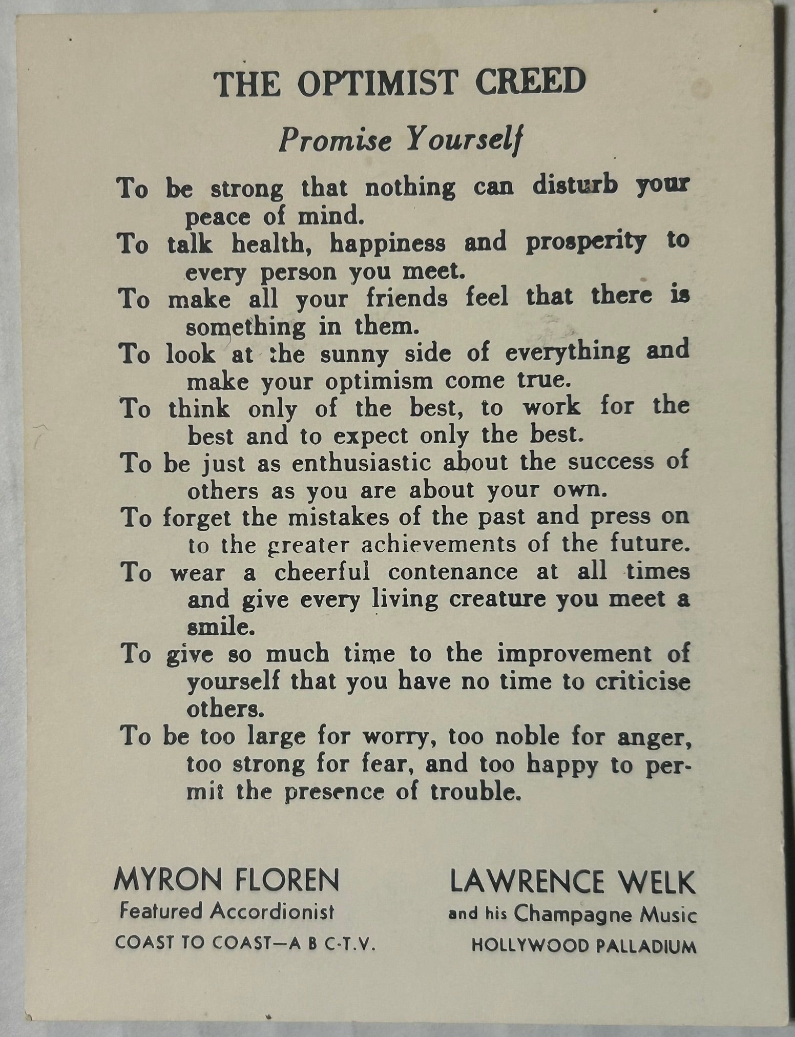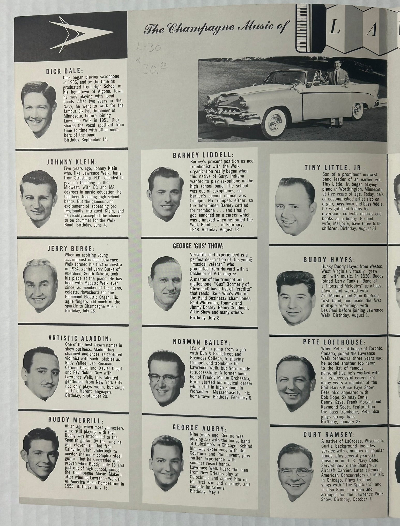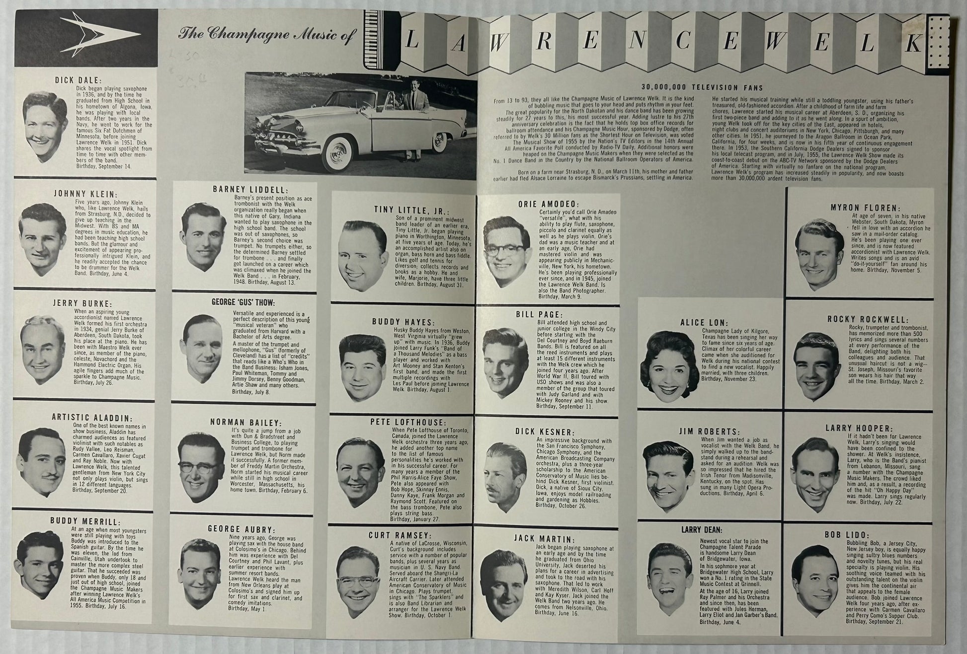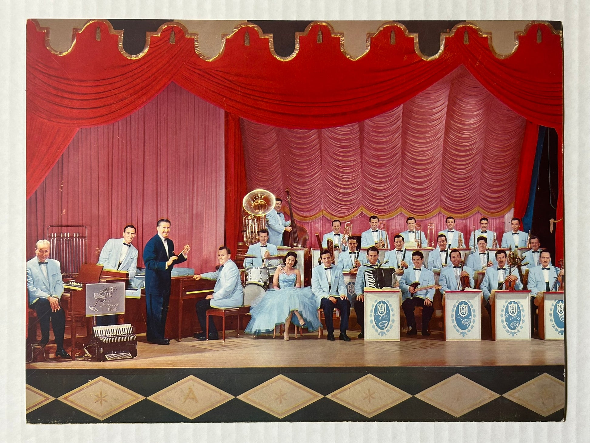 LAWRENCE WELK EARLY PROGRAM 12" X 9" SHOWING ORCHESTRA MEMBERS ALONG WITH AUTOGRAPHED SMALL PHOTO OF MYRON FLOREN. CALL OR TEXT FOR MORE INFORMATION