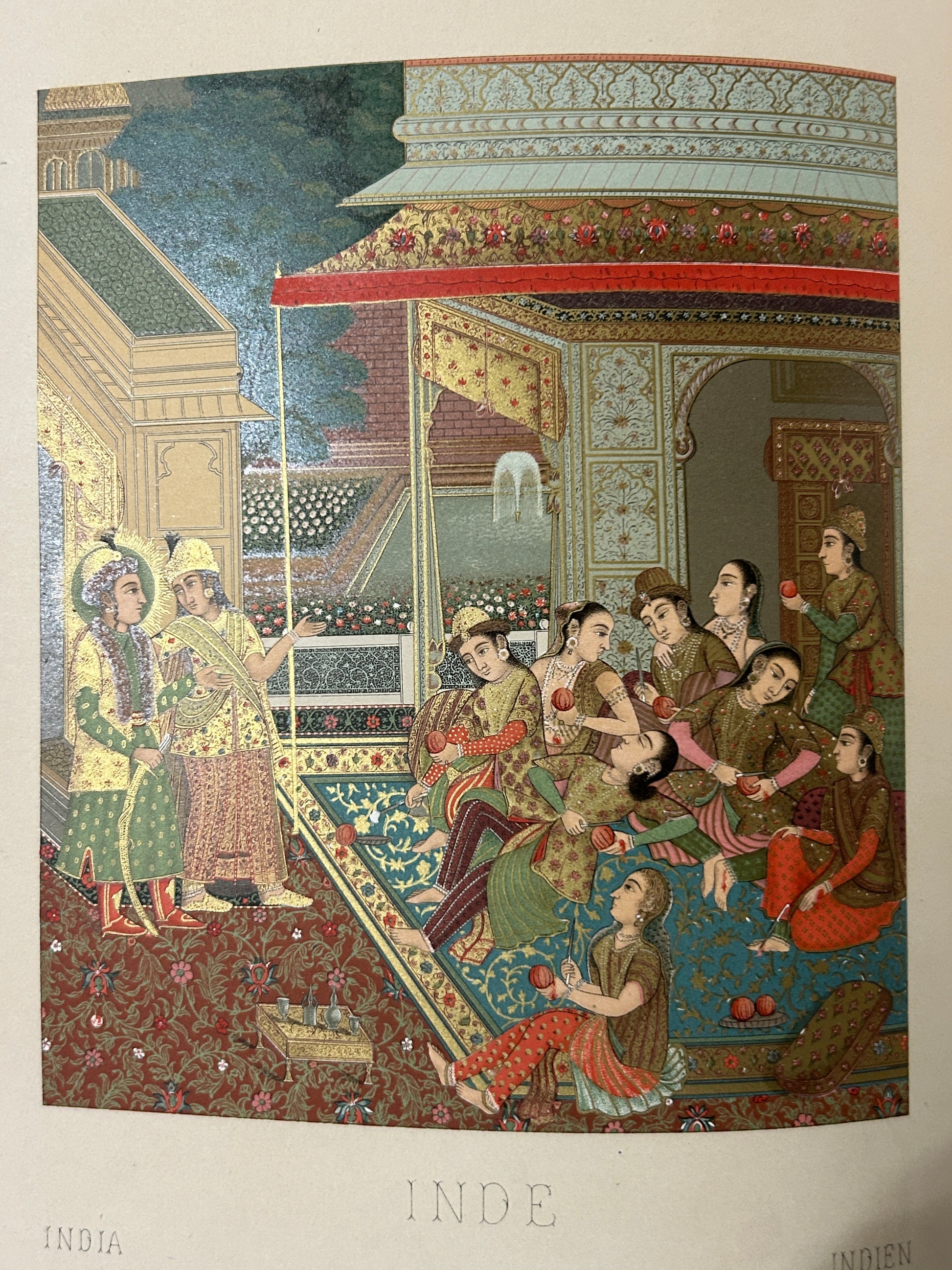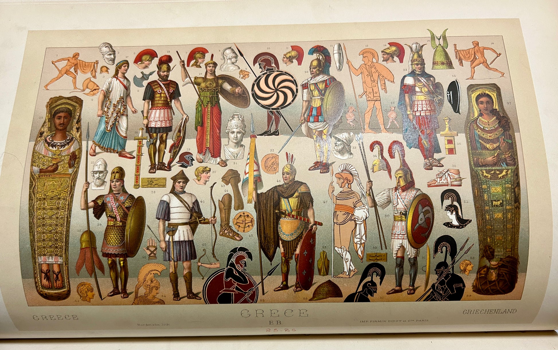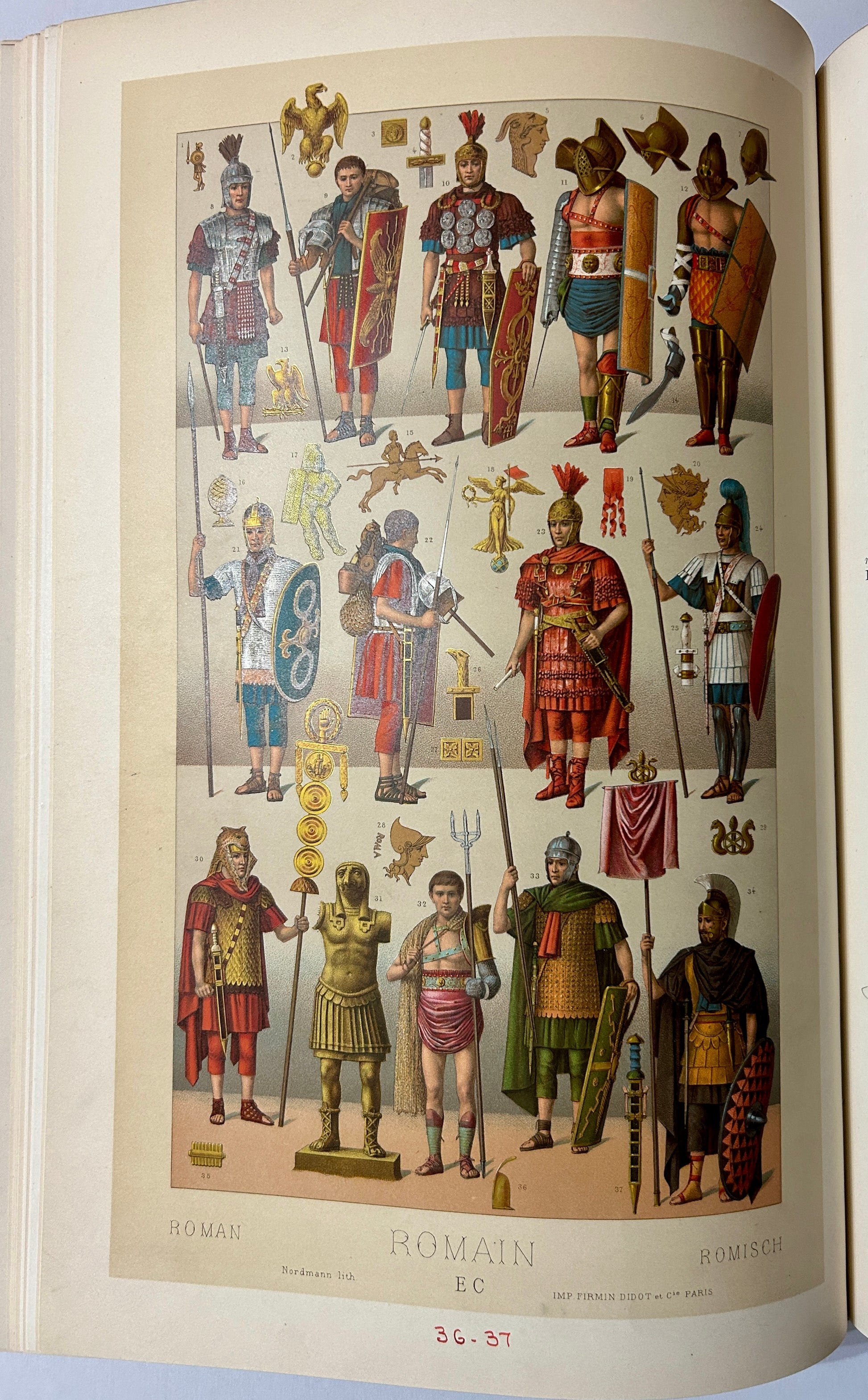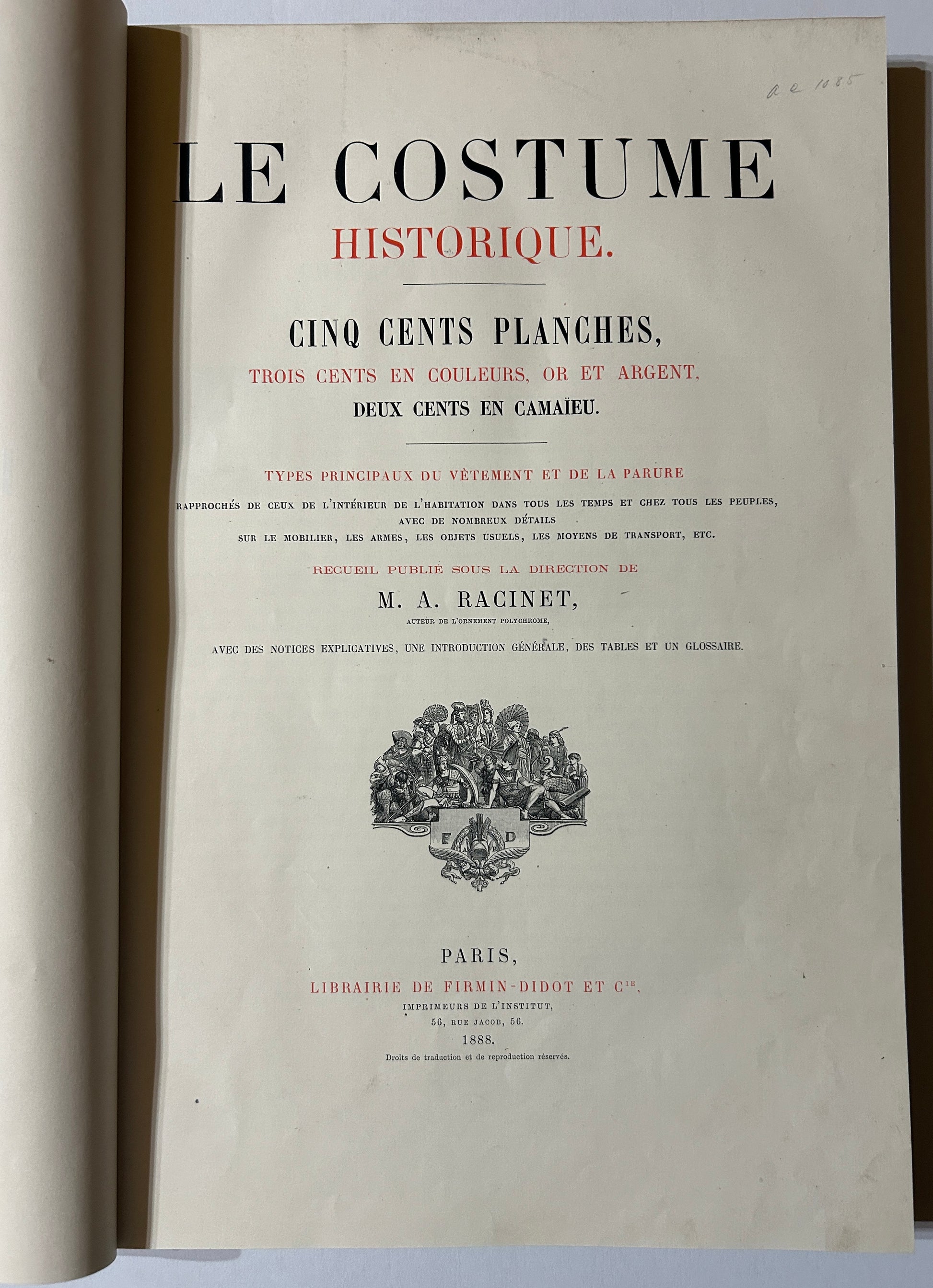 LE COSTUME HISTORIQUE BY M. A. RACINET RARE LARGE FOLIO SET "GRANDE EDITION" 1888 PARIS SIX VOLUME SET OF 300 CHROMOLITHOGRAPHS AND 200 "CAMAIEU" MONOCHROME PLATES. VOLUMES ARE 16" X 10 3/4" AND THESE VOLUMES WERE REBOUND BY OMAHA PUBLIC LIBRARY, NOTE ONE VOLUME HAS NAME WRITTEN ON COVER. CALL OR TEXT FOR MORE INFORMATION