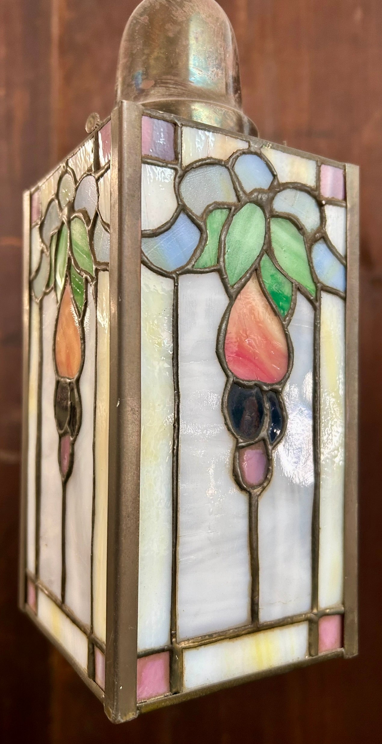 LEADED GLASS SMALL SQUARE HANGING ANTIQUE LAMP