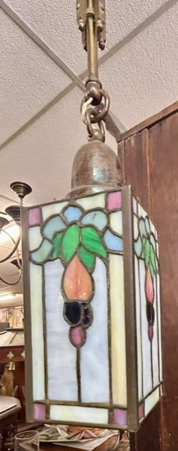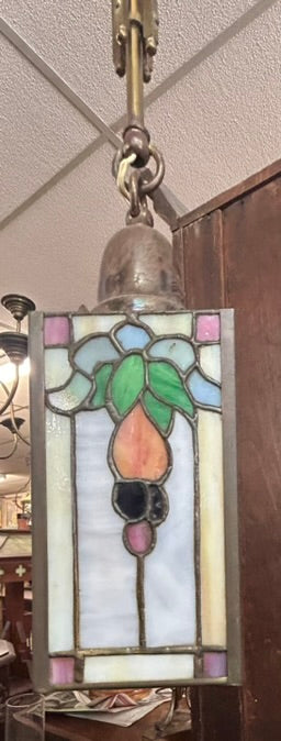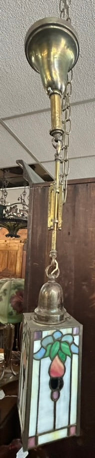 LEADED GLASS ANTIQUE SMALL SQUARE HANGING LAMP WITH 3 1/2" SQUARE SHADE X 6 1/2" TALL-TOTAL OVERALL LAMP HEIGHT IS 29". CALL OR TEXT FOR MORE INFORMATION